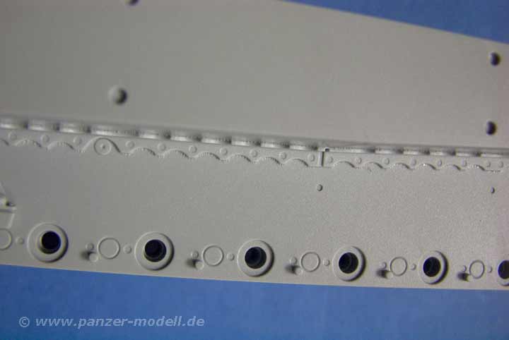 Die Laufrollen sind sehr detailiert dargestellt und zeigen auf den Gummibandagen sogar der Herstellernamen. Allerdings wurde dieser (vermutlich aus Markenrechtlichen Gründen) als "CONTINENTAU" aufgeprägt. Der gewitzte Modellbauer kratzt dann aber mit dem Skalpell einfach den rechten Schenkel des "U" weg und hat die korrekte Prägung.