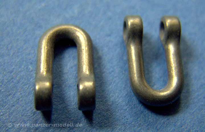 Die Ketten sind vom korrekten Typ mit links und rechts unterschiedlichen Gliedern und sind bereits vorgeschnitten und in Tüten verpackt, wie man es bereits von einigen 251er Bausätzen kennt. Einziges Manko hier sind je zwei Auswerferstellen auf der Innenseite von jedem Glied. Ärgerlich aber glücklicherweise kann man diese per Skalpell einfach abtrennen, da sie erhaben sind. Ein lästige aber machbare Arbeit. Die Ketten lassen sich sehr einfach zusammenstecken und verarbeiten und es liegen zwei Montagehilfen bei, um die richtige Biegung um leit und Treibrad zu gestalten, ohne die Kette auf das Laufwerk aufbringen zu müssen
