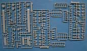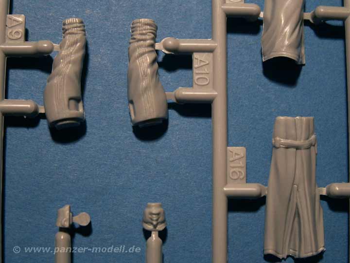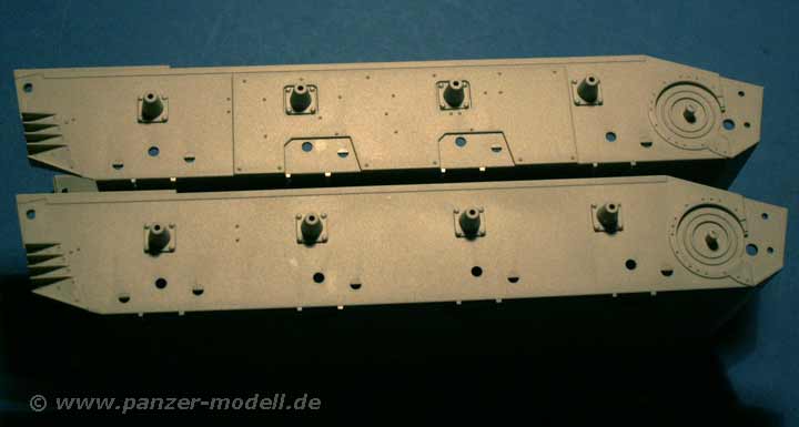 Die Qualität der samt und sonders neugestalteten Teile ist exzellent und von bislang kaum gesehenem Detailreichtum. Schön die Auswahl an zwei Unterwannen, einmal mit und einmal ohne Zusatzpanzerung an der Seite. Die Detailierung ist sogar auf der Unterseite extremst fein detailiert mit Nieten, usw. Das Laufwerk besteht aus beweglichen Aufhängungen für die Laufrollen. Die Laufrollen haben einzeln aufsteckbare Gummierungen, was die Bemalung extrem vereinfacht. Die Laufrollen weisen einen CONTINENTAU Schriftzug auf, wie man ihn vom Tiger I bereits kennt. Hier muss man sich aber kaum die Mühe machen das U in ein L umzubasteln, da der Schriftzug nur schwach erkennbar ist.