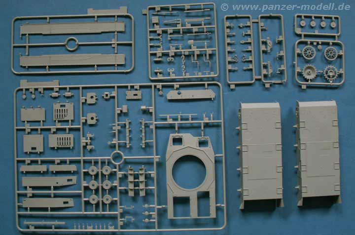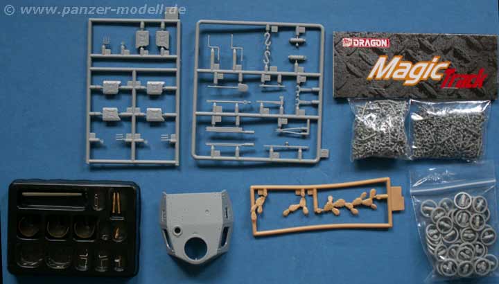 Der Bausatz besteht aus über 1000 Teilen an 18 Spritzlingen plus 2 Wannen, einen Turm, Magic Tracks (also Einzelkettenglieder bereits vorgeschnitten und in Tütchen verpackt), Klarsichtteile, Metallkabel, Metallroht, 2 Metallgranaten, vorgebogene Ätzteile und Metalldrähte, drei Platinen mit Ätzteilen, eine Generation 2 Figur eines Offiziers und als Schmanckerl für ein Afrikadiorama eine Kaktuspflanze aus Softvinyl.