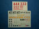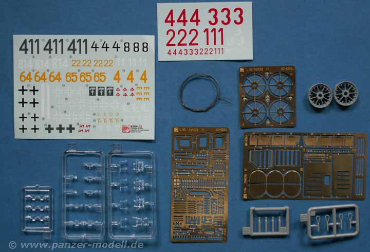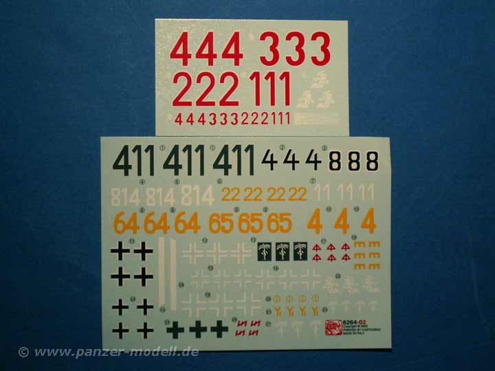 Die Decals sind auf 2 Bögen und geben die Möglichkeit vielfältiger Markeirungsmöglichkeiten. In der Bauanleitung werden ganze 10 verschiedene Bemalungs- und Markierungsmöglichkeiten dargestellt. Zwei Vorschläge für die frühe Version an der Ostfront, fünf Vorschläge für die späte Version an Ostfront und Balkan, sowie 3 Vorschläge der Afrikaversion. Einziges Problem, das ich sehe, sind die großen Turmnummern, die über Sichtluken anzubringen sind, was leider kaum anständig zu bewerkstelligen ist - Trockenreibebilder wären hier die Lösung, abe rman kann nicht alles haben.