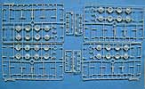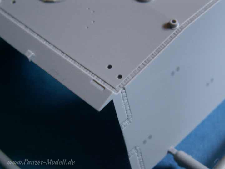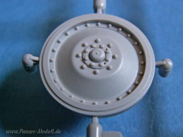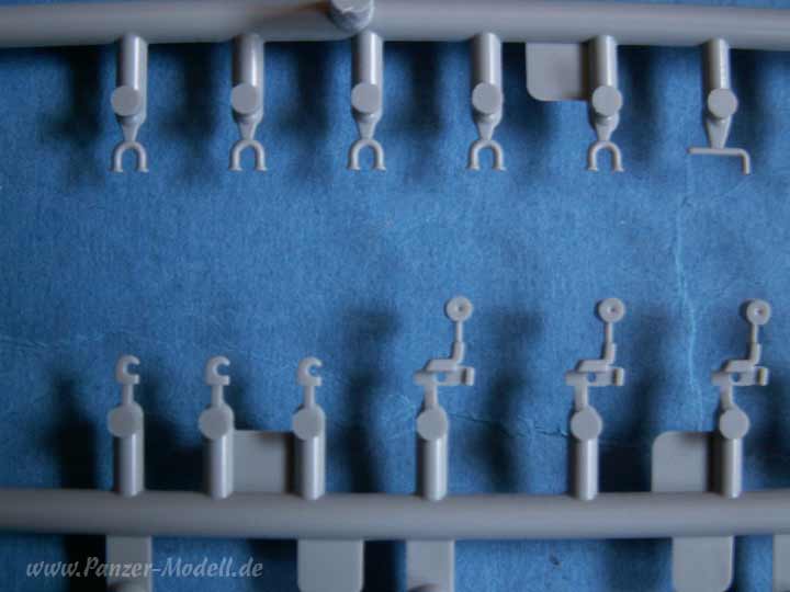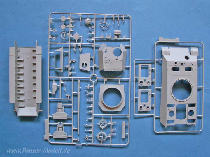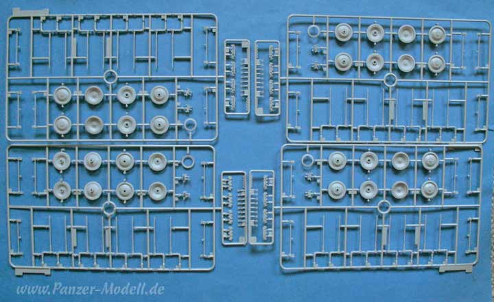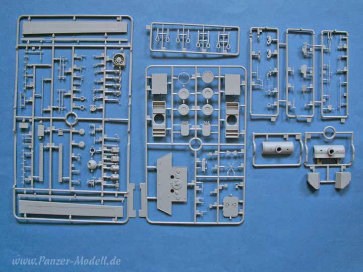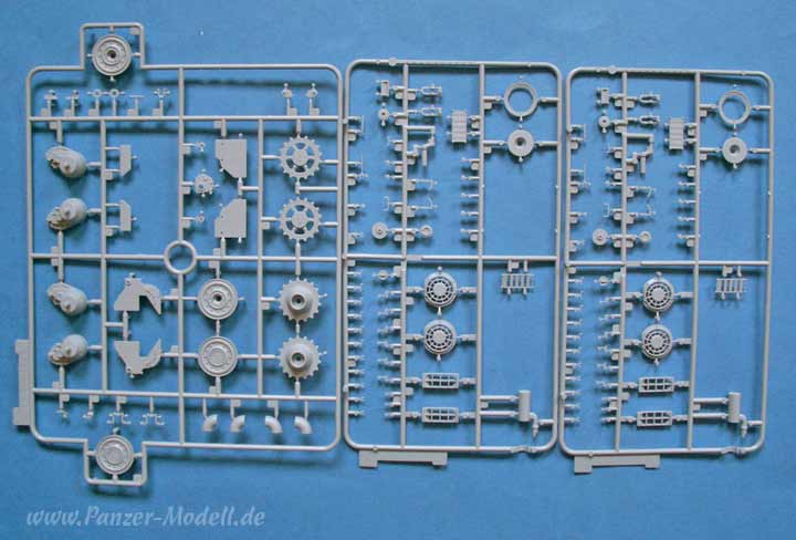 Die Gussqualität und Details setzen schon fast wieder neue Maßstäbe, denn wo früher große Bauteile in mehrere kleine aufgebrochen werden mussten um einigermaßen Details zu erhalten, gibt es nun exzellente Details an Großteilen wo man früher nur von geträumt hat - dies bezieht sich nicht nur auf die hervorragenden Schweissnähte überall dort wo sie hingehören, sondern auch auf Gusstrukturen wie z.B. die Kanonenblende und die wirklich hervorragenden Einzelkettenglieder mit durchbrochenen Führungszähnen und Eisgreifern. Das "Problem" der Auswerferstellen bei den Kettengliedern hat Dragon auch insofern in den Griff bekommen, als dass sie quasi nicht mehr da sind - an dem ein oder anderen Kettenglied kann man noch schemenhaft diese erkennen, allerdings in der Mitte zwischen den Zähenn, wo man sie später am laufwerk nicht sieht! Auch die Räder, Werkzeug und andere Kleinteile weisen eine erstaunliche Detailierung auf. Für das Laufwerk steht zudem pro Seite eine Stahllaufrolle zur Verfügung, wie man es bei den letzten G-Modellen am letzten Schwingarm sehen konnte. Das Laufwerk an sich ist auch mit wahnsinnigen Details und Wahlmöglichkeiten versehen, so gibt es für die einzelnen Stationen unterschiedliche Typen an Schwingarmen und natürlich für den Innenbereich die Drehstäbe.