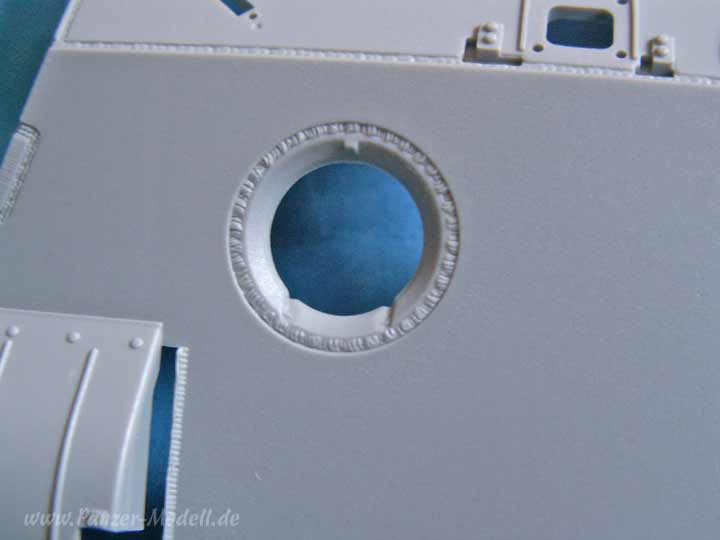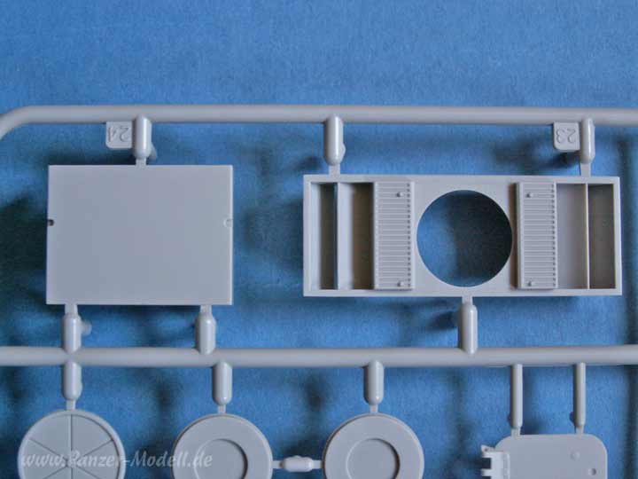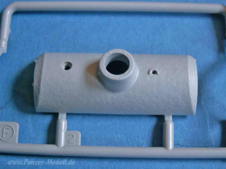 Für den Turm stehen zwei kanonenblenden, einmal mit und einmal ohne Kinn zur verfügung, wie man es an späten Panther G sehen konnte. Diese weisen eine tolle Gussstruktur auf. Desweiteren gibt es hier eine exzellent detailierte Kommandantenkuppel mit klaren Winkelspiegeln, einer Nahverteidigungswaffe (offen/geschlossen). Das Rohr ist aus Plastik, was der Qualität keinen Abbruch tut und die Kanenhalterung vorn ist mit zwei wahlweisen Zurrketten versehen, die sehr fein detailiert sind!