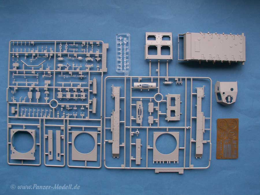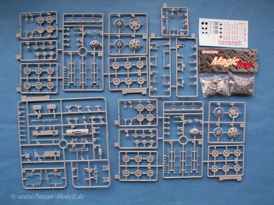 Im Bausatz enthalten sind 690 Teile an knapp 15 Spritzlingen. Dazu gibt es komplett neuentwickelte Panzer III Ketten als Magic Tracks, also die vorgeschnittenen Einzelketten, Fotoätzteile, Klarsichtteile und einen Decalbogen, welcher hier in Deutschland allerdings teilweise zensiert ist, da einige Abzeichen als "verfassungswidrig" angesehen werden.