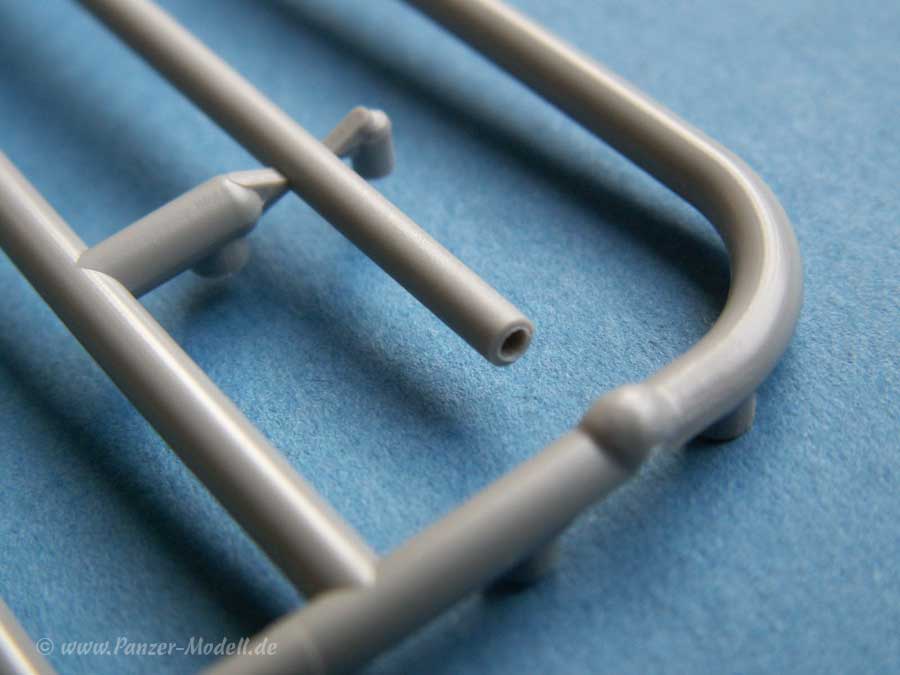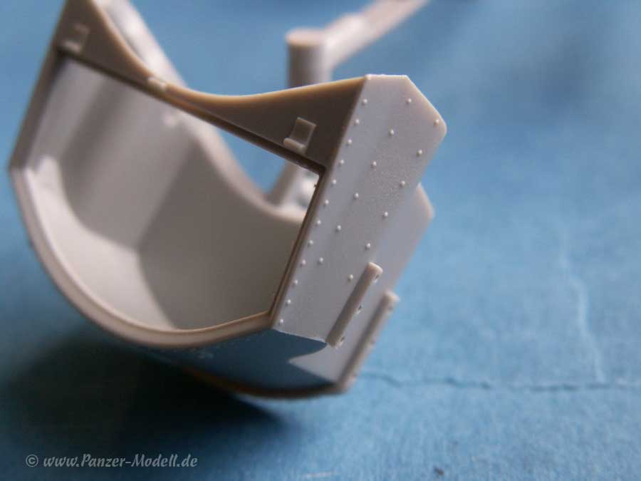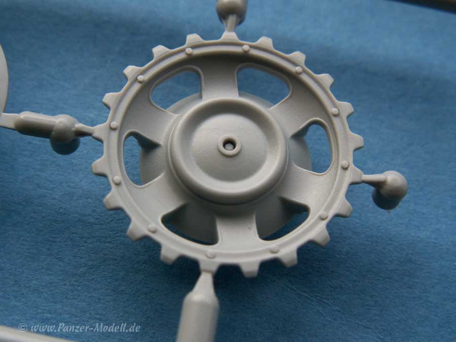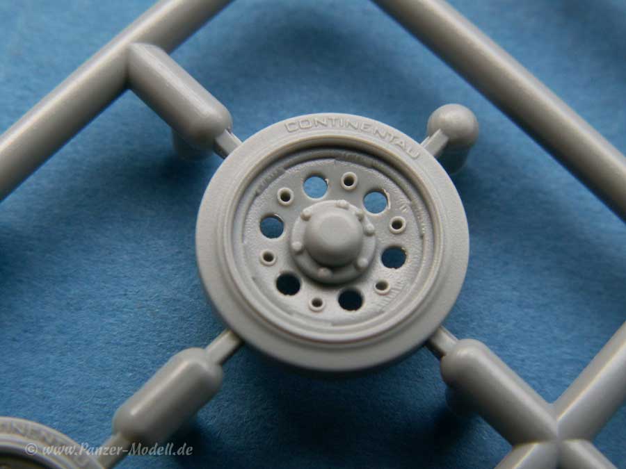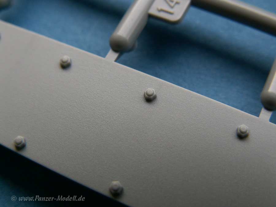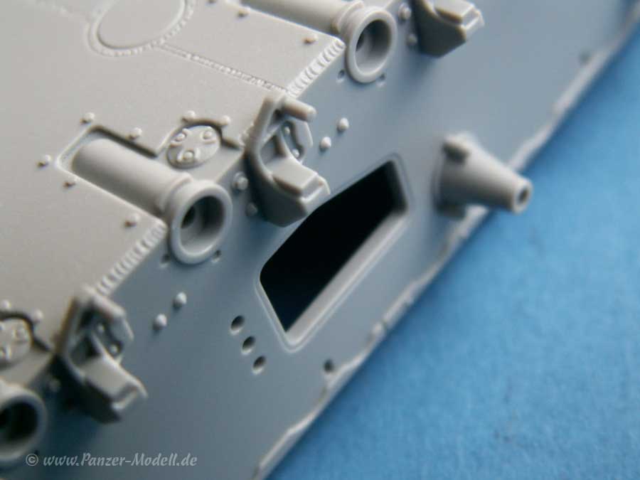 Wie bereits erwähnt sind die Details besonders klasse, so sind z.B. die versenkten Schrauben auf dem Turmdach super dargestellt, oder die feinen Nietenköpfe am Staukasten. Dieser weist zusätzlich sehr detailierte Verschlüsse auf und ist auch offen darstellbar. Auch sämtliche anderen Luken am Panzer sind offen darstellbar, was aber eigentlich nur dann Sinn macht, wenn man Motor- und/oder einen Innenraum einbauen würde. Die Lauf- und Stützrollen sind ebenfalls sehr gut und die Laufrollen mit dem berühmten "CONTINENTAU" Schriftzug versehen, der recht deutlich ausfällt - hier ist es ein leichtes den Letzten Buchstaben so zu modifizieren, dass der Name stimmt. Besonders angenehm fallen die beiden Abschlepseile auf, die bereits fix und fertig mit Halterungen in der richtigen Form für das Motordeck vorliegen - wahlweise kann man die Halterungen aber auch ohne Seil darstellen.