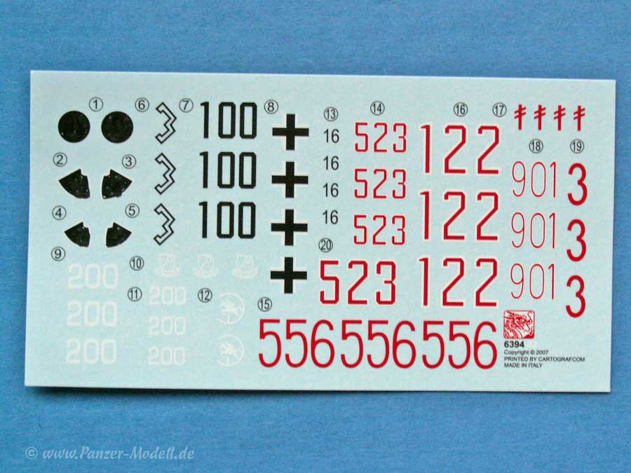Die Markierungen/Bemalung sieht 8 Versionen vor, wobei drei Einheitenabzeichen für Deutschland auf dem Decalbogen ausgeschwärzt wurden. Als Einheiten stehen von den Markierungen folgende zur Verfügung: