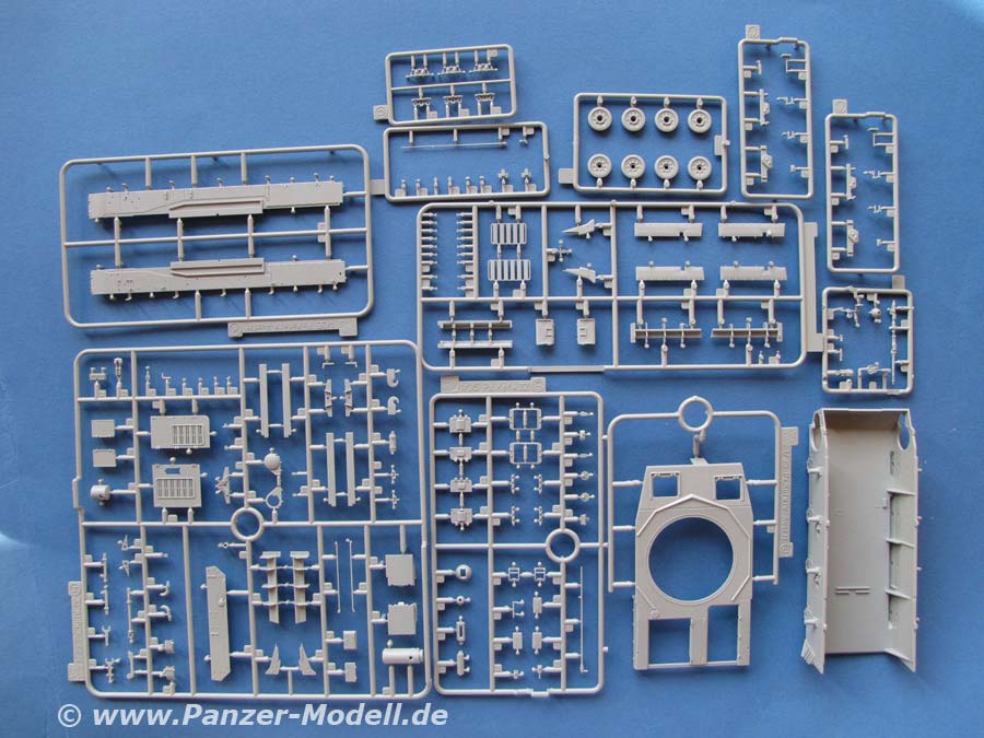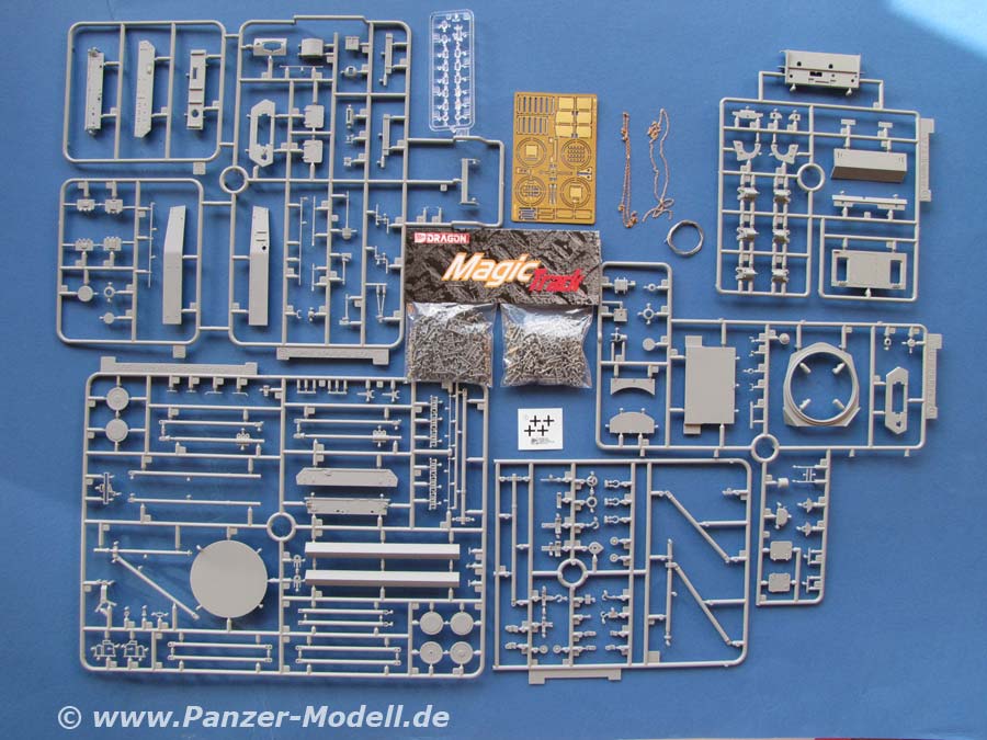 Im Bausatz enthalten sind über 780 Teile an knapp 18 mehr oder weniger großen Spritzlingen. Dazu gibt es natürlich die passenden Ketten als Magic Tracks, also die vorgeschnittenen Einzelketten, Fotoätzteile, Klarsichtteile, Metallkabel, Metallgliederkettchen und einen kleinen Decalbogen.