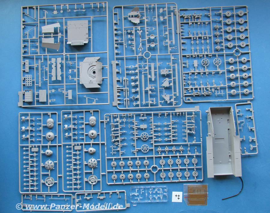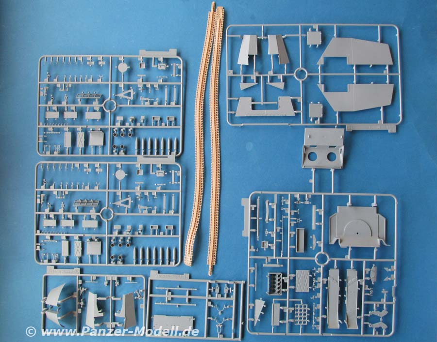 Im Karton finden wir 14 Spritzlinge, ein Spritzling mit Klarsichtteilen, 2 DS Ketten, PE Teile und ein Decalbogen.
