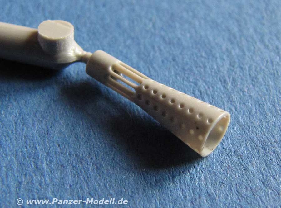 Das Flakrohr ist in Plastik enthalten mit einzelnem Mündunsgfeuerdämpfer, der sensationell fein und dünnwandig ist. Und dazu sind die Lüftungsschlitze an der Basis sogar durchbrochen - da ist grandios gemacht!