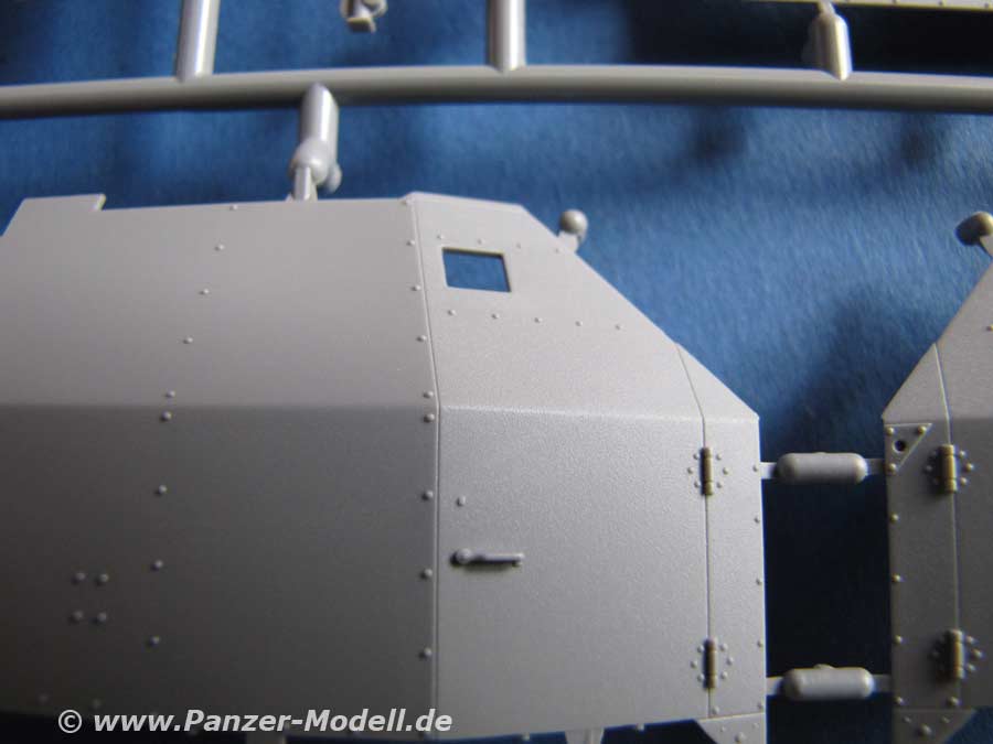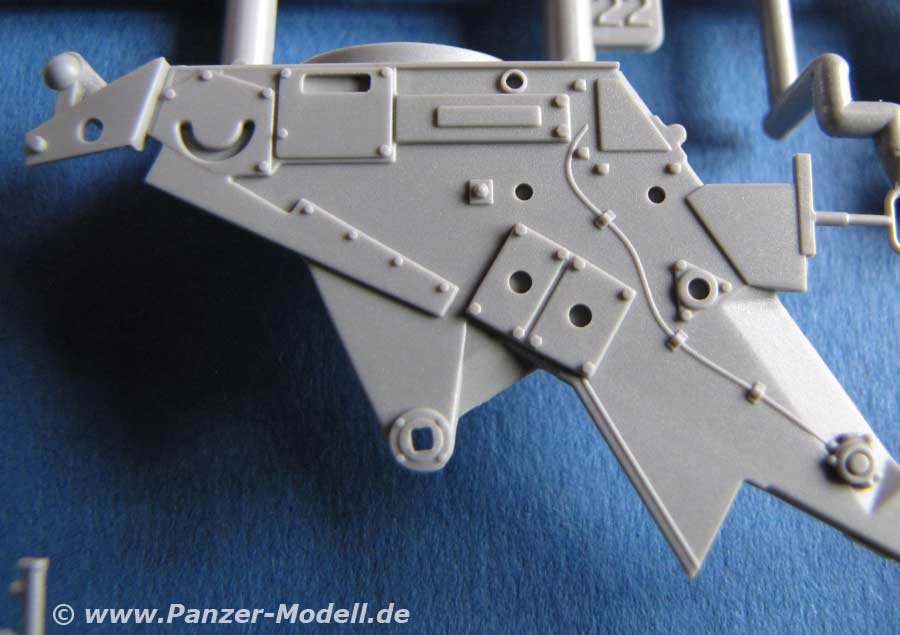 Es liegen Teile für das Schutzschild bei um dies einmal eingeklappt während der Fahrt und einmal aufgeklappt im Kampf darzustellen. Die Schilde sind exzellent in Plastik in passender Stärke und ohne Auswerferstellen gemacht, was eine wahre Freude ist.