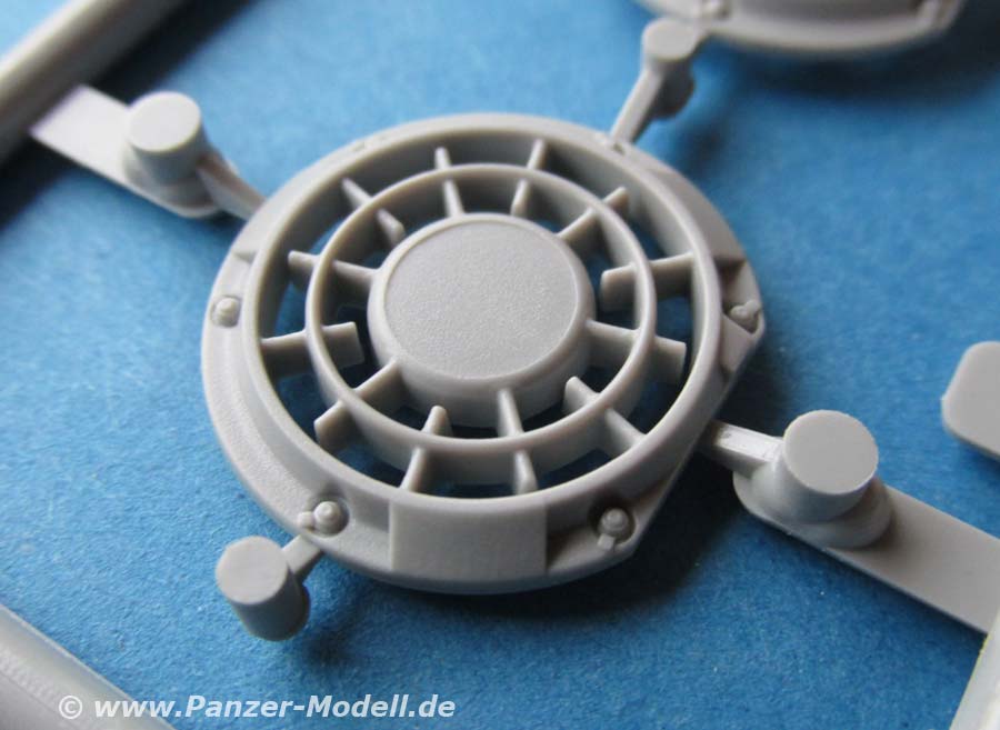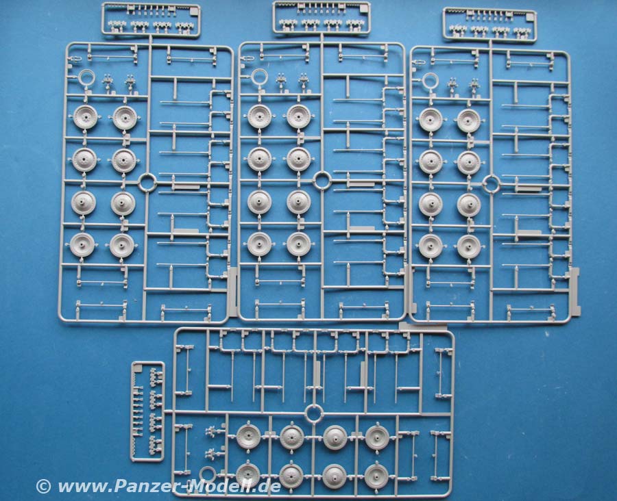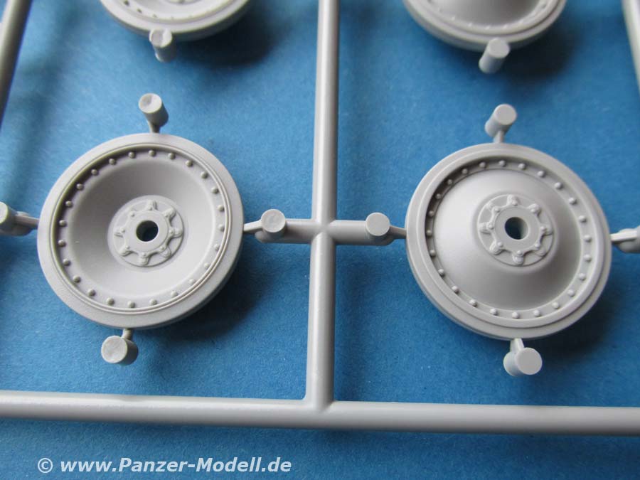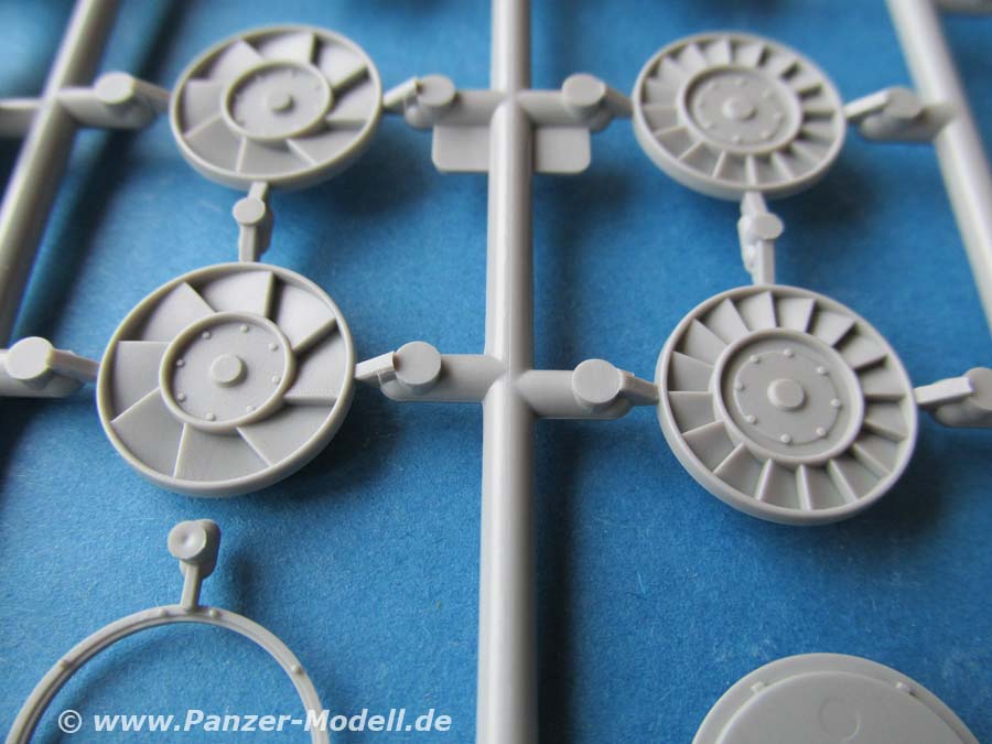 Die Laufrollen sind ebenfalls ganz ausgezeichnet mit feinen und klaren Details, wie z.B. den Radmuttern. Für das Laufwerk, bzw. Vorgelege und Dämpfer stehen zwei verschiedenen Optionen zur Verfügung - Dragon schweigt sich leider wieder darüber aus wa es mit diesen auf sich hat.
