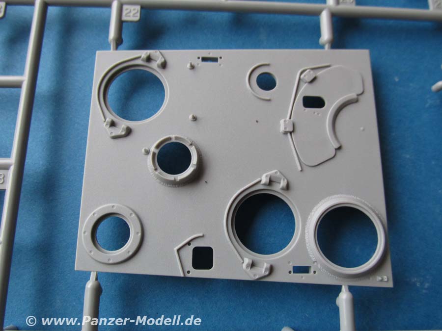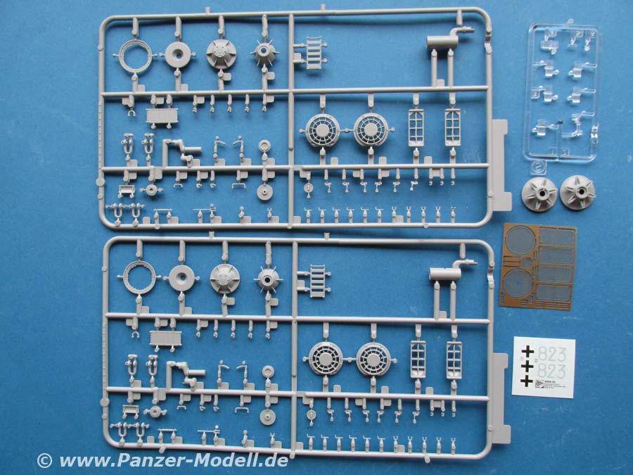Die Oberwanne mit Motordeck entspricht auch der korrekten G2 Auslegung, unter anderem mit der Kampfraumheizung. Auch zwei Lüfterabdeckungstypen zur auswahl sind auch dabei, wie natürlich die Abdeckgitter aus fein geätzten PE Teilen. Unter dem Motordeck finden sich auch die Teile für das Innenleben von Kühlern und Lüftern.