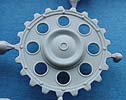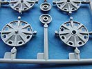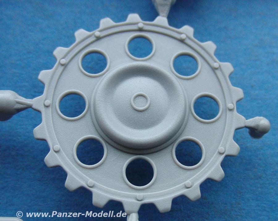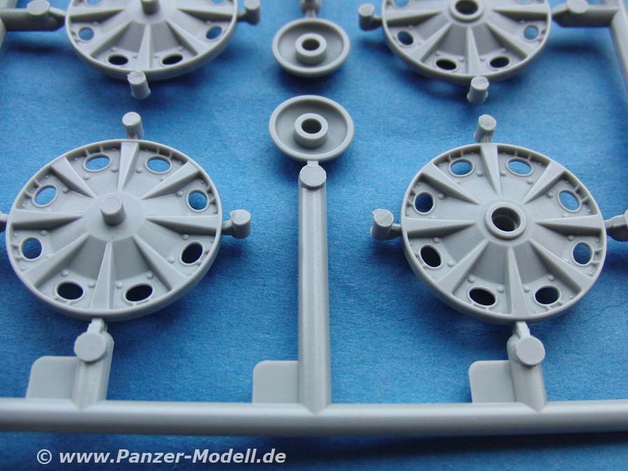 Die Laufrollen sind exzellent und realistisch dargestellt in der schmalen Ausführung und ohne Absatz zum Gummi. Die späteren Laufrollen liegen dem Bausatz übrigens auch bei, wennauch man diese für die Ausf.E nicht gebrauchen kann. Überhaupt liegen reichlich Teile bei, die nicht benötigt werden und so in die grabbelkiste wandern können.
