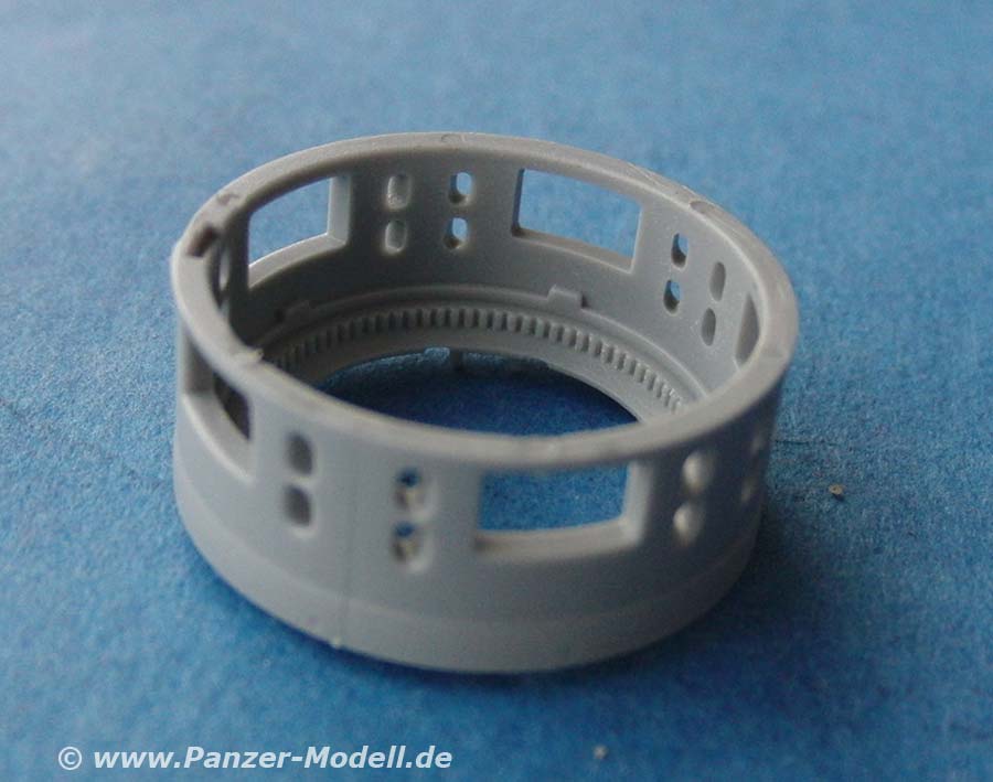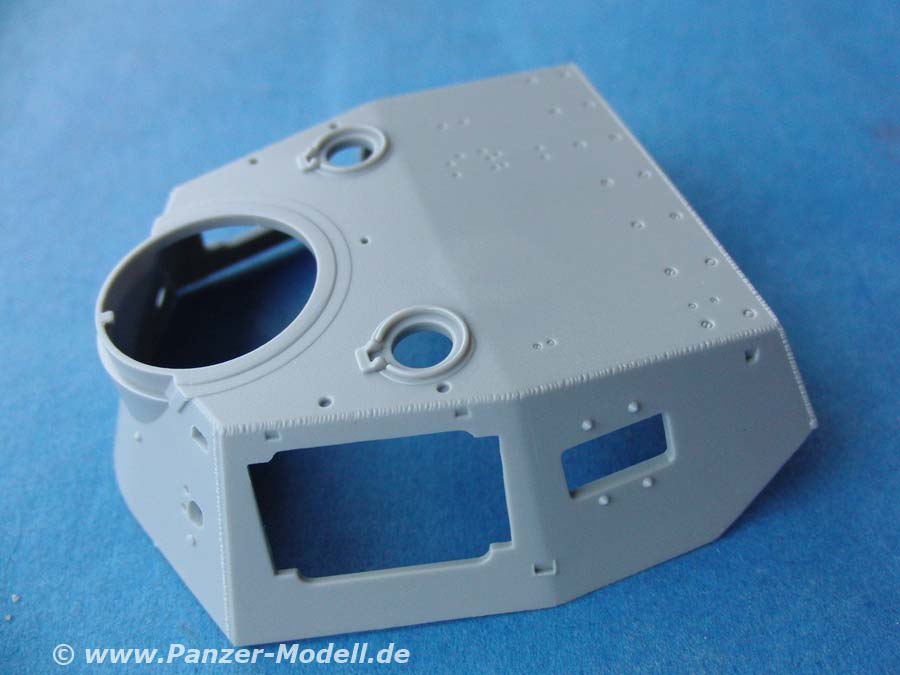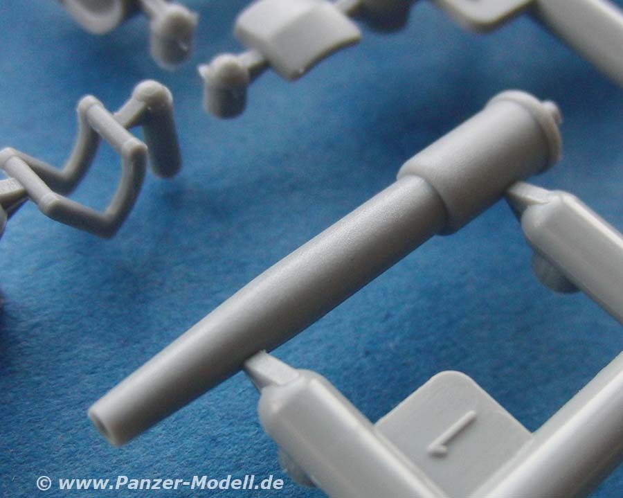 Aber auch die Kanonenblende mit der Hauptwaffe und den 2 koaxialen MGs sieht recht gut aus, zumal die Kanone einteilig gemacht wurde und auch im Inneren des Turms einiges an Material dargestellt wird.
