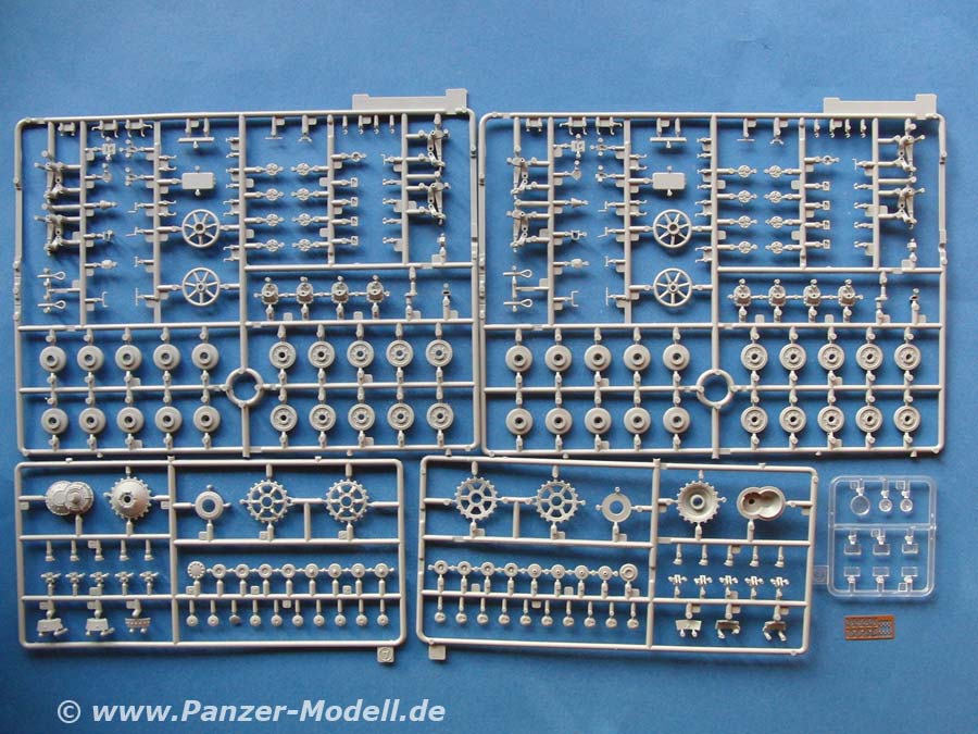 Die Wanne mit dem Panzer IV Laufwerk ist exzellent dargestellt mit sauberen und hochfeinen Nietenreihen. Das Laufwerk mit den Laufrollen und Ketten kennt man bereits von den bereits bekannten Panzer IV Bausätzen und ist sehr schön detailliert.