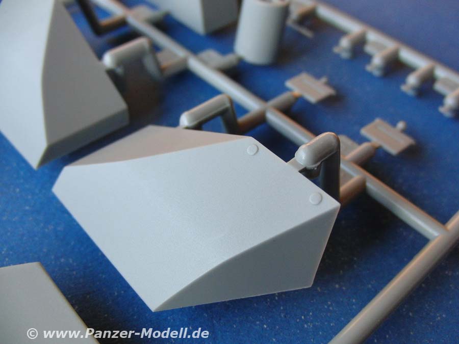 Auch das Wannenoberdeck ist sehr schön mit feinen Nietenreihen versehen und verschiedenen Anbauteilen, wie Pollern, Anker, Zugangsluken und dem Fahrer/Funkeraufbau - dieser ist wesentlich verlängert und im hinteren Bereich mit einem hohen und oben offenen Kommandantenzugang versehen. Der Kran am Wannenheck ist leider nur im zusammengeklappten Zustand dargestellt.