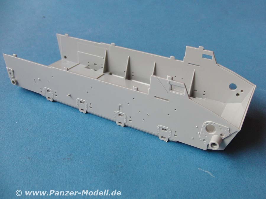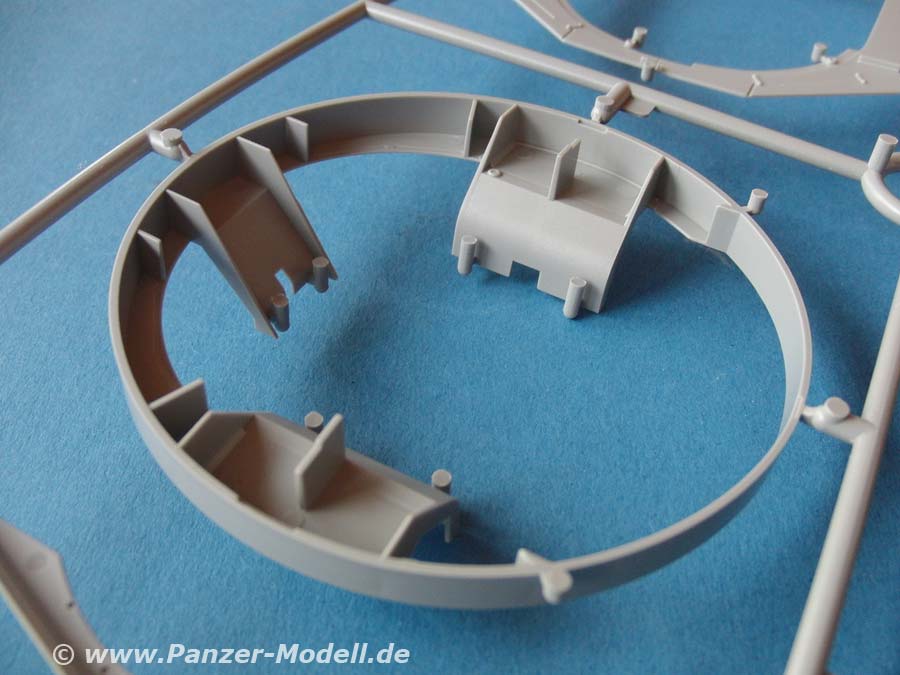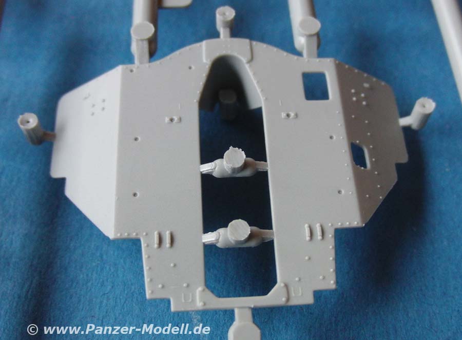 Der Turm setzt sich aus mehreren Teilen zusammen und beinhaltet diverse feine PE Teile und sehr gut aussehende Munitionsbehälter. Die leichte Feldhaubitze ist sehr fein und sehr detailliert. Das Rohr ist aus Plastik und ist einteilig. Lediglich das Frontstück der Mündungsbremse muss aufgeklebt werden. Sockel, Geschützschilde, sowie Richt- und Sichtmittel sehen sehr gut aus und sind sehr detailliert. Allein der Bau der gesamten Feldhaubitze umfasst 11 Bauschritte!