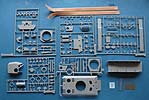Hier finden wir 16 mehr oder weniger große graue Spritzlinge, zwei DS Ketten, eine PE Platine und ein Decalbogen.