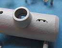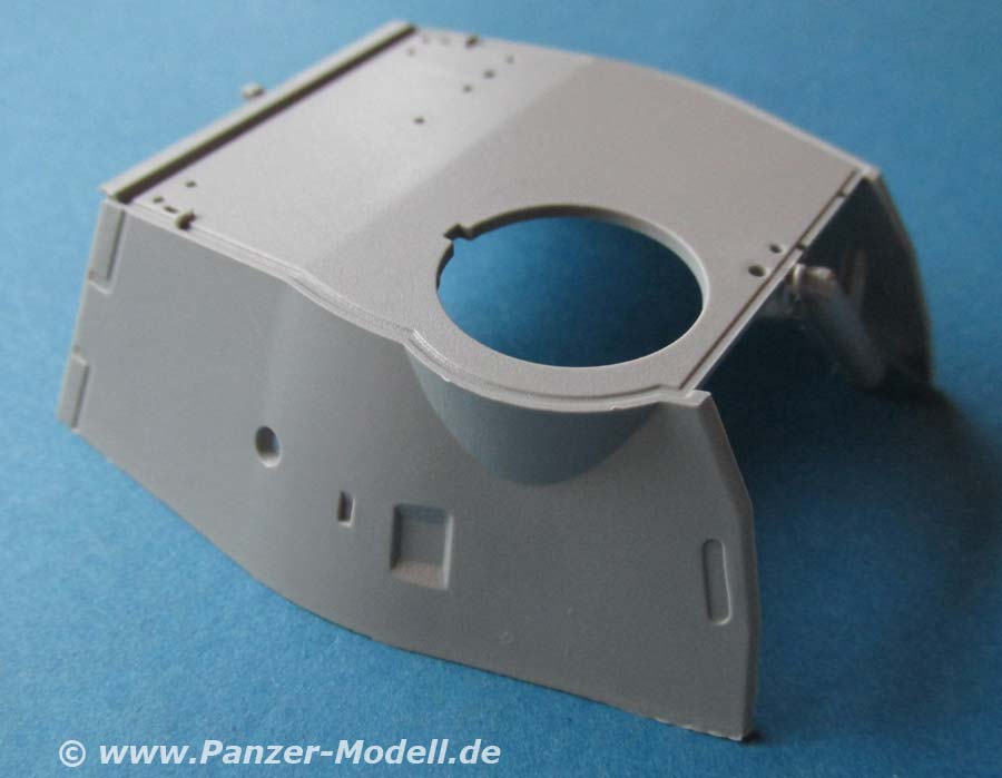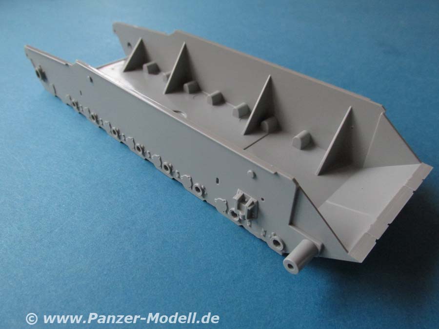 Ober- und Unterwanne müssen um die Details der verzahnten Panzerplatten durch verspachteln beraubt werden, da die Versuchsserie nur aus Weichstahl produziert wurde. Auch an der Heckplatte müssen aufgeprägte Details entfernt und 5mm des unteren Rands entfernt werden, wie auch im Heckbereich der Unterwanne (vorsicht - die Anleitung zeigt dabei auf den vorderen Teil der Wanne).