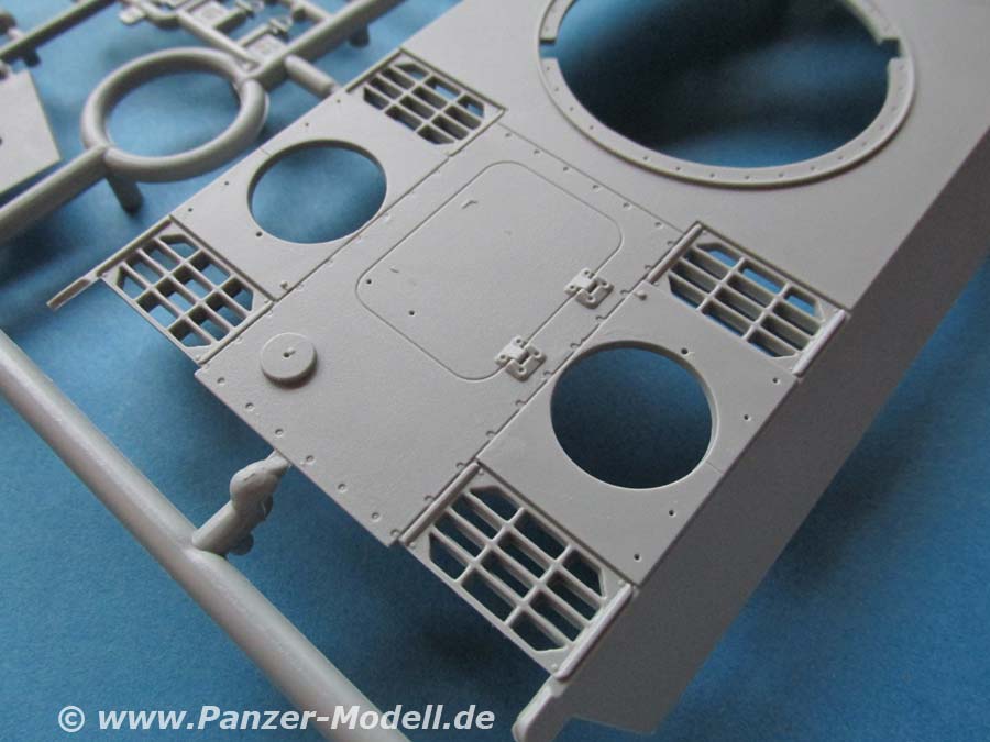 Auf dem Motordeck sind alle korrekten Details dieser frühen Version mit den Lüftergittern. Zusätzlich liegen ein paar PE Gitter bei, die sauber und fein geätzt sind.