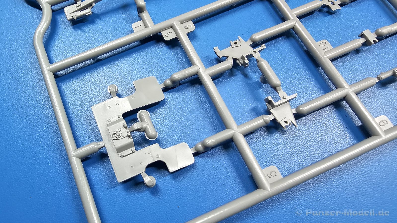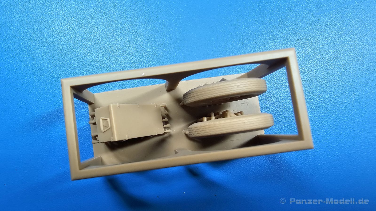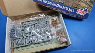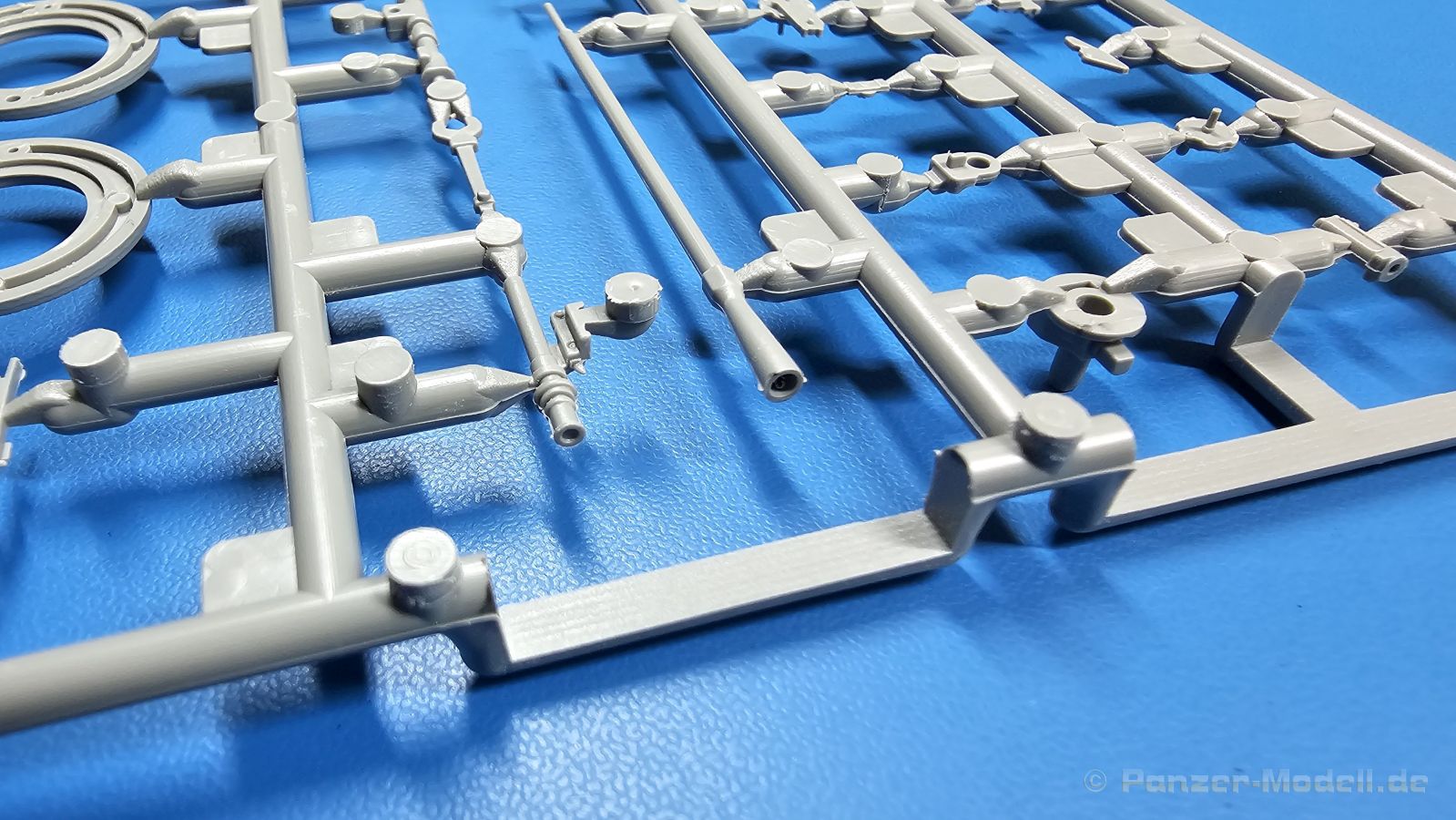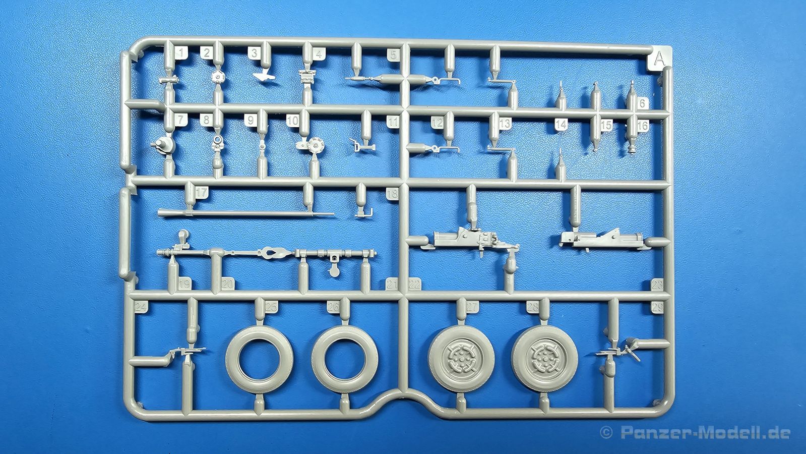 Die gezogene 25mm PaK S.A. 34 wurde in den späten 1920-ern von der französischen Firma Hotchkiss entwickelt. Sie kam ab 1934 als Panzerabwehrwaffe zur französischen Armee und war in der Lage mit panzerbrechender Munition viele Panzer der damaligen Zeit bis auf 1.000 Meter Entfernung zu bekämpfen. Eine trainierte Besatzung konnte bis zu 15 Schuss pro Minute abgeben. Zu Beginn des Krieges standen ca. 4.500 dieser Pak Frankreich zur Verfügung, aber schnell musste man feststellen, dass man damit zwar leichte Panzerwagen bekämpfen konnte, aber sie nicht gegen die stärker gepanzerten Panzerkampfwagen III und IV ankamen. Ein Teil wurde auch dem britischen Expeditionskorps überlassen, da diesen nicht genügend Panzerabwehrwaffen zur Verfügung standen. Nach dem Fall Frankreichs fielen viele S.A. 34 den Deutschen in die Hände, die die Pak unter Bezeichnung 2,5 cm PaK 112(f) in ihr Arsenal einreihten. Die Kanone selbst fand auch Verwendung in Panzerwagen wie dem Panhard 178. Der Bausatz: Dynamo Models kennt man eher als Resin Figuren- und Zubehör-Set Hersteller, der letztes Jahr den Sprung zu den Plastikbausätzen wagte. Sein zweiter Plastikbausatz stellt ein Objekt aus seinem Heimatland dar. Die französische 25mm Pak ist ein eher seltenes Modell, passt aber grad in dieser Zeit auch gut zu den französischen Fahrzeugen z.B. dem Laffly V15 von ICM. Der Bausatz erscheint gleich 3x – als normaler Plastikbausatz, als Premium- und als Deluxe Edition. Heute liegt mir die Premium Edition vor. Im 245 x 175 x 35 mm großen Karton befinden sich zwei hellgraue Spritzlinge, ein gedrehtes Metallkanonenrohr plus Mündungsfeuerdämpfer, drei 3D-Druckbasen, ein kleiner Naßschiebebilderbogen, eine gebundene Bauanleitung und ein Zusatzblatt. Mit den zwei Spritzgussrahmen kann man eine vollständige PaK bauen. Dies sind dann wohl die Teile für Standard Bausatz. Die Spritzgussteile machen einen guten Eindruck. Details treten deutlich hervor. Teile wie das Kanonenrohr und Zielfernrohr sind im Slide Mold Verfahren hergestellt. Auswerfer sind meist auf Angüsse neben die Teile gesetzt. Es gibt nur ganz wenige, die sich auf Teilen befinden. Sie sind sehr flach und an Stellen, die schwer oder nicht einzusehen sind. An wenigen Teilen ist etwas Fischhaut zu finden. Zwischen Spritzrahmen und Teilen ist genügend Platz zum Ansetzen des Seitenschneiders. So klein wie das Modell wird, bietet es doch allerlei Optionen wie Fahr- oder Gefechtsstellung, offener oder geschlossener Verschluss. Schauen wir mal, was es alles so gibt. An der Starrachse wird ein feststehender U-förmiger, beidseitig detaillierter Schild befestigt. Dieser erhält vorn noch eine Kanonenzurrung, die in Gefechtsstellung nach unten geklappt und in Fahrstellung nach oben geklappt die Kanone in erhöhter Stellung festzurrt. In Fahrstellung muss man dazu den Bolzen aus der Zurrung schneiden, weil dort dann der Kanonenschlitten hineinpassen soll. Die Räder aus Plastik sind zweiteilig ausgeführt, zeigen schöne Details und ein tolles Reifenprofil. Da es sich aber um den Premiumbausatz handelt, stehen auch 3D-gedruckte Räder zur Verfügung, die die Plastikräder übertrumpfen. Das Lager für die Schwenklafette wird von hinten an die Achse geklebt. Die Holme der Spreizlafette können in Schlepp- oder Gefechtsstellung gebaut werden. Je nach Wahl der Stellung gibt es andere Teile der Stützschaufeln. (Zu beachten: Das Teil B13 (Stützschaufel) ist nicht vollständig ausgeformt, daher ist dieses Teil noch einmal dabei, separat und vollständig.) In der Schleppstellung wird der hintere Stift der Holmverriegelung (A18) abgeschnitten, der bei Gefechtsstellung zu sehen ist. Es ist ein großes Schraubenschlüssel und einige, auch sehr kleine, Teile an den Holmen anzubringen. Die Holme werden ohne Klebstoff auf die Schwenkachse gesteckt. Eine Spreizstange ist in Fahrstellung am rechten Holm befestigt, in Gefechtsstellung hält sie die beiden Holme auseinander. Damit hat man das Fahrgestell bereits fertig. Das Kanonengehäuse ist zweiteilig ausgeführt, das Bodenstück hinten geöffnet, so dass man bei geöffnetem Verschluss ins Patronenlager sehen kann. Auch hier muss man beachten, dass je nach Verschlussstellung andere Teile zur Anwendung kommen, so dass der Öffnerhebel des Verschlusses die jeweils richtige Stellung anzeigt. Ein Feature, das andere Hersteller ganz gerne mal ignorieren. Entsprechend kann man den Verschluss nach unten (offen) oder nach oben (geschlossen) geschoben einbauen. Der Rohrrückholer ist eine Spiralfeder, die selbst in Plastik noch gut aussieht. Interessanterweise wird für das Zielfernrohr ein kleiner Extraschutzschild am linken Kanonenlager angebracht. Das Slide Mold gefertigte Zielfernrohr ist am Okular ausgehöhlt, so dass eine gewisse Tiefe erzeugt wird. Links am Kanonenschlitten wird die Seitenrichtkurbel angebracht, dahinter ein kleiner Abweiser, um den Richtschützen vor dem Kanonenrücklauf zu schützen. Die Höhenrichtkurbel setzt am linken Höhenrichtlager an. Hier ist ein feines Zahnsegment für die Höhenrichtung zu sehen. Linkes und rechtes Höhenlager nehmen die Zapfen des Kanonenschlittens auf. Letztere werden nicht geklebt, damit die Kanone in der Höhe beweglich bleibt. Am Boden ergeben die beiden Hälften den Schwenkzapfen, der dann ohne Klebstoff in das Schwenklager an der Radachse eingeführt wird. Das Schutzschild setzt an die beiden Höhenrichtlager an. Das Kanonenrohr selbst ist Slide Mold gespritzt mit schönem Mündungsfeuerdämpfer. In der Premium Edition liegt zusätzlich ein gedrehtes Aluminiumrohr mit separatem Mündungsfeuerdämpfer bei. Weiterhin gibt es einige 3D-gedruckte Teile. Da wäre die Rohrwischerstange, die an der Innenseite des linken Spreizholmes angebracht. Ein weiteres Teil ist eine Halterung unbekannter Natur, die am rechten Höhenrichtlager angebracht wird. Es gibt drei Patronenkästen, zwei geschlossen, einer offen mit drei oben sichtbaren Patronen. Dazu kommt eine ganze Menge separat