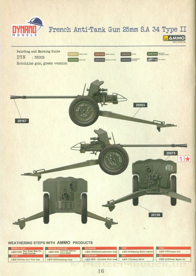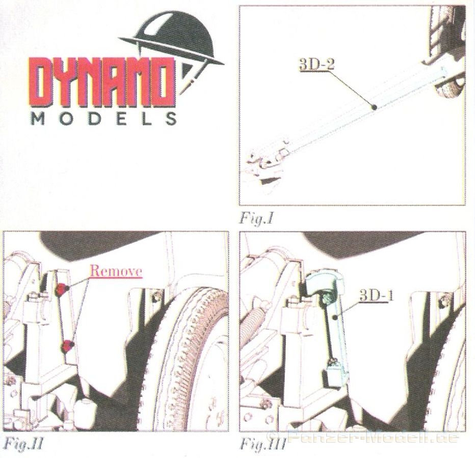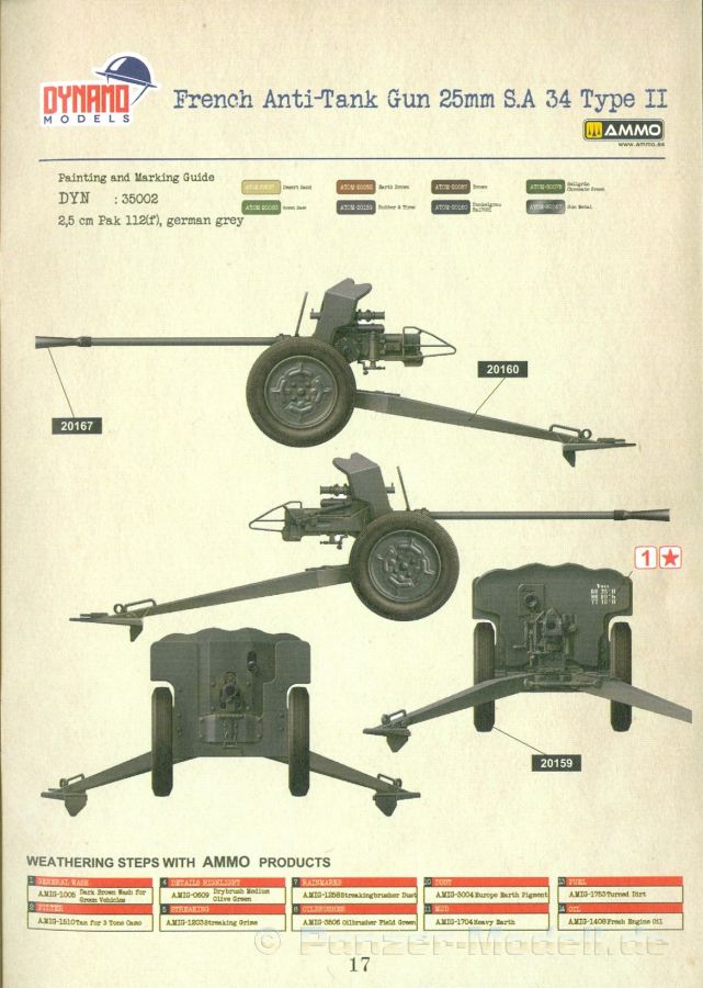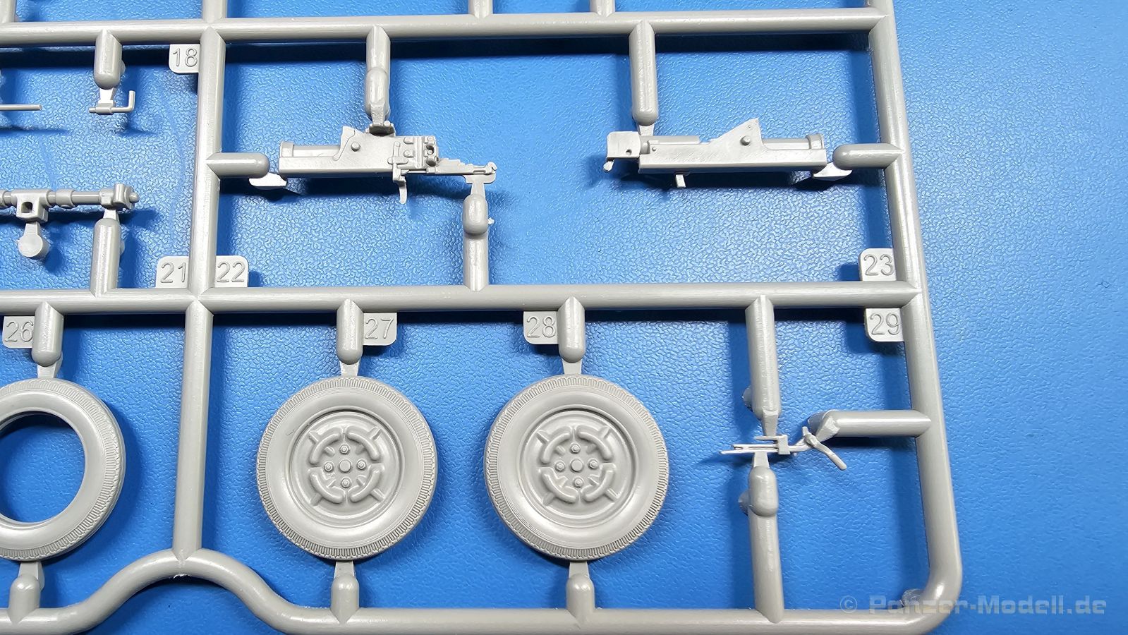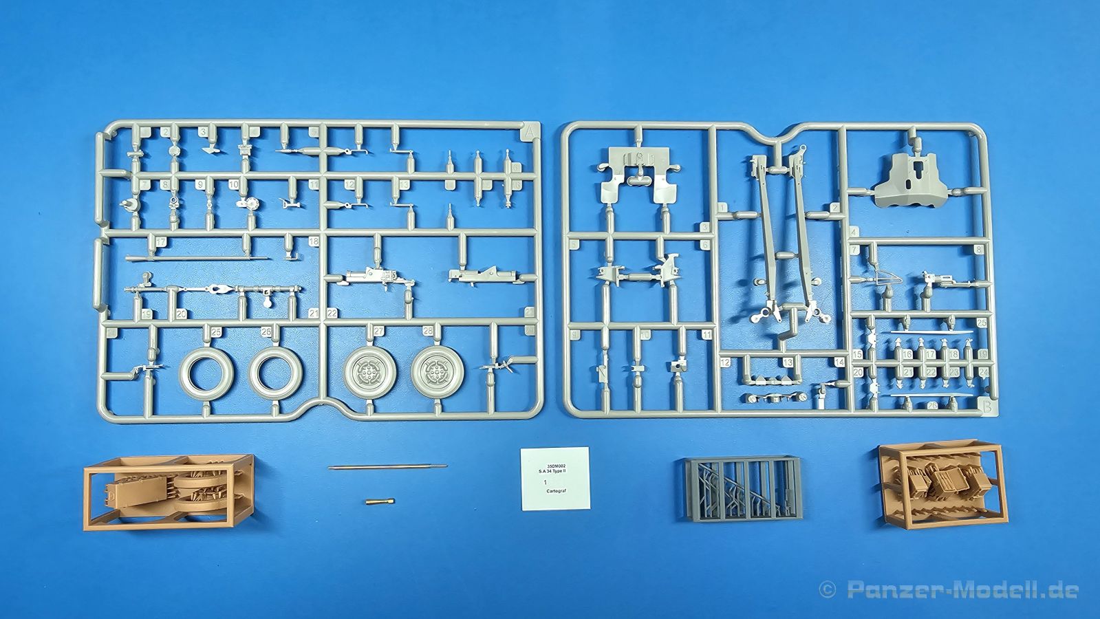 Die gezogene 25mm PaK S.A. 34 wurde in den späten 1920-ern von der französischen Firma Hotchkiss entwickelt. Sie kam ab 1934 als Panzerabwehrwaffe zur französischen Armee und war in der Lage mit panzerbrechender Munition viele Panzer der damaligen Zeit bis auf 1.000 Meter Entfernung zu bekämpfen. Eine trainierte Besatzung konnte bis zu 15 Schuss pro Minute abgeben. Zu Beginn des Krieges standen ca. 4.500 dieser Pak Frankreich zur Verfügung, aber schnell musste man feststellen, dass man damit zwar leichte Panzerwagen bekämpfen konnte, aber sie nicht gegen die stärker gepanzerten Panzerkampfwagen III und IV ankamen. Ein Teil wurde auch dem britischen Expeditionskorps überlassen, da diesen nicht genügend Panzerabwehrwaffen zur Verfügung standen. Nach dem Fall Frankreichs fielen viele S.A. 34 den Deutschen in die Hände, die die Pak unter Bezeichnung 2,5 cm PaK 112(f) in ihr Arsenal einreihten. Die Kanone selbst fand auch Verwendung in Panzerwagen wie dem Panhard 178. Der Bausatz: Dynamo Models kennt man eher als Resin Figuren- und Zubehör-Set Hersteller, der letztes Jahr den Sprung zu den Plastikbausätzen wagte. Sein zweiter Plastikbausatz stellt ein Objekt aus seinem Heimatland dar. Die französische 25mm Pak ist ein eher seltenes Modell, passt aber grad in dieser Zeit auch gut zu den französischen Fahrzeugen z.B. dem Laffly V15 von ICM. Der Bausatz erscheint gleich 3x – als normaler Plastikbausatz, als Premium- und als Deluxe Edition. Heute liegt mir die Premium Edition vor. Im 245 x 175 x 35 mm großen Karton befinden sich zwei hellgraue Spritzlinge, ein gedrehtes Metallkanonenrohr plus Mündungsfeuerdämpfer, drei 3D-Druckbasen, ein kleiner Naßschiebebilderbogen, eine gebundene Bauanleitung und ein Zusatzblatt. Mit den zwei Spritzgussrahmen kann man eine vollständige PaK bauen. Dies sind dann wohl die Teile für Standard Bausatz. Die Spritzgussteile machen einen guten Eindruck. Details treten deutlich hervor. Teile wie das Kanonenrohr und Zielfernrohr sind im Slide Mold Verfahren hergestellt. Auswerfer sind meist auf Angüsse neben die Teile gesetzt. Es gibt nur ganz wenige, die sich auf Teilen befinden. Sie sind sehr flach und an Stellen, die schwer oder nicht einzusehen sind. An wenigen Teilen ist etwas Fischhaut zu finden. Zwischen Spritzrahmen und Teilen ist genügend Platz zum Ansetzen des Seitenschneiders. So klein wie das Modell wird, bietet es doch allerlei Optionen wie Fahr- oder Gefechtsstellung, offener oder geschlossener Verschluss. Schauen wir mal, was es alles so gibt. An der Starrachse wird ein feststehender U-förmiger, beidseitig detaillierter Schild befestigt. Dieser erhält vorn noch eine Kanonenzurrung, die in Gefechtsstellung nach unten geklappt und in Fahrstellung nach oben geklappt die Kanone in erhöhter Stellung festzurrt. In Fahrstellung muss man dazu den Bolzen aus der Zurrung schneiden, weil dort dann der Kanonenschlitten hineinpassen soll. Die Räder aus Plastik sind zweiteilig ausgeführt, zeigen schöne Details und ein tolles Reifenprofil. Da es sich aber um den Premiumbausatz handelt, stehen auch 3D-gedruckte Räder zur Verfügung, die die Plastikräder übertrumpfen. Das Lager für die Schwenklafette wird von hinten an die Achse geklebt. Die Holme der Spreizlafette können in Schlepp- oder Gefechtsstellung gebaut werden. Je nach Wahl der Stellung gibt es andere Teile der Stützschaufeln. (Zu beachten: Das Teil B13 (Stützschaufel) ist nicht vollständig ausgeformt, daher ist dieses Teil noch einmal dabei, separat und vollständig.) In der Schleppstellung wird der hintere Stift der Holmverriegelung (A18) abgeschnitten, der bei Gefechtsstellung zu sehen ist. Es ist ein großes Schraubenschlüssel und einige, auch sehr kleine, Teile an den Holmen anzubringen. Die Holme werden ohne Klebstoff auf die Schwenkachse gesteckt. Eine Spreizstange ist in Fahrstellung am rechten Holm befestigt, in Gefechtsstellung hält sie die beiden Holme auseinander. Damit hat man das Fahrgestell bereits fertig. Das Kanonengehäuse ist zweiteilig ausgeführt, das Bodenstück hinten geöffnet, so dass man bei geöffnetem Verschluss ins Patronenlager sehen kann. Auch hier muss man beachten, dass je nach Verschlussstellung andere Teile zur Anwendung kommen, so dass der Öffnerhebel des Verschlusses die jeweils richtige Stellung anzeigt. Ein Feature, das andere Hersteller ganz gerne mal ignorieren. Entsprechend kann man den Verschluss nach unten (offen) oder nach oben (geschlossen) geschoben einbauen. Der Rohrrückholer ist eine Spiralfeder, die selbst in Plastik noch gut aussieht. Interessanterweise wird für das Zielfernrohr ein kleiner Extraschutzschild am linken Kanonenlager angebracht. Das Slide Mold gefertigte Zielfernrohr ist am Okular ausgehöhlt, so dass eine gewisse Tiefe erzeugt wird. Links am Kanonenschlitten wird die Seitenrichtkurbel angebracht, dahinter ein kleiner Abweiser, um den Richtschützen vor dem Kanonenrücklauf zu schützen. Die Höhenrichtkurbel setzt am linken Höhenrichtlager an. Hier ist ein feines Zahnsegment für die Höhenrichtung zu sehen. Linkes und rechtes Höhenlager nehmen die Zapfen des Kanonenschlittens auf. Letztere werden nicht geklebt, damit die Kanone in der Höhe beweglich bleibt. Am Boden ergeben die beiden Hälften den Schwenkzapfen, der dann ohne Klebstoff in das Schwenklager an der Radachse eingeführt wird. Das Schutzschild setzt an die beiden Höhenrichtlager an. Das Kanonenrohr selbst ist Slide Mold gespritzt mit schönem Mündungsfeuerdämpfer. In der Premium Edition liegt zusätzlich ein gedrehtes Aluminiumrohr mit separatem Mündungsfeuerdämpfer bei. Weiterhin gibt es einige 3D-gedruckte Teile. Da wäre die Rohrwischerstange, die an der Innenseite des linken Spreizholmes angebracht. Ein weiteres Teil ist eine Halterung unbekannter Natur, die am rechten Höhenrichtlager angebracht wird. Es gibt drei Patronenkästen, zwei geschlossen, einer offen mit drei oben sichtbaren Patronen. Dazu kommt eine ganze Menge separat