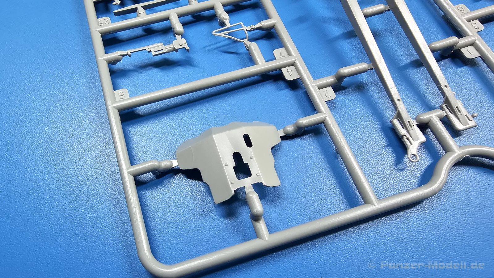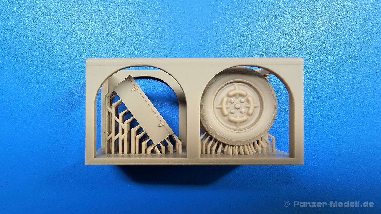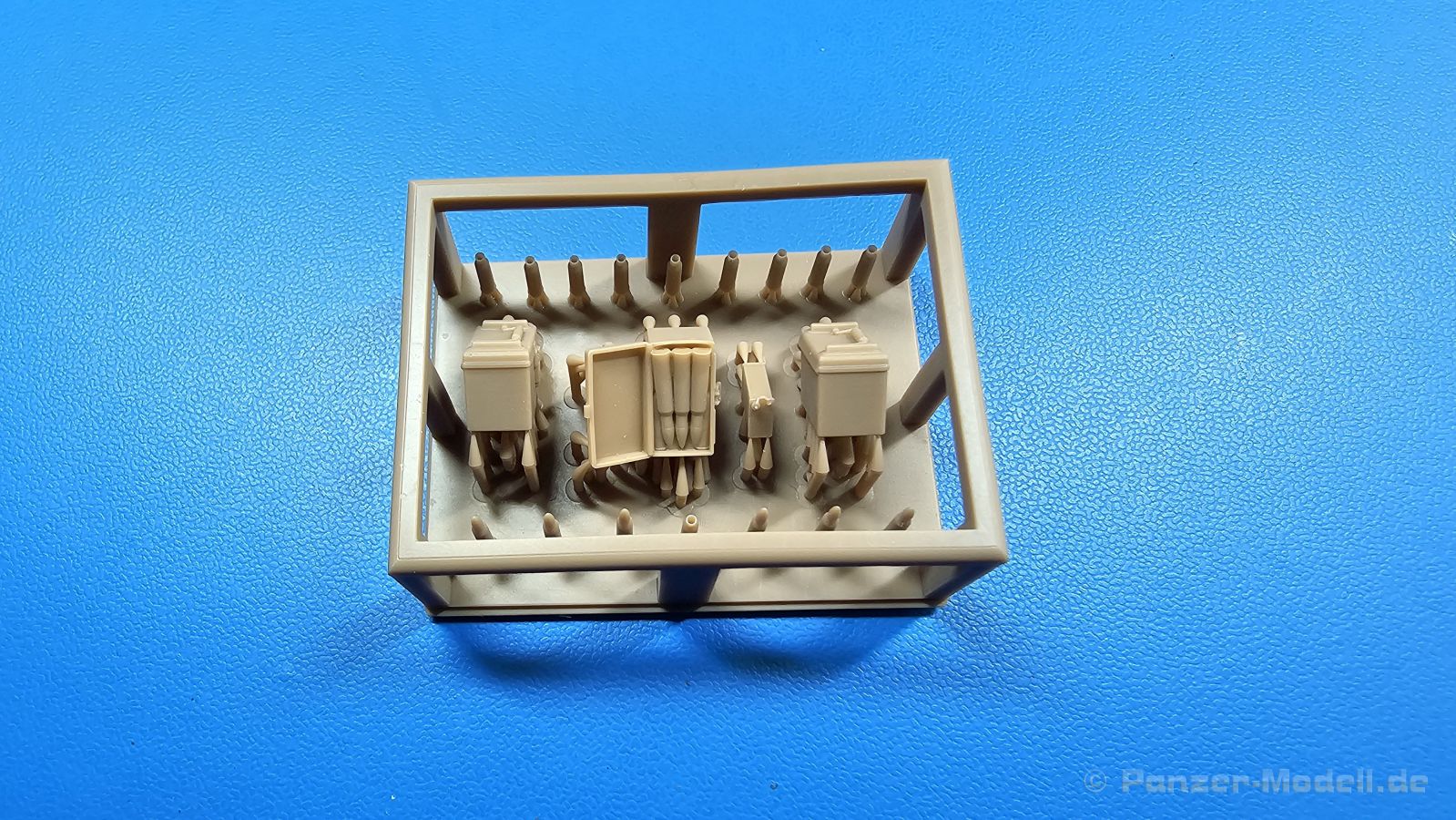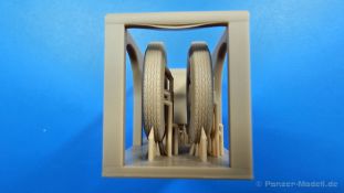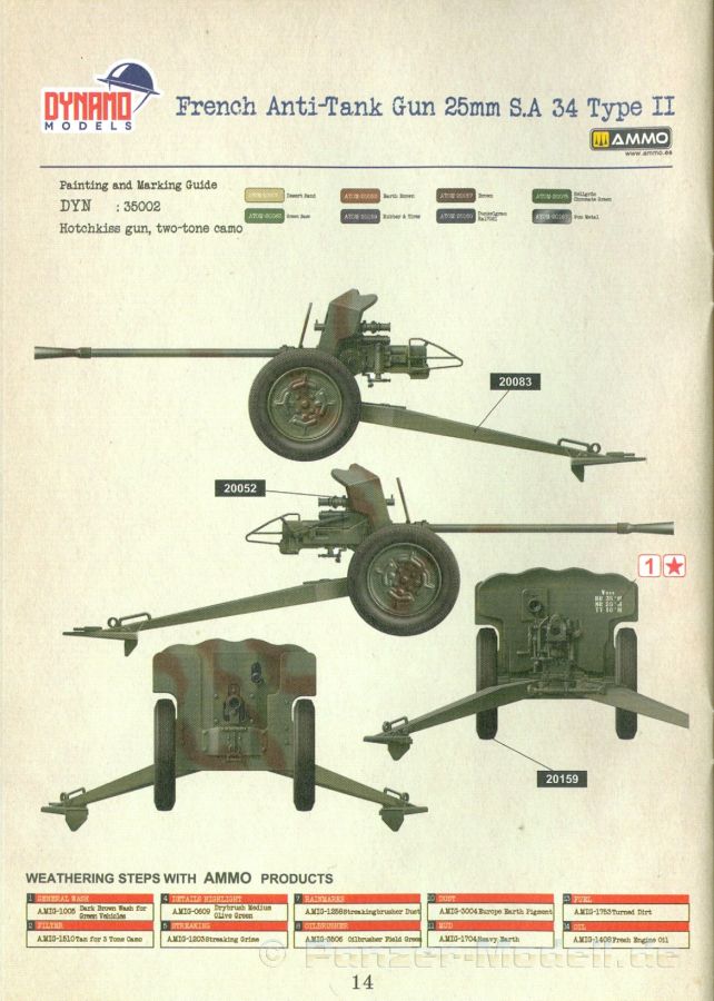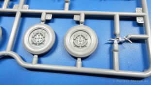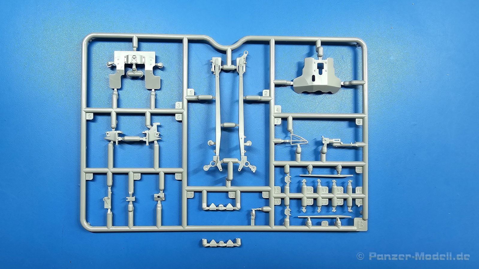 Die gezogene 25mm PaK S.A. 34 wurde in den späten 1920-ern von der französischen Firma Hotchkiss entwickelt. Sie kam ab 1934 als Panzerabwehrwaffe zur französischen Armee und war in der Lage mit panzerbrechender Munition viele Panzer der damaligen Zeit bis auf 1.000 Meter Entfernung zu bekämpfen. Eine trainierte Besatzung konnte bis zu 15 Schuss pro Minute abgeben. Zu Beginn des Krieges standen ca. 4.500 dieser Pak Frankreich zur Verfügung, aber schnell musste man feststellen, dass man damit zwar leichte Panzerwagen bekämpfen konnte, aber sie nicht gegen die stärker gepanzerten Panzerkampfwagen III und IV ankamen. Ein Teil wurde auch dem britischen Expeditionskorps überlassen, da diesen nicht genügend Panzerabwehrwaffen zur Verfügung standen. Nach dem Fall Frankreichs fielen viele S.A. 34 den Deutschen in die Hände, die die Pak unter Bezeichnung 2,5 cm PaK 112(f) in ihr Arsenal einreihten. Die Kanone selbst fand auch Verwendung in Panzerwagen wie dem Panhard 178. Der Bausatz: Dynamo Models kennt man eher als Resin Figuren- und Zubehör-Set Hersteller, der letztes Jahr den Sprung zu den Plastikbausätzen wagte. Sein zweiter Plastikbausatz stellt ein Objekt aus seinem Heimatland dar. Die französische 25mm Pak ist ein eher seltenes Modell, passt aber grad in dieser Zeit auch gut zu den französischen Fahrzeugen z.B. dem Laffly V15 von ICM. Der Bausatz erscheint gleich 3x – als normaler Plastikbausatz, als Premium- und als Deluxe Edition. Heute liegt mir die Premium Edition vor. Im 245 x 175 x 35 mm großen Karton befinden sich zwei hellgraue Spritzlinge, ein gedrehtes Metallkanonenrohr plus Mündungsfeuerdämpfer, drei 3D-Druckbasen, ein kleiner Naßschiebebilderbogen, eine gebundene Bauanleitung und ein Zusatzblatt. Mit den zwei Spritzgussrahmen kann man eine vollständige PaK bauen. Dies sind dann wohl die Teile für Standard Bausatz. Die Spritzgussteile machen einen guten Eindruck. Details treten deutlich hervor. Teile wie das Kanonenrohr und Zielfernrohr sind im Slide Mold Verfahren hergestellt. Auswerfer sind meist auf Angüsse neben die Teile gesetzt. Es gibt nur ganz wenige, die sich auf Teilen befinden. Sie sind sehr flach und an Stellen, die schwer oder nicht einzusehen sind. An wenigen Teilen ist etwas Fischhaut zu finden. Zwischen Spritzrahmen und Teilen ist genügend Platz zum Ansetzen des Seitenschneiders. So klein wie das Modell wird, bietet es doch allerlei Optionen wie Fahr- oder Gefechtsstellung, offener oder geschlossener Verschluss. Schauen wir mal, was es alles so gibt. An der Starrachse wird ein feststehender U-förmiger, beidseitig detaillierter Schild befestigt. Dieser erhält vorn noch eine Kanonenzurrung, die in Gefechtsstellung nach unten geklappt und in Fahrstellung nach oben geklappt die Kanone in erhöhter Stellung festzurrt. In Fahrstellung muss man dazu den Bolzen aus der Zurrung schneiden, weil dort dann der Kanonenschlitten hineinpassen soll. Die Räder aus Plastik sind zweiteilig ausgeführt, zeigen schöne Details und ein tolles Reifenprofil. Da es sich aber um den Premiumbausatz handelt, stehen auch 3D-gedruckte Räder zur Verfügung, die die Plastikräder übertrumpfen. Das Lager für die Schwenklafette wird von hinten an die Achse geklebt. Die Holme der Spreizlafette können in Schlepp- oder Gefechtsstellung gebaut werden. Je nach Wahl der Stellung gibt es andere Teile der Stützschaufeln. (Zu beachten: Das Teil B13 (Stützschaufel) ist nicht vollständig ausgeformt, daher ist dieses Teil noch einmal dabei, separat und vollständig.) In der Schleppstellung wird der hintere Stift der Holmverriegelung (A18) abgeschnitten, der bei Gefechtsstellung zu sehen ist. Es ist ein großes Schraubenschlüssel und einige, auch sehr kleine, Teile an den Holmen anzubringen. Die Holme werden ohne Klebstoff auf die Schwenkachse gesteckt. Eine Spreizstange ist in Fahrstellung am rechten Holm befestigt, in Gefechtsstellung hält sie die beiden Holme auseinander. Damit hat man das Fahrgestell bereits fertig. Das Kanonengehäuse ist zweiteilig ausgeführt, das Bodenstück hinten geöffnet, so dass man bei geöffnetem Verschluss ins Patronenlager sehen kann. Auch hier muss man beachten, dass je nach Verschlussstellung andere Teile zur Anwendung kommen, so dass der Öffnerhebel des Verschlusses die jeweils richtige Stellung anzeigt. Ein Feature, das andere Hersteller ganz gerne mal ignorieren. Entsprechend kann man den Verschluss nach unten (offen) oder nach oben (geschlossen) geschoben einbauen. Der Rohrrückholer ist eine Spiralfeder, die selbst in Plastik noch gut aussieht. Interessanterweise wird für das Zielfernrohr ein kleiner Extraschutzschild am linken Kanonenlager angebracht. Das Slide Mold gefertigte Zielfernrohr ist am Okular ausgehöhlt, so dass eine gewisse Tiefe erzeugt wird. Links am Kanonenschlitten wird die Seitenrichtkurbel angebracht, dahinter ein kleiner Abweiser, um den Richtschützen vor dem Kanonenrücklauf zu schützen. Die Höhenrichtkurbel setzt am linken Höhenrichtlager an. Hier ist ein feines Zahnsegment für die Höhenrichtung zu sehen. Linkes und rechtes Höhenlager nehmen die Zapfen des Kanonenschlittens auf. Letztere werden nicht geklebt, damit die Kanone in der Höhe beweglich bleibt. Am Boden ergeben die beiden Hälften den Schwenkzapfen, der dann ohne Klebstoff in das Schwenklager an der Radachse eingeführt wird. Das Schutzschild setzt an die beiden Höhenrichtlager an. Das Kanonenrohr selbst ist Slide Mold gespritzt mit schönem Mündungsfeuerdämpfer. In der Premium Edition liegt zusätzlich ein gedrehtes Aluminiumrohr mit separatem Mündungsfeuerdämpfer bei. Weiterhin gibt es einige 3D-gedruckte Teile. Da wäre die Rohrwischerstange, die an der Innenseite des linken Spreizholmes angebracht. Ein weiteres Teil ist eine Halterung unbekannter Natur, die am rechten Höhenrichtlager angebracht wird. Es gibt drei Patronenkästen, zwei geschlossen, einer offen mit drei oben sichtbaren Patronen. Dazu kommt eine ganze Menge separat