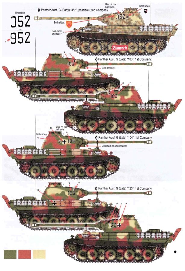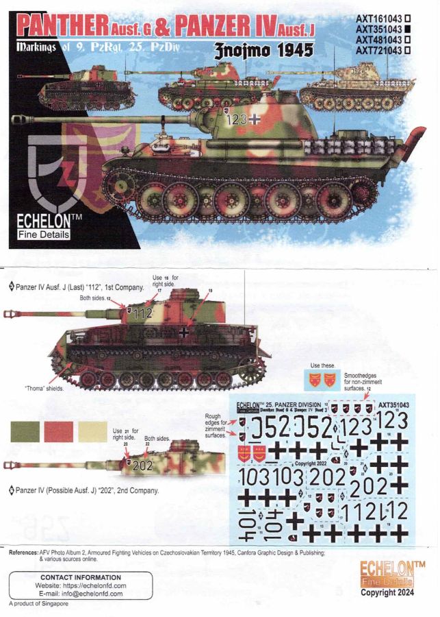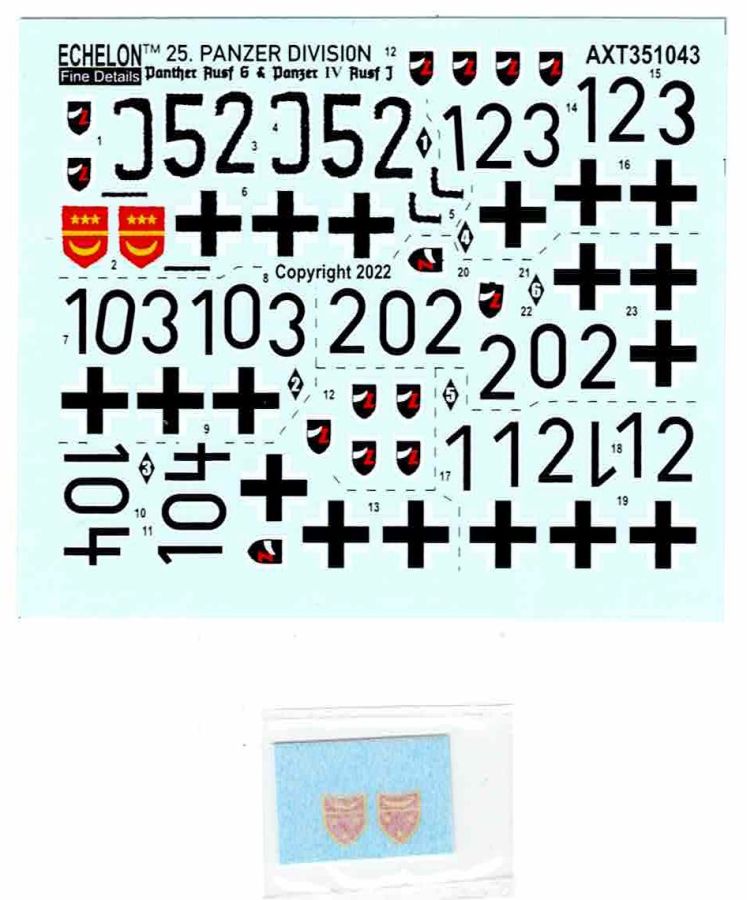 Im Set finden sich Decals für Fahrzeuge des 9. PzReg. der 25. PzDiv. die 1945 im Raum Jnojmo in der tschechischen Republik zum Einsatz kamen. Gleich einmal vorweg, der Erstellung der Decals gehen z.T. recht langwierige Recherchen des Herstellers voran. Wert wird auf möglichst historisch korrekte und belegbare Fakten gelegt. Unter anderem dienten sehr viele Fotos als Grundlage für die Decals, die auf dem Sheet recht dicht gedrängt daherkommen. Die Abbildungen des Beiblatts zeigen deutlich wo die einzelnen Abziehbilder angebracht werden müssen. Ergänzende Texte und weitere Angaben sowie weitergehende Hinweise zu den Fahrzeugen runden alles ab. Fragen sollte es dazu (eigentlich) keine mehr geben. Die Decals sind absolut sauber und im Register gedruckt. Der Trägerfilm ist angenehm knapp bemessen, dünn und sollte auch nicht auftragen. Die Verarbeitung ist völlig problemlos. (Aus eigener Erfahrung. Allerdings sollte generell, wie eigentlich immer, zuerst ein Klarlack (Glanz) aufgebracht werden um ein etwaiges “Silbern” zu verhindern.) Auf jeden Fall ist dieses Set eine sehr gute Alternative zu den üblichen Decals die den Bausätzen beiliegen und nicht unbedingt durch originelle Ausführungen auffallen. Hier stimmt auch das Preis/Leistungs Verhältnis.