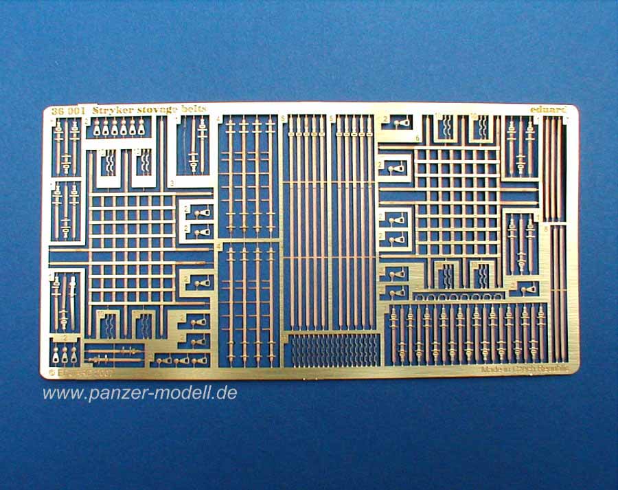 Von Eduard gibt es unter der Art. Nr. 36001 ein wunderbar gemachtes PE Set mit Stryker stowage belts. Hiermit lassen sich die für die Stryker so typischen Gepäcknetze und Zurrriemen wunderbar darstellen. Enthalten ist eine hauchdünne Platine mit zwei kompletten Netzen, den jeweiligen Zurrgurten und den Befestigungsösen. Als Bauanleitung liegt ein doppelseitig bedrucktes DIN A4 Blatt bei mit sauberen, absolut klaren und eindeutigen Zeichnungen. Die Original - Bausatzteile sind hier schwarz, die PE Teile dagegen blau dargestellt.