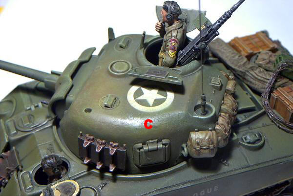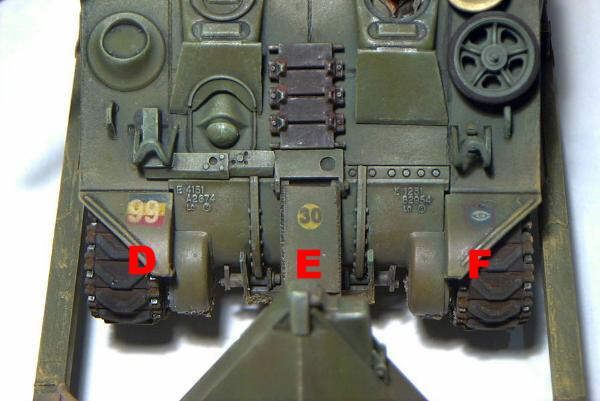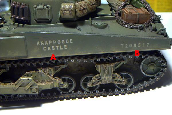 Im linken Bild sehen wir nur eine der manigfaltigen Einsatzmöglichkeiten des Expressmask Satzes "US Army Register". Neben sämtlichen Markierungen, die für US Army und US Marine Corps Fahrzeuge nötig sind, enthält die geätzte Schablone auch eine dreifache Ausfertigung des Alphabets und des Ziffernsatzes von 0-9. Mit diesen Zeichen können ideal die WD Nummern (im Bild "B") von britischen Militärfahrzeugen des 2. Weltkrieges dargestellt werden. Ebenso lassen sich einfach die auf britischen Panzern allgegenwärtigen Spitznamen aufspritzen ("A"). Die einzelnen Ziffern udn Buchstaben werden hierfür einfach in einen setzrahmen gesteckt und abgeklebt - fertig ist die selbst gesetzte Schablone.
