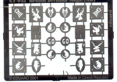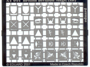 Abgerundet wird die Palette der britischen Expressmask Spritzschablonen vom Satz "Brit. tactical markings". Auch hier ist die Bezeichnung etwas irreführend, da es sich eigentlich um die Formation signs handelt, also Markierungen für Headquartersquadron (Raute), A-Sqn (Dreieck), B-Sqn (Quadrat) und C-Sqn (Kreis). Dieser Satz ist etwas enttäuschend, da alle Zeichen zwar dreifach vorhanden sind, aber nur in einer Größe von 10mm vorliegen - für kleinere Fahrzeuge also viel zu groß. Hier wäre Nachbesserung seitens Eduard wünschenswert. Über die Qualität der 10mm Symbole kann man sich allerdings nur positiv äußern.