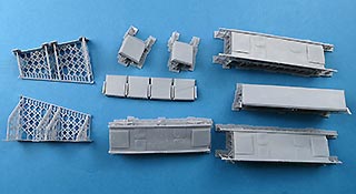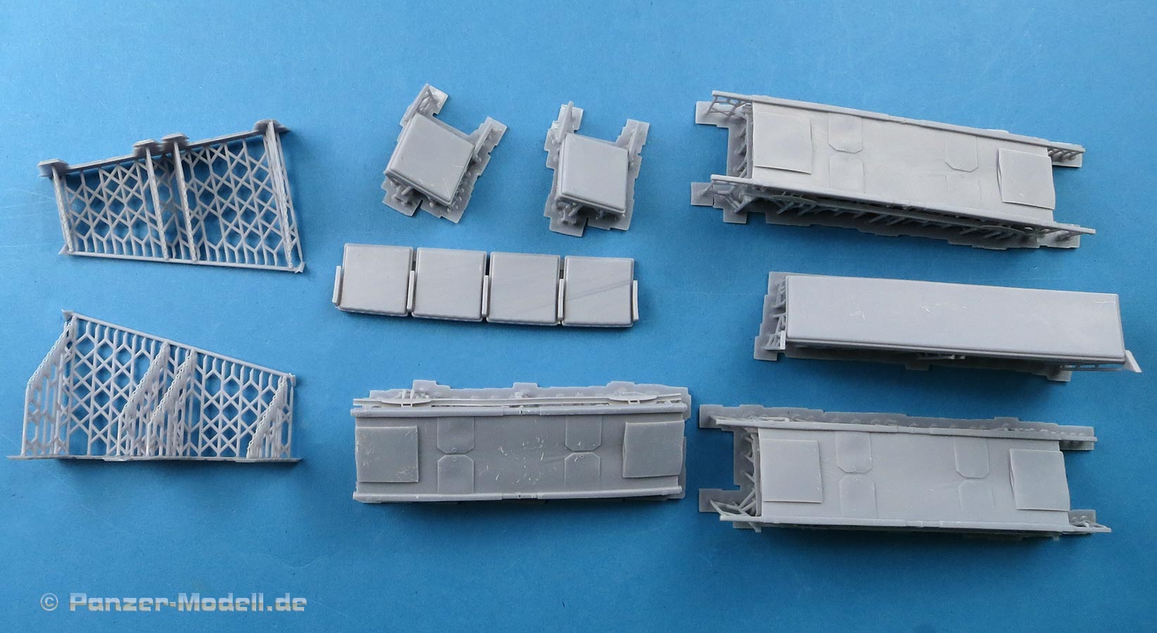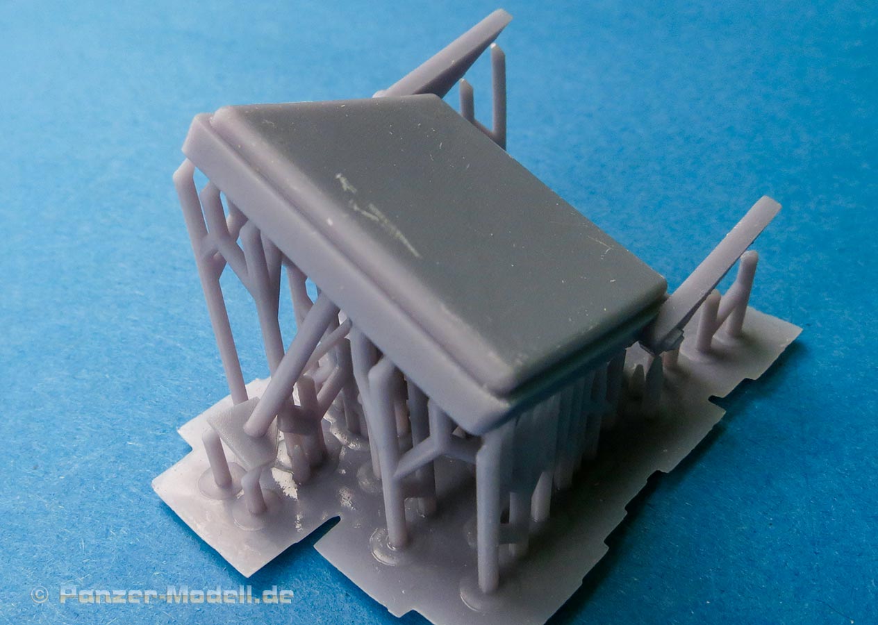 Im Karton finden wir 9 Resin 3D Druckteile auf den Druckplatten mit Stützstrukturen, d.h. hier kommt noch einiges an Versäuberungsarbeit auf uns zu.