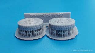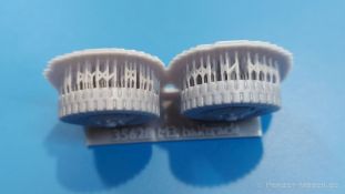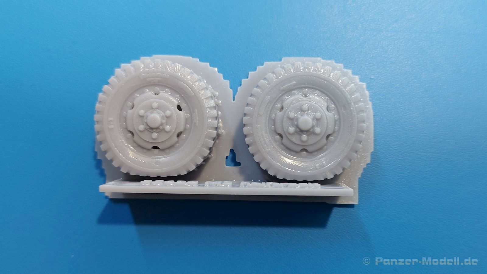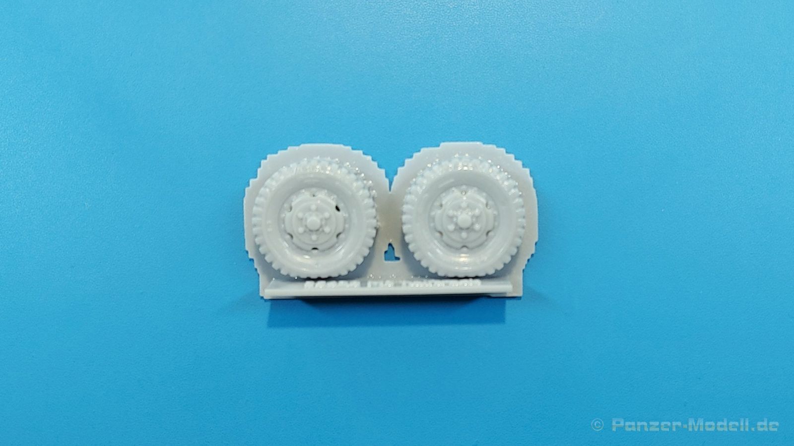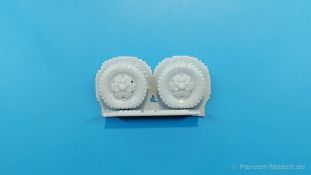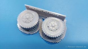 M3 Halftrack weighted wheels for the Dragon kits Belastete Vorderräder für die M3 Halbketten von Dragon präsentiert uns FC Model Trend in einer 105x60x22 mm großen Blisterverpackung. Der Inhalt besteht aus zwei Rädern, die an der Unterseite abgeflacht sind, um das Gewicht des Fahrzeuges auf ebenem Untergrund darzustellen. Das Profil ist gut erkennbar, Reifenhersteller und -größe sind ebenso vorhanden wie die Radmuttern. Da zur Herstellung ein 3D-Druckverfahren angewendet wurde, haben wir viele kleine Angussstellen auf der Rückseite der Räder. Das Material weist eine etwas „speckige“ Oberfläche auf. Leider sind Reifenhersteller und -größenaufdruck nicht lesbar. Der Hersteller könnte bei näherem Betrachten FIRESTONE sein. Auch die Radmuttern sind mir etwas zu rund geraten. Der Hersteller gibt Dragon Modelle als passend für diese Reifen ein, wobei sie auch für andere passend sein könnten. Es gibt keine Bau- und Bemalungsanleitung, denn wo welches der Räder hingehört, sollte sich von selbst erklären. Mit bloßem Auge betrachtet ein brauchbares Set.