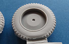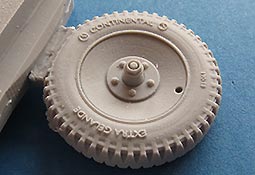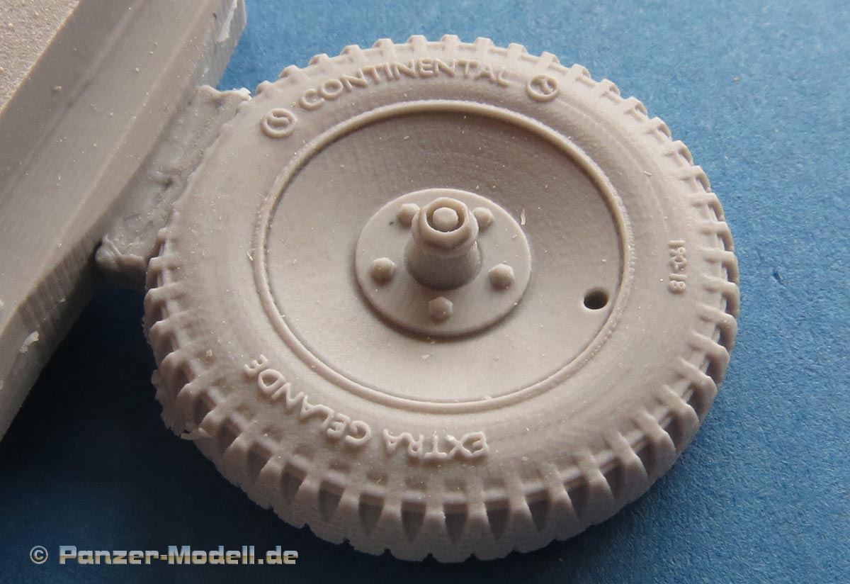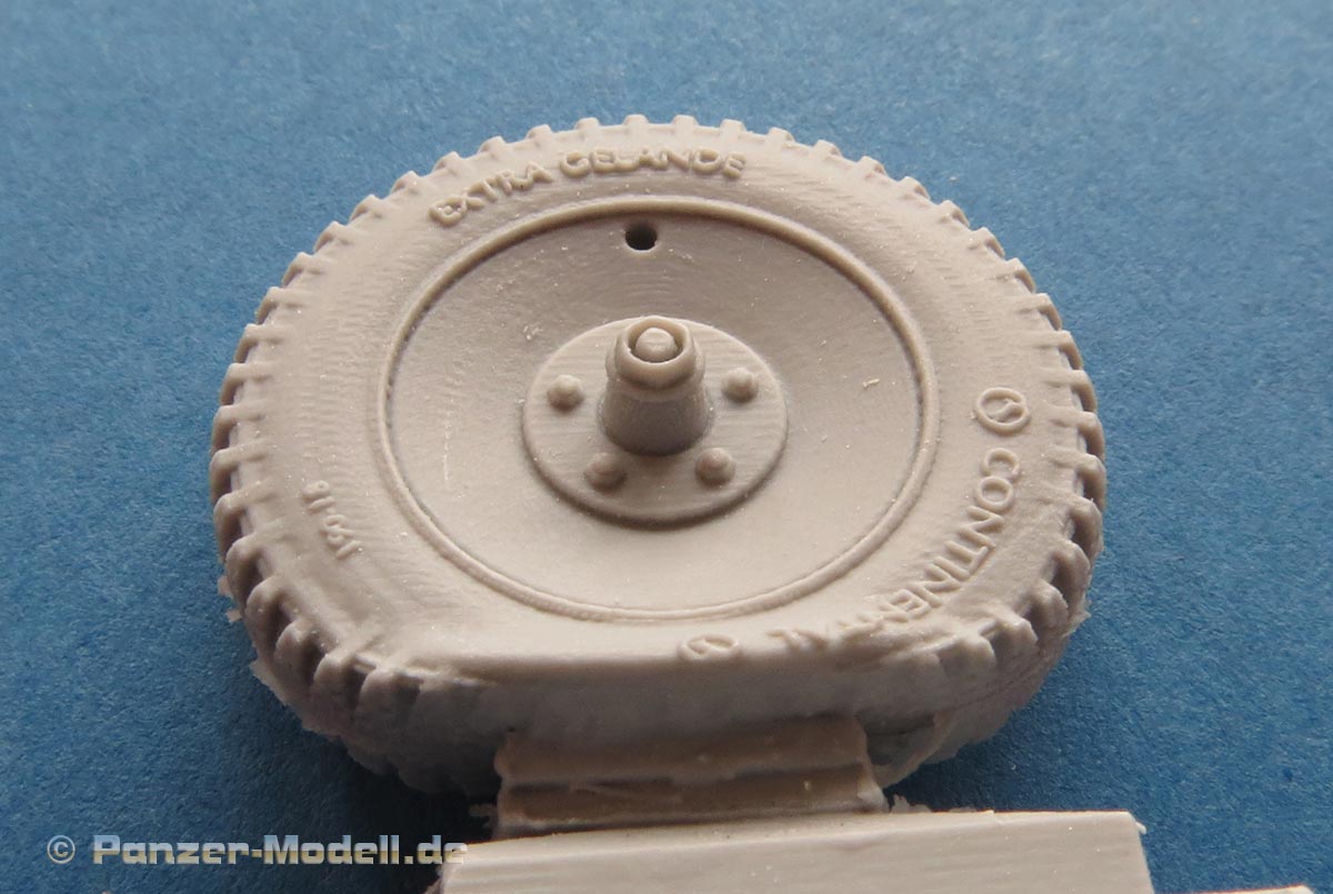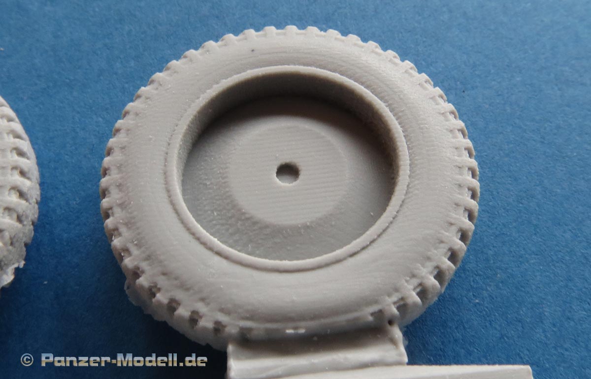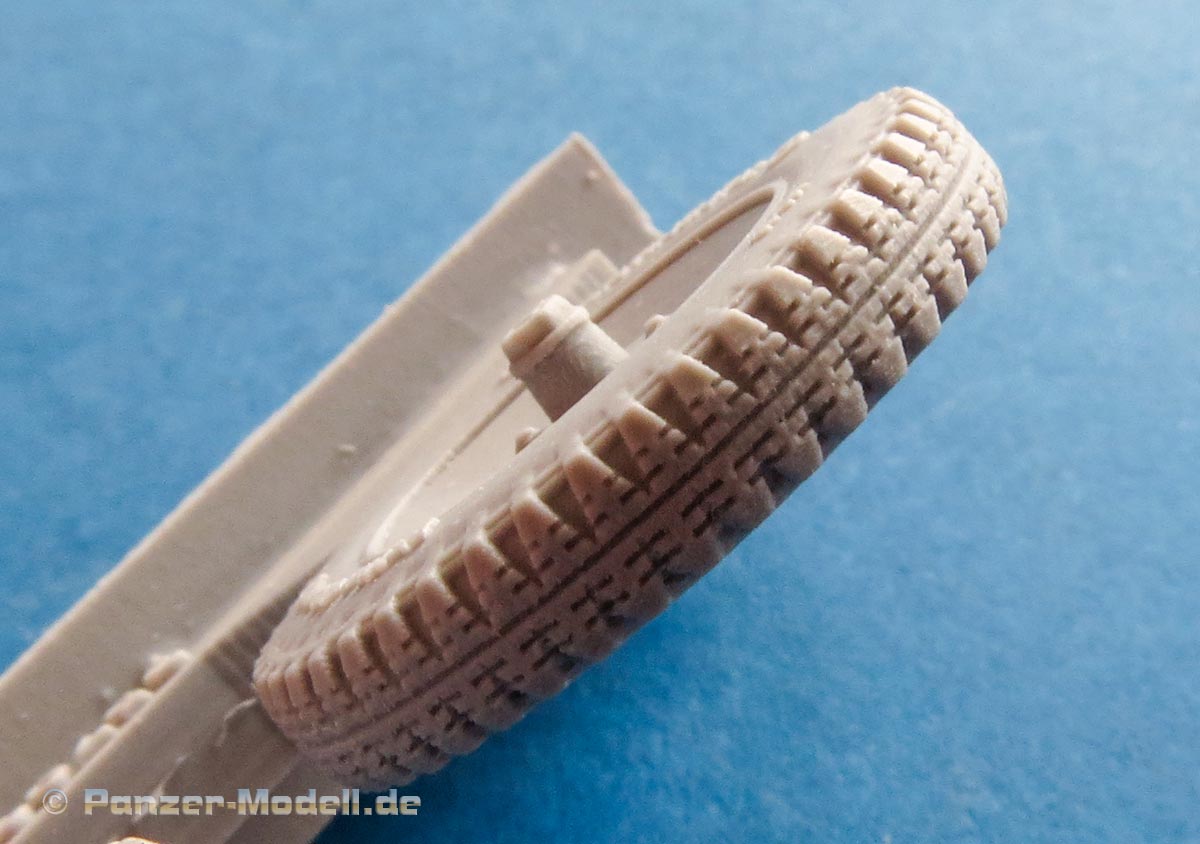 Der Guss ist sauber blasenfrei gegossen. Die moderaten Angüsse befinden sich glücklicherweise unter der abgeplatteten Fläche und somit später auf jeden Fall unsichtbar. Dabei haben wir hier zwei reguläre Reifen im Normalzustand mit leichter Ausbuchtung und einen Reifen, der komplett platt ist.