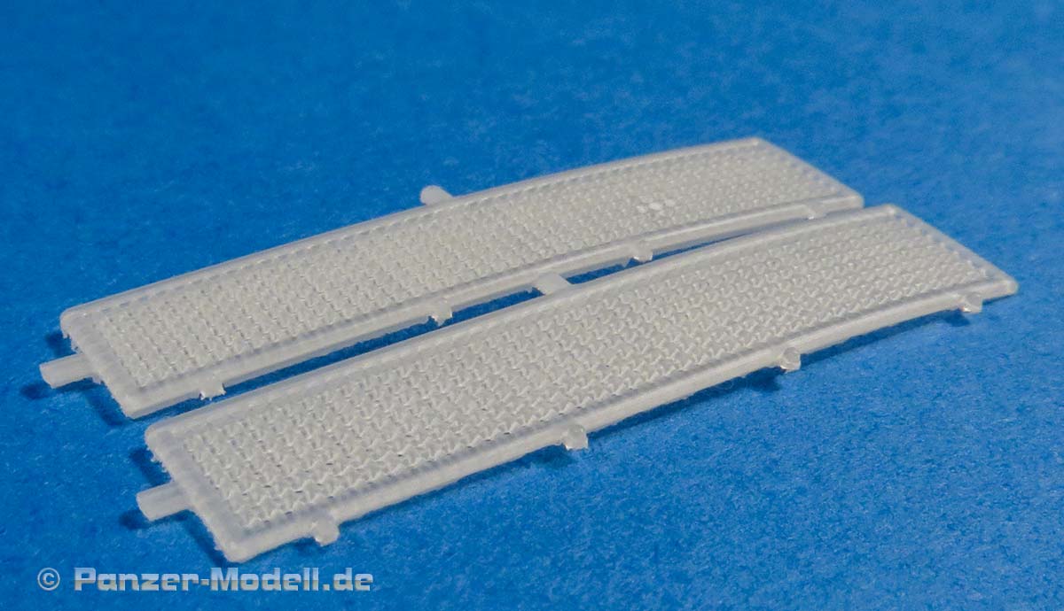 Die Gitterstruktur selber ist fein gedruckt mit allen Durchlässen offen und in der Tat hat man hier das Gefühl von Tiefe. Mir persönlich erscheint die Gitterstruktur eine Spur zu dick/zu stark - vermutlich muss man es wirklich am Modell und mit Farbe drauf sehen um die Wirkung wirklich beurteilen zu können und dann auch nochmal ein Original Gitter dazu sehen.