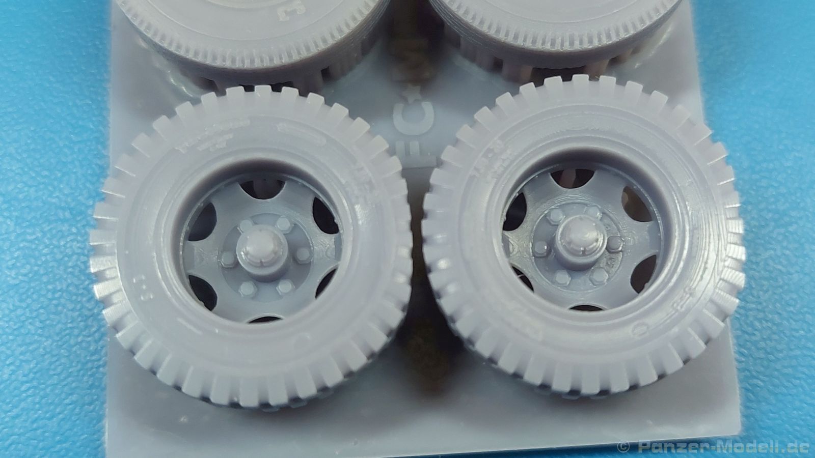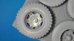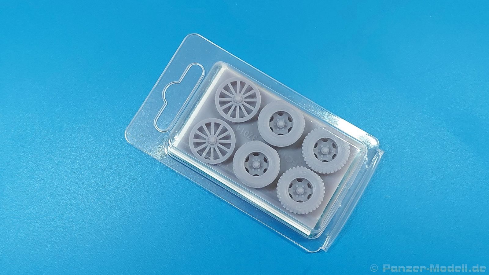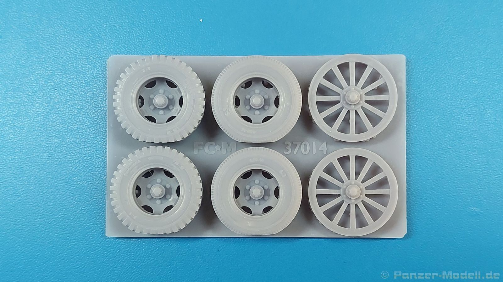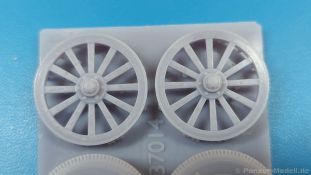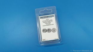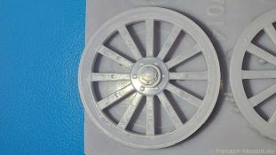 FC Model Trend liefert uns diesmal 3D-gedruckte Holzspeichenräder, sowie belastete Räder für die U.S. amerikanische 75 mm M1 (M116) Pack Howitzer in einer 105x60x22 mm großen Blisterverpackung. Der Inhalt besteht aus insgesamt sechs Rädern. Da wären zum einen zwei Holzspeichenräder mit Eisenbereifung, wie sie auf dem M1 Untergestell genutzt wurden. Eine Holzmaserung ist nicht erkennbar, aber die feinen Eisenreifen und die Naben sind sehr schön nachgebildet. Die anderen vier Räder sind Luftreifen auf Stahlfelge, zwei mit grobem Geländeprofil, zwei mit zivilem Profil. Sie sind an der Unterseite abgeflacht, um das Gewicht der Haubitze auf ebenem Untergrund darzustellen. Die Profile sind gut erkennbar, Reifenhersteller und -größe sind ebenso vorhanden wie die Radmuttern. Da zur Herstellung ein 3D-Druckverfahren angewendet wurde, haben wir viele kleine Angussstellen auf der Rückseite der Räder. Leider sind Reifenhersteller und -größenaufdruck teilweise nicht lesbar. Der Hersteller könnte bei näherem Betrachten FIRESTONE sein. Die Radmuttern sind gut geraten, die Durchbrüche der Felgen sind scharf ausgeführt. Es gibt keine Empfehlung für ein bestimmtes Modell. Es gibt verschiedene Plastik- und Resinmodelle, für die die Räder in Fragen kommen könnten. Eine Bau- und Bemalungsanleitung ist nicht vorhanden. Wo welches der Räder hingehört, sollte sich von selbst erklären. Ein schönes Set, das die Modelle sicherlich aufwertet. Wir bedanken uns bei FC-Model Trend für das Besprechungsmuster.