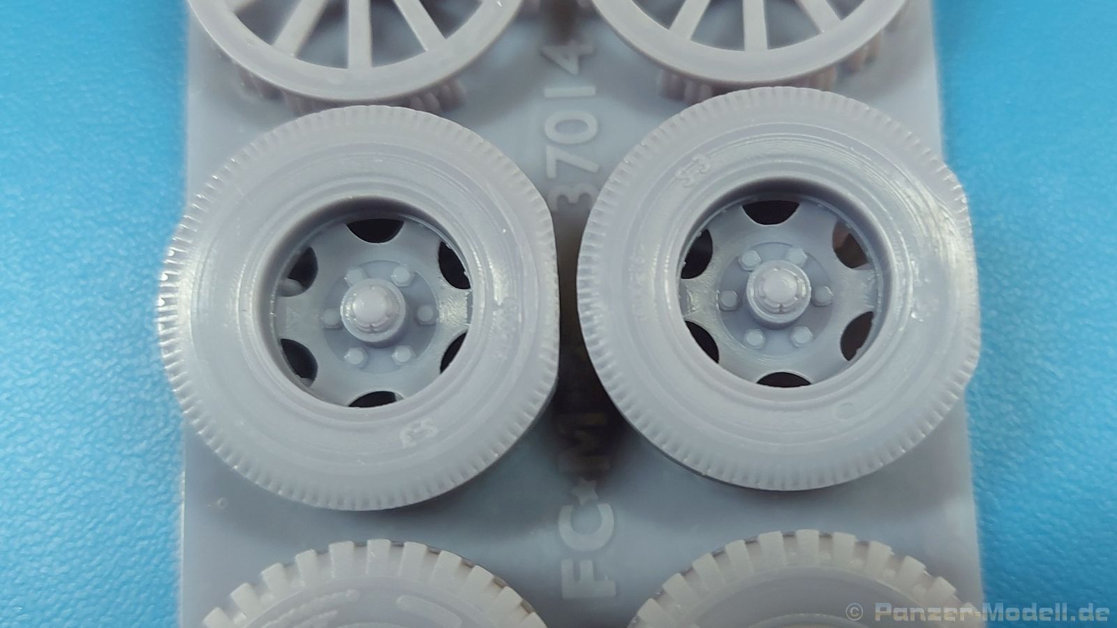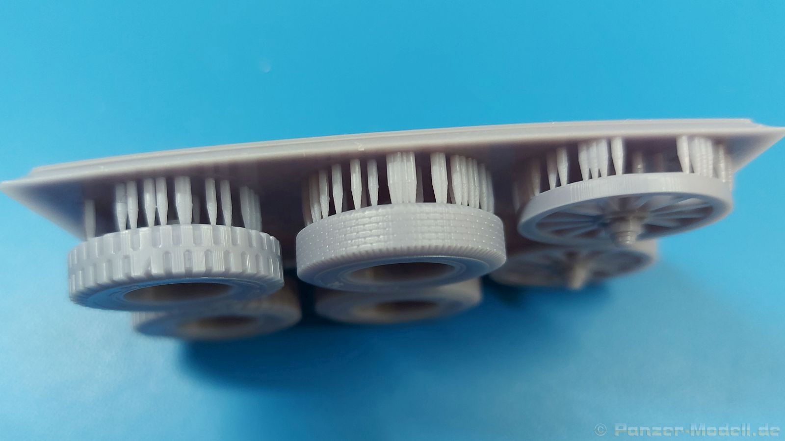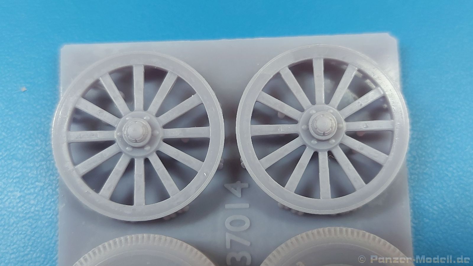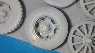 FC Model Trend liefert uns diesmal 3D-gedruckte Holzspeichenräder, sowie belastete Räder für die U.S. amerikanische 75 mm M1 (M116) Pack Howitzer in einer 105x60x22 mm großen Blisterverpackung. Der Inhalt besteht aus insgesamt sechs Rädern. Da wären zum einen zwei Holzspeichenräder mit Eisenbereifung, wie sie auf dem M1 Untergestell genutzt wurden. Eine Holzmaserung ist nicht erkennbar, aber die feinen Eisenreifen und die Naben sind sehr schön nachgebildet. Die anderen vier Räder sind Luftreifen auf Stahlfelge, zwei mit grobem Geländeprofil, zwei mit zivilem Profil. Sie sind an der Unterseite abgeflacht, um das Gewicht der Haubitze auf ebenem Untergrund darzustellen. Die Profile sind gut erkennbar, Reifenhersteller und -größe sind ebenso vorhanden wie die Radmuttern. Da zur Herstellung ein 3D-Druckverfahren angewendet wurde, haben wir viele kleine Angussstellen auf der Rückseite der Räder. Leider sind Reifenhersteller und -größenaufdruck teilweise nicht lesbar. Der Hersteller könnte bei näherem Betrachten FIRESTONE sein. Die Radmuttern sind gut geraten, die Durchbrüche der Felgen sind scharf ausgeführt. Es gibt keine Empfehlung für ein bestimmtes Modell. Es gibt verschiedene Plastik- und Resinmodelle, für die die Räder in Fragen kommen könnten. Eine Bau- und Bemalungsanleitung ist nicht vorhanden. Wo welches der Räder hingehört, sollte sich von selbst erklären. Ein schönes Set, das die Modelle sicherlich aufwertet. Wir bedanken uns bei FC-Model Trend für das Besprechungsmuster.