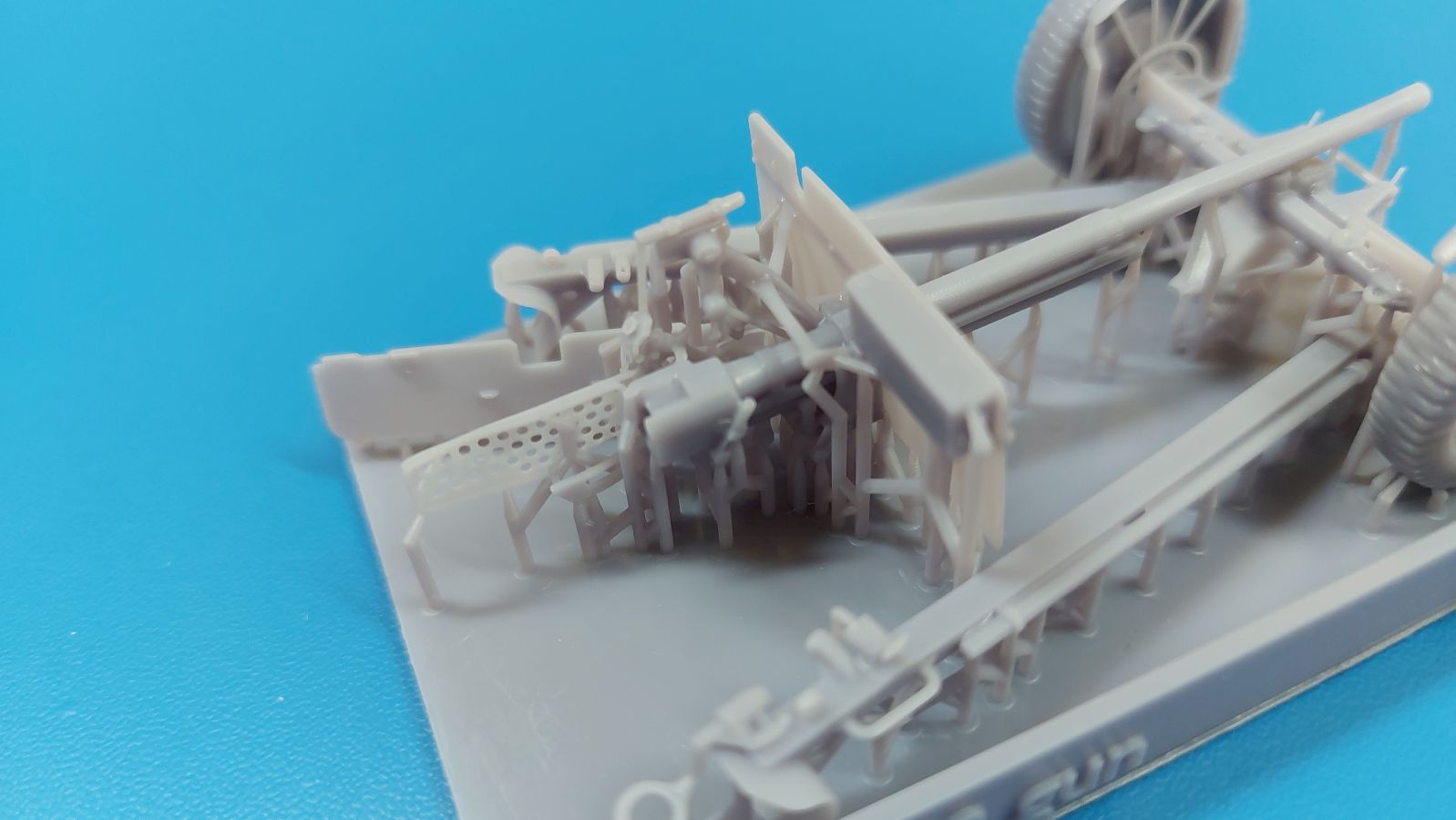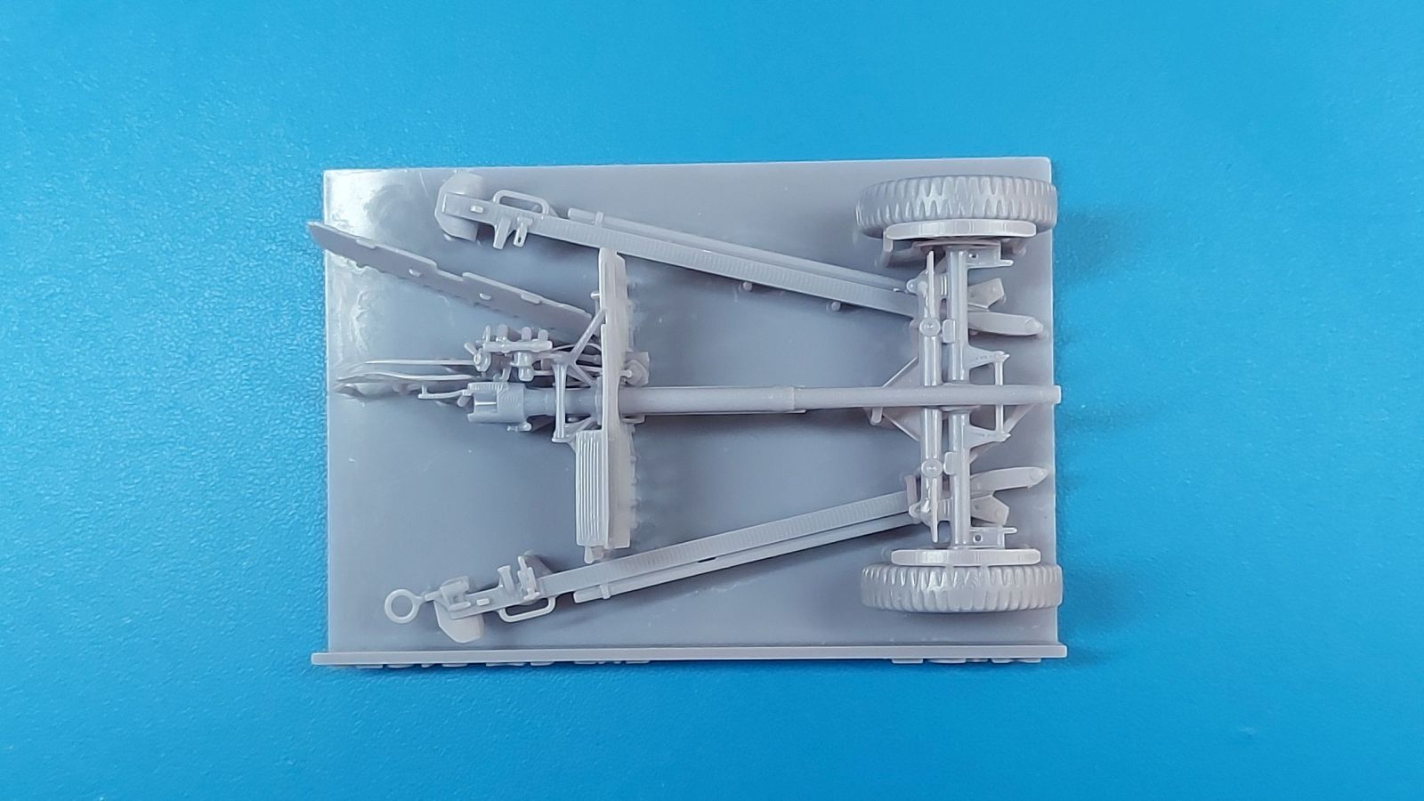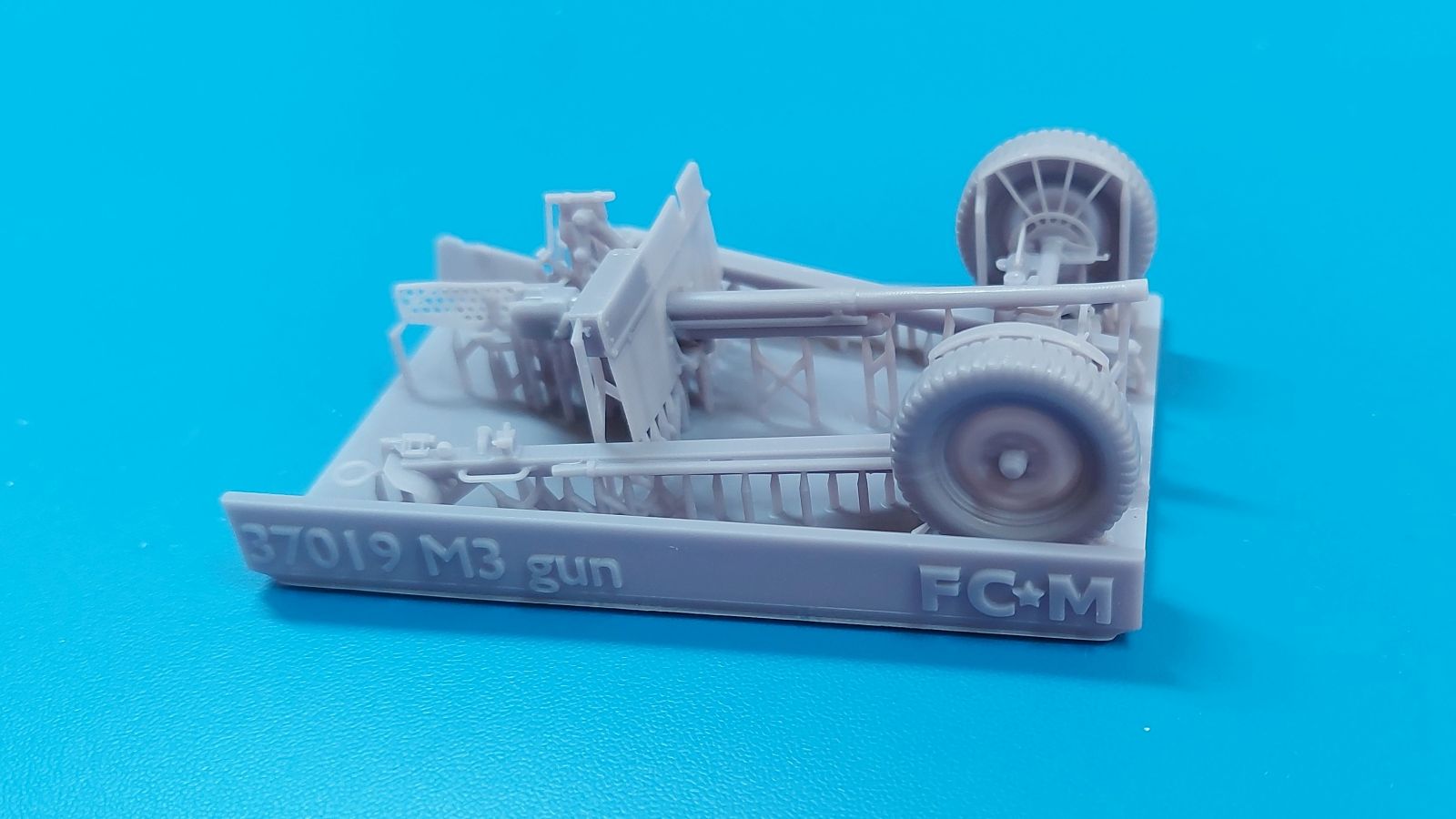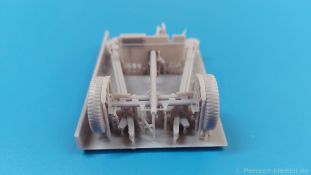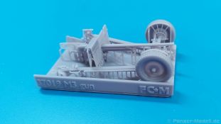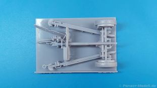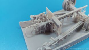 Das Original: Die M3 war eine Panzerabwehrkanone mit einem Kaliber von 37 mm. Sie wurde nach dem Studium zweier in Deutschland gekaufter PaK 36 entwickelt und als gezogenes Geschütz ab 1940 bei der U.S. Infanterie eingesetzt. Die leichte Bauweise erlaubte es, sie z.B. mit einem Jeep oder im Mannschaftszug zu ziehen. Im zweiten Weltkrieg wurde sie in Europa ab 1943 durch die stärkere M1 ersetzt, blieb aber im Pazifikraum bis Ende des Krieges im Einsatz, da sie dort immer noch in der Lage war, die leicht gepanzerten Fahrzeuge der Japaner zu bekämpfen. Die Kanone allein wurde auch in Panzer wie den M3 Lee und den M3/M5 Stuart und den Spähpanzer M8 eingebaut. Der Bausatz: Wenig Teile, aber viele Details - 3D-Druck macht es möglich. Der „Bausatz“ besteht grad einmal aus 5 Teilen. Typisch für 3D-Druck gibt es viele Stützstrukturen, die den Blick auf die eigentlichen Teile etwas verwehren. Die Kontaktstellen sind jedoch klein und fein gehalten, so dass sich die Versäuberung nach dem Abtrennen in Grenzen halten sollte. Damit man nicht etwas abschneidet, was keine Stützstruktur ist, sollte man sich Bilder vom Original besorgen, denn eine Bauanleitung gibt es nicht. Der Druck ist sauber ausgeführt, ohne Fehlstellen und mit extrem scharfen Details. Alle Teile hinterlassen den Eindruck, dass sie dem Original nahekommend herunterskaliert sind, was sich zum Beispiel in der Dicke (bzw. Dünne) des Schutzschildes gut wiederspiegelt. Die 5 Teile sind die Achse mit Geschützlager, Rädern und Hochstellern, die Kanone selbst mit Schutzschild, Hülsenabweiser und Zieloptik, dem unteren Schutzschild und den zwei Stützholmen mit Gradschild und Zugauge. Die Achse hat bereits beide Räder angegossen. Das Profil der Reifen ist gut getroffen, aber die Radmuttern sehen eher wie Nieten aus. Die Hochsteller, die in Feuerstellung die Räder etwas vom Boden abheben, sind sehr fein und offensichtlich in Fahrgestellung angegossen. Die beiden Stützholme lassen kein Detail missen, haben die Grabschaufeln an Ende, Handgriffe und am rechten Holm das Zugauge zum Anhängen an ein Fahrzeug. Die rechteckigen Profile zur Befestigung an der Achse sind innen hohl. Der untere Schutzschild ist separat gedruckt und kann somit hochgeklappt in Fahrstellung oder heruntergeklappt in Feuerstellung montiert werden. Der wahre Hingucker ist die Kanone selbst. Das Rohr ist schnurgerade, die Mündung tief ausgehöhlt, der Verschlussblock mit geschlossenem Verschluss und Öffnerhebel versehen. Der Schutzschild ist hauchdünn und mit Nieten versehen. Ein Stau-/Werkzeugkasten ist an der Rückseite „angedruckt“. Der Hülsenabweiser ist wie beim Original sauber gelocht, hat an der Oberkante eine leichte Delle, die man geradebiegen müsste. Wie die Handräder zur Höhen-/Seitenrichtung ist auch die Zieloptik angegossen. Sie sitzt leider ca. 2,5 mm zu weit nach rechts, denn eigentlich sollte sie sich hinter dem Schlitz im Schutzschild befinden. Ob sich das korrigieren lässt, kann man wohl erst nach dem Abtrennen der Stützstrukturen erkennen. Eine Bauanleitung gibt es nicht, aber man sollte die M3 intuitiv anhand des Verpackungsbildes oder unter Zuhilfenahme von Referenzfotos aus dem Internet zusammenbekommen. Letztere sind wohl auch für die Bemalung wichtig. Ein sehr gelungener Wurf einer M3, von der es leider nur sehr wenige Modelle am Markt gibt. Die Delle im Abweiser kann man auch als Einsatzbeschädigung deklarieren, bliebe also nur die Korrektur an der Optik. Etwas mehr Modellbauerfahrung, eine ruhige Hand und entsprechender Klebstoff für Resin sind notwendig. In Deutschland wird dieses Modell zwischen 15-17€ gehandelt.