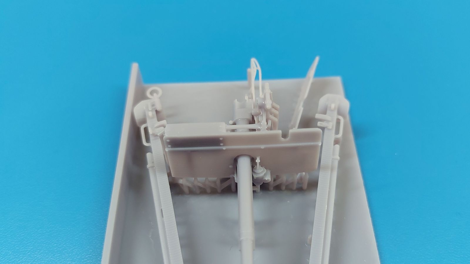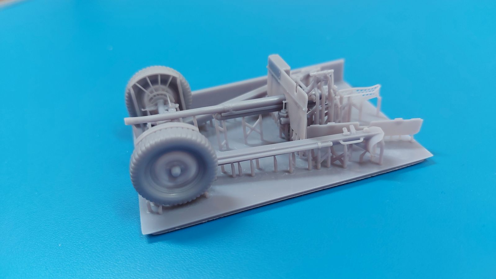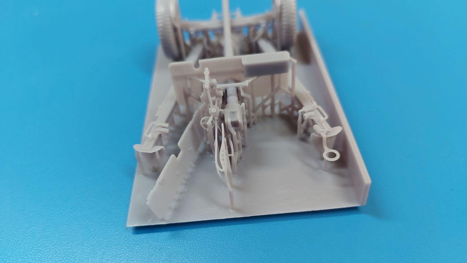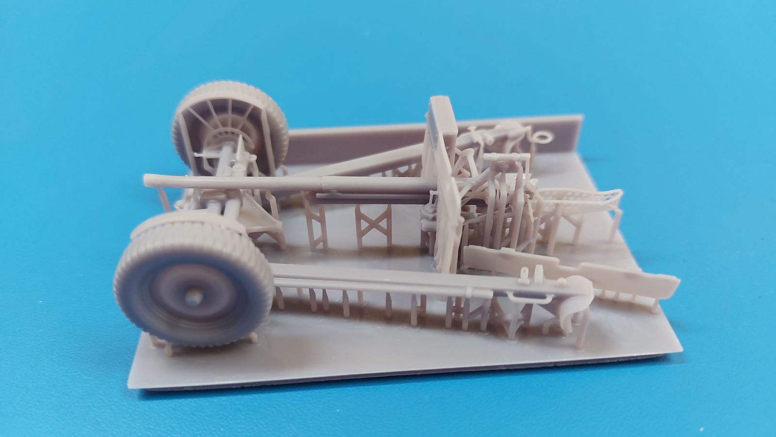 Das Original: Die M3 war eine Panzerabwehrkanone mit einem Kaliber von 37 mm. Sie wurde nach dem Studium zweier in Deutschland gekaufter PaK 36 entwickelt und als gezogenes Geschütz ab 1940 bei der U.S. Infanterie eingesetzt. Die leichte Bauweise erlaubte es, sie z.B. mit einem Jeep oder im Mannschaftszug zu ziehen. Im zweiten Weltkrieg wurde sie in Europa ab 1943 durch die stärkere M1 ersetzt, blieb aber im Pazifikraum bis Ende des Krieges im Einsatz, da sie dort immer noch in der Lage war, die leicht gepanzerten Fahrzeuge der Japaner zu bekämpfen. Die Kanone allein wurde auch in Panzer wie den M3 Lee und den M3/M5 Stuart und den Spähpanzer M8 eingebaut. Der Bausatz: Wenig Teile, aber viele Details - 3D-Druck macht es möglich. Der „Bausatz“ besteht grad einmal aus 5 Teilen. Typisch für 3D-Druck gibt es viele Stützstrukturen, die den Blick auf die eigentlichen Teile etwas verwehren. Die Kontaktstellen sind jedoch klein und fein gehalten, so dass sich die Versäuberung nach dem Abtrennen in Grenzen halten sollte. Damit man nicht etwas abschneidet, was keine Stützstruktur ist, sollte man sich Bilder vom Original besorgen, denn eine Bauanleitung gibt es nicht. Der Druck ist sauber ausgeführt, ohne Fehlstellen und mit extrem scharfen Details. Alle Teile hinterlassen den Eindruck, dass sie dem Original nahekommend herunterskaliert sind, was sich zum Beispiel in der Dicke (bzw. Dünne) des Schutzschildes gut wiederspiegelt. Die 5 Teile sind die Achse mit Geschützlager, Rädern und Hochstellern, die Kanone selbst mit Schutzschild, Hülsenabweiser und Zieloptik, dem unteren Schutzschild und den zwei Stützholmen mit Gradschild und Zugauge. Die Achse hat bereits beide Räder angegossen. Das Profil der Reifen ist gut getroffen, aber die Radmuttern sehen eher wie Nieten aus. Die Hochsteller, die in Feuerstellung die Räder etwas vom Boden abheben, sind sehr fein und offensichtlich in Fahrgestellung angegossen. Die beiden Stützholme lassen kein Detail missen, haben die Grabschaufeln an Ende, Handgriffe und am rechten Holm das Zugauge zum Anhängen an ein Fahrzeug. Die rechteckigen Profile zur Befestigung an der Achse sind innen hohl. Der untere Schutzschild ist separat gedruckt und kann somit hochgeklappt in Fahrstellung oder heruntergeklappt in Feuerstellung montiert werden. Der wahre Hingucker ist die Kanone selbst. Das Rohr ist schnurgerade, die Mündung tief ausgehöhlt, der Verschlussblock mit geschlossenem Verschluss und Öffnerhebel versehen. Der Schutzschild ist hauchdünn und mit Nieten versehen. Ein Stau-/Werkzeugkasten ist an der Rückseite „angedruckt“. Der Hülsenabweiser ist wie beim Original sauber gelocht, hat an der Oberkante eine leichte Delle, die man geradebiegen müsste. Wie die Handräder zur Höhen-/Seitenrichtung ist auch die Zieloptik angegossen. Sie sitzt leider ca. 2,5 mm zu weit nach rechts, denn eigentlich sollte sie sich hinter dem Schlitz im Schutzschild befinden. Ob sich das korrigieren lässt, kann man wohl erst nach dem Abtrennen der Stützstrukturen erkennen. Eine Bauanleitung gibt es nicht, aber man sollte die M3 intuitiv anhand des Verpackungsbildes oder unter Zuhilfenahme von Referenzfotos aus dem Internet zusammenbekommen. Letztere sind wohl auch für die Bemalung wichtig. Ein sehr gelungener Wurf einer M3, von der es leider nur sehr wenige Modelle am Markt gibt. Die Delle im Abweiser kann man auch als Einsatzbeschädigung deklarieren, bliebe also nur die Korrektur an der Optik. Etwas mehr Modellbauerfahrung, eine ruhige Hand und entsprechender Klebstoff für Resin sind notwendig. In Deutschland wird dieses Modell zwischen 15-17€ gehandelt.