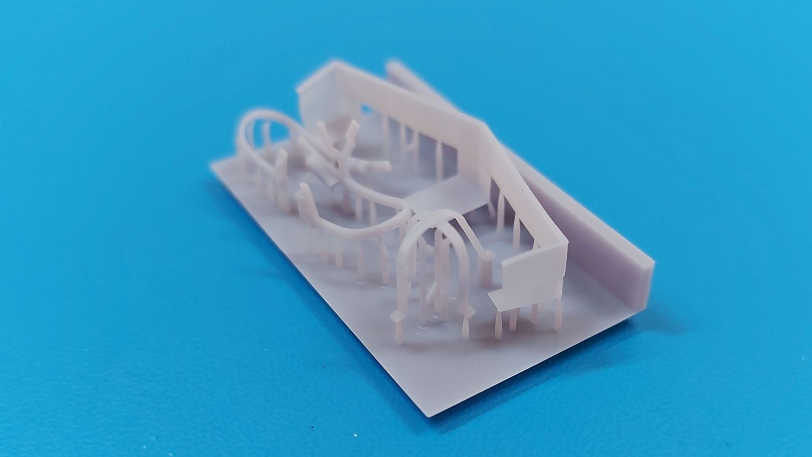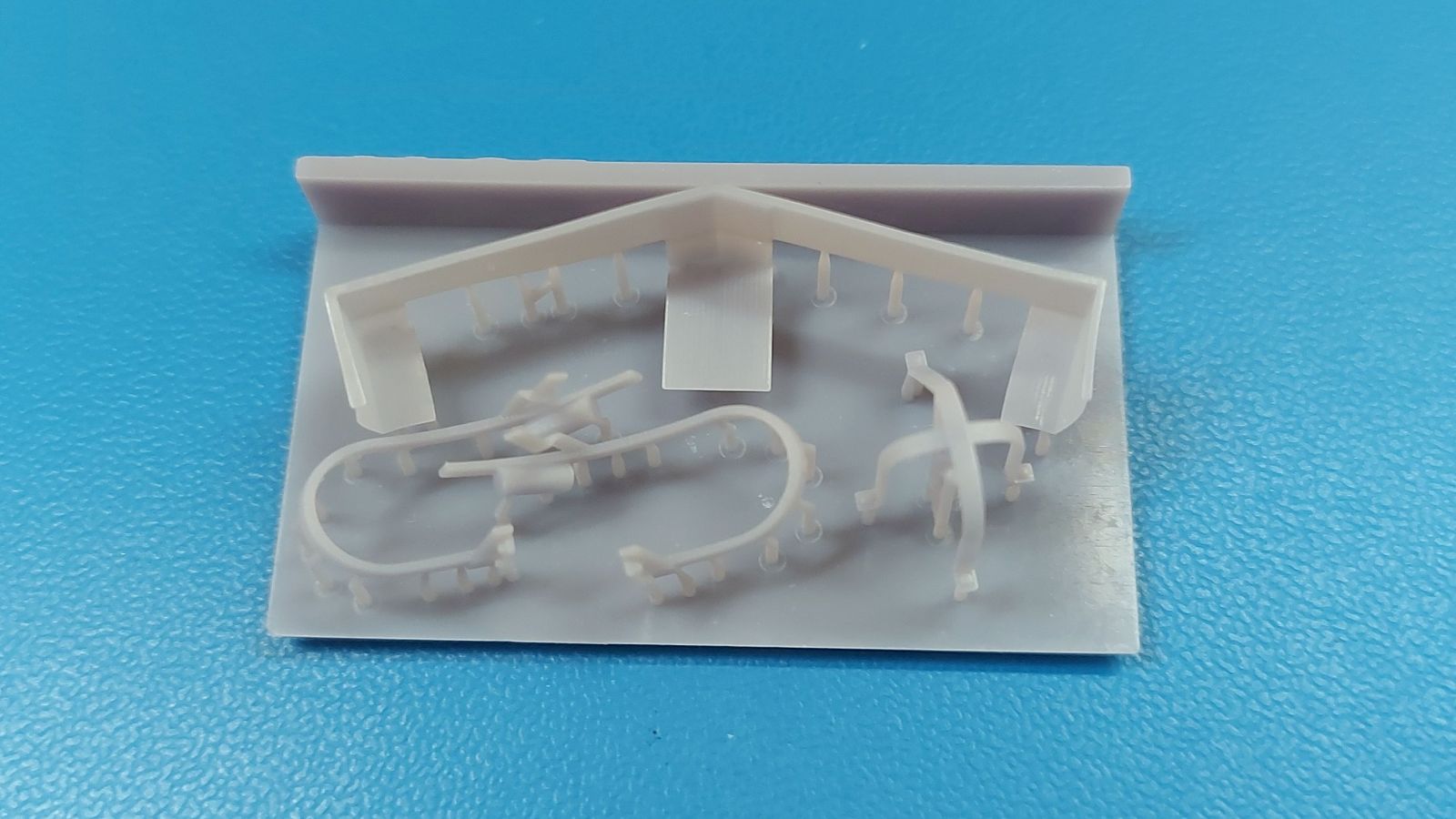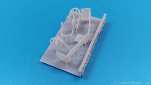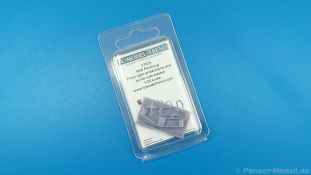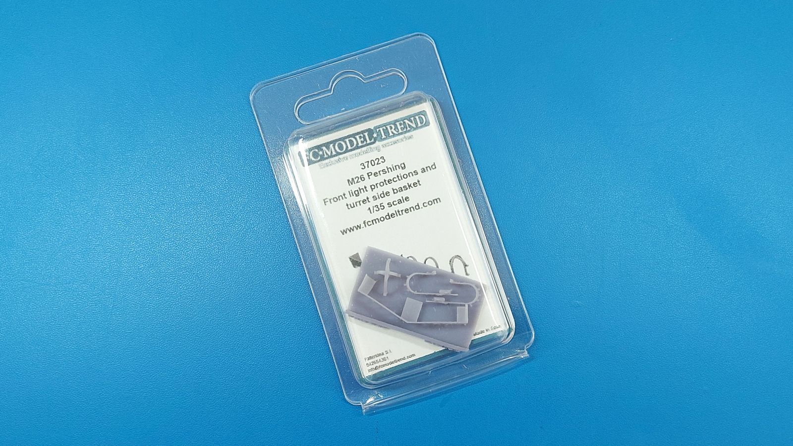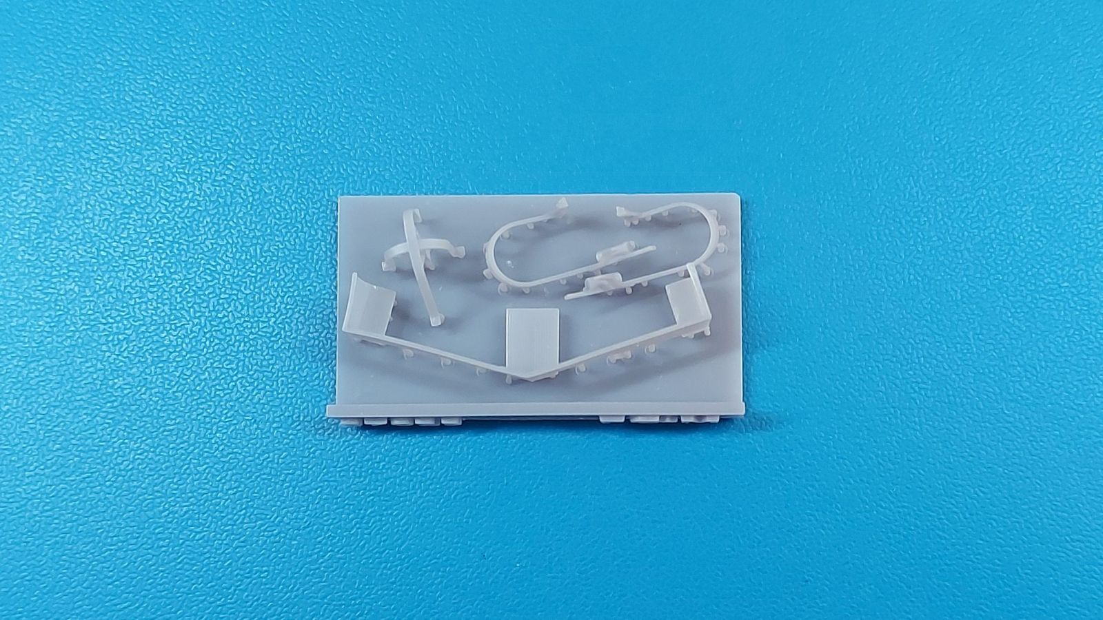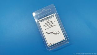 Für den M26 Pershing produziert FC Model Trend im 3D-Druckverfahren Schutzbügel für die Frontscheinwerfer und Hupe, sowie den kleinen Staukorb für die rechte Turmseite. Die 3D gedruckten Teile sind sehr fein und sauber ausgedruckt. In der Nahaufnahme sind sogar Schraubenköpfe zu erkennen. Es gibt zwei Schutzbügel für die Frontscheinwerfer, entsprechend für links und rechts und einen für die Hupe. Der Turmstaukorb besteht aus einem Teil. Die Materialstärke ist maßstäblich sehr gut wiedergegeben und damit im Maßstab 1:35 sehr, sehr dünn. 3D-Druck typisch sind die Teile an sehr feinen Stützstrukturen befestigt. Auch wenn die Strukturen sehr fein sind, empfiehlt sich entsprechende Vorsicht beim Abtrennen, um die dünnen Teile nicht zu beschädigen. Eine Bauanleitung gibt es nicht. Man orientiert sich an den Plastikteilen des Modells und tauscht diese dann entsprechend aus. Sicherlich eine Verbesserung für ein M26 Modell. Wir bedanken uns bei FC-Model Trend für das Besprechungsmuster.