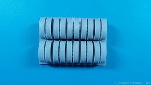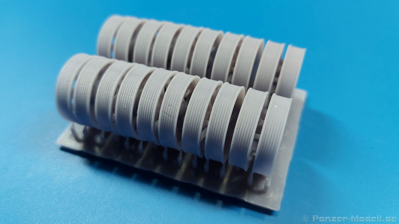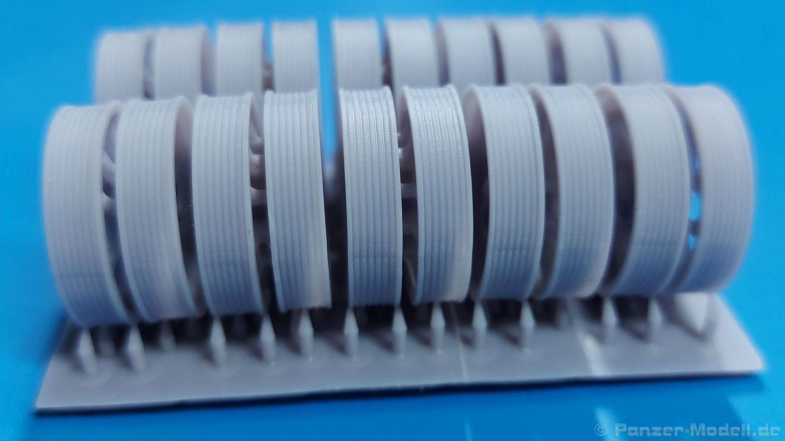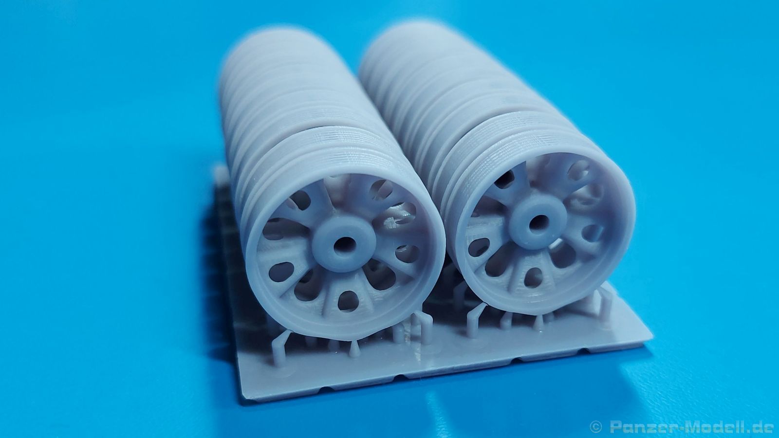 T-34 burnt starfish wheels FC Model Trend spricht diesmal Vignetten-/Dioramenbauer an, die einen beschädigten oder zerstörten T-34 darstellen möchten. In einer 180x90x35 mm großen Blisterverpackung befindet sich ein Satz verbrannte Laufrollen für ein komplettes Fahrzeug. Die Räder sind paarweise auf einer Druckbasis aufgedruckt. Die Stützstrukturen befinden sich fast nur unten an den Laufflächen der Räder und verjüngen sich zu minimalen Angüssen an den Teilen, was ein erleichtertes Abtrennen und nur minimale Versäuberungsarbeiten mit sich bringt. Die Speichenräder mit Seestern Muster (Starfish wheels) habe ich an T-34 im 2. Weltkrieg so noch nicht entdeckt und würde sie somit eher in einer Zeit des Koreakriegs oder Mittelost-Konflikten anordnen. Besonders die Speichen sind fein gedruckt mit sauberen, runden Durchbrüchen. Außen sie die Achsnaben mit angedruckt. Da es sich um verbrannte Räder handeln soll, ist keine Gummilauffläche vorhanden, sondern nur die Felgen, auf denen man feine Rillen auf den Auflageflächen erkennen kann. Prinzipiell sollten die Räder auf jedes gängige T-34/85 Modell der entsprechenden Zeitperiode passen. Gegebenenfalls muss wohl die Achslöcher etwas aufbohren, aber das stellt man beim ersten Trockenanpassen selbst fest. Eine Bau- und Bemalungsanleitung ist nicht vorhanden, aber die Verwendung sollte sich von selbst verstehen. Ein gutes Set für einen Panzer oder auch für mehrere, falls man nur beschädigte, teilzerstörte Panzer darstellen möchte. Der Preis von um die 32 Euro in Deutschland empfinde ich trotz der Qualität schon etwas heftig.