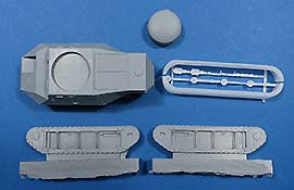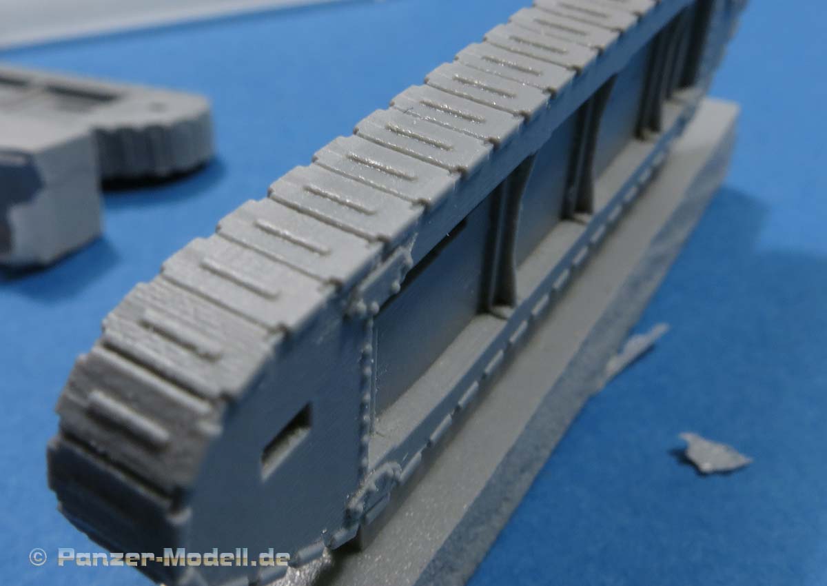 Die beiden Kettenlaufwerke sind jeweils auch einteilig und können einfach an den Panzerkasten angeklebt werden. Auch hier erfreuen die ganzen bereits aufgeprägten Details der Nieten, Streben, Bleche und natürlich der umlaufenden Kette. Das sieht richtig gut aus.