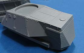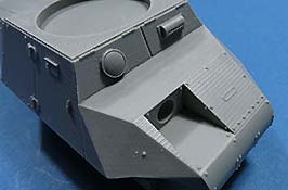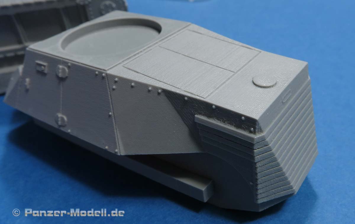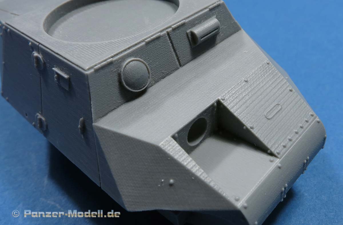 Der Panzerkasten ist einteilig mit schönen Details bereits aufgeprägt mit Lüfterrippen, Scharnieren, Nieten, etc. Allerdings sieht man in der extremen Nahansicht auch, dass das Master aus dem 3D Drucker kommt, denn die Flächen weisen ganz feine Drucklinien auf. Mit bloßen auge sind die aber quasi unsichtbar.