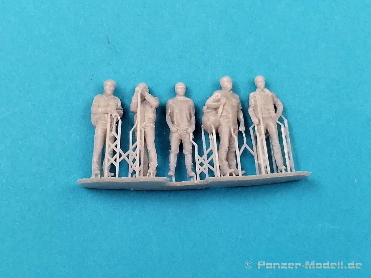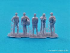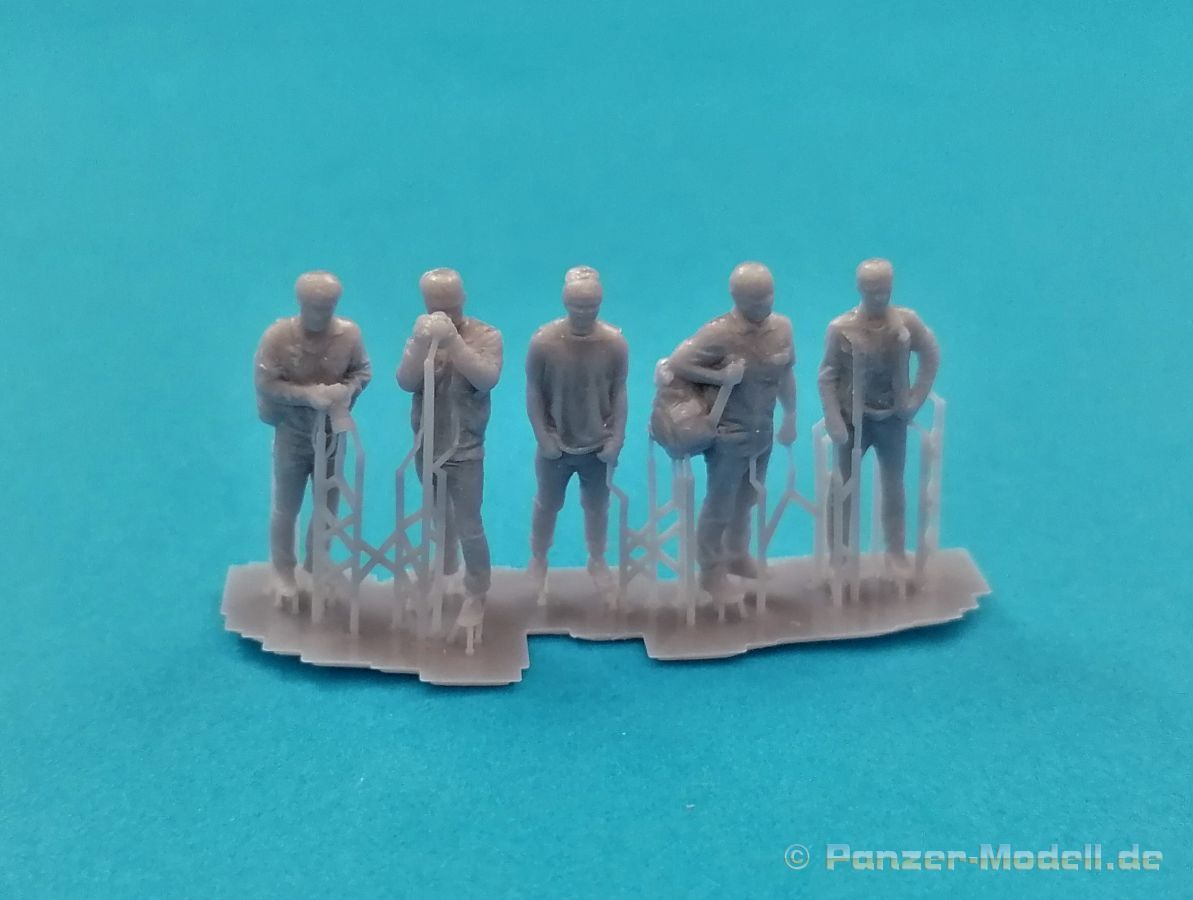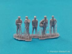 In der Blisterpackung befinden sich fünf männliche Figuren die im heutigen Zeitraum angesiedelt sind. Auf den ersten Blick machen die Figuren, im 3D-Druck hergestellt und Resin abgegossen keinen schlechten Eindruck. Die Angußpunkte der Füßchen sind angenehm klein und dürften sich gut entfernen lassen. Bei näherer Betrachtung machen die Figuren aber einen verschwommenen und verwaschenen Eindruck. Scharfe Details sucht man hier vergebens. Auch die Gesichter sind für mich nur rudimentär wiedergegeben. Wahrscheinlich ist der 3D-Drucker des Herstellers an seiner Leistungsgrenze bei dem Maßstab angelangt. (Meine Kamera auch! J) Was aus dem Set über die Bemalung herausgeholt werden kann will und kann ich an dieser Stelle nur mutmaßen. Sicherlich sind die Figuren aber noch für den Hintergrund geeignet. Auf jeden Fall sollte man sich von der Boxart (CAD Grafik) nicht täuschen lassen. Der Inhalt hält nicht das was die Verpackung verspricht. Aus meiner Sicht können die Kameraden mit herkömmlichen Figuren aus Resin nicht mithalten.