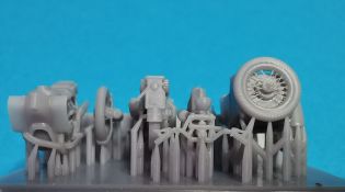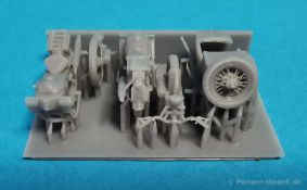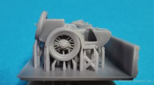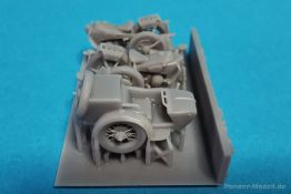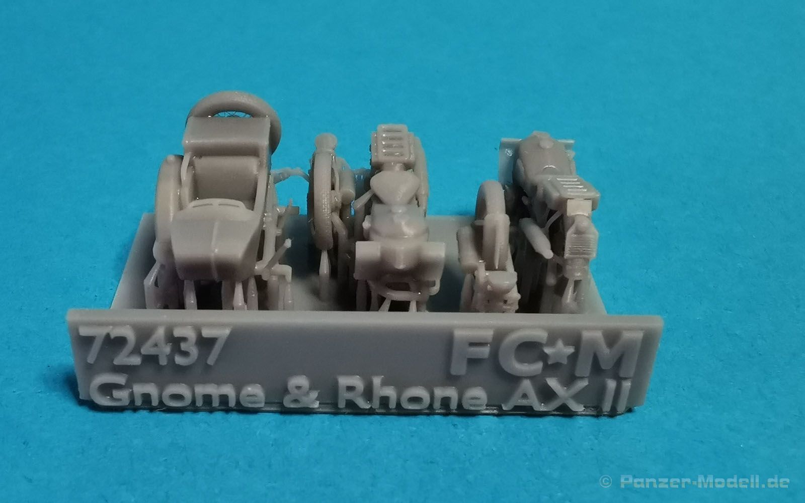 FC Model trend beschert uns mit der Art. Nr. 72437 die Modelle der Gnome et Rhône im Maßstab 1:72, je einmal als Gespann mit Seitenwagen und einmal als Solo-Motorrad. Der französische Motorradhersteller Gnome et Rhône produzierte diese Maschinen von 1937 bis 1945. Sie wurden überwiegend für die militärische Nutzung gebaut. Vor dem zweiten Weltkrieg wurden die AX II Maschinen hauptsächlich nach Polen, in die Tschechoslowakei und in die Sowjetunion geliefert. Von der deutschen Wehrmacht wurden die AX II als Beutemotorräder während des Afrikafeldzuges eingesetzt. Doch nun zum Bausatz. Das graue Plastikmaterial macht insgesamt einen guten Eindruck. Die einzelnen Bauteile sind recht komplex gehalten. So sind die Motorradrümpfe komplett gegossen, lediglich das Komplettbauteil, (bestehend aus Vorderrad mit Gabel und Lenker), muss an den Rumpf angebaut werden. Der Seitenwagen ist als einzelnes Bauteil konstruiert. Die einzige Schwierigkeit sehe ich beim Abtrennen der Gußstützen von den, zum Teil, sehr feinen Bauteilen wie zum Beispiel dem Vorderrad mit Lenker. Hier muss sehr sorgfältig und mit Vorsicht gearbeitet werden. Leider sind die sehr filigranen Speichen in den Rädern zum Teil nicht vorhanden bzw. mit starken Unebenheiten versehen. Das schmälert den Gesamteindruck ganz erheblich. Siehe dazu die beiden letzten Fotos. Eine Bauanleitung ist nicht vorhanden. Die ist aber auch nicht erforderlich. Das Packungsfoto zeigt den Beiwagen an der rechten Seite des Motorrades montiert. Das Vorderrad mit Lenker an die Rümpfe anzubauen, dürfte auch keine Schwierigkeit darstellen.