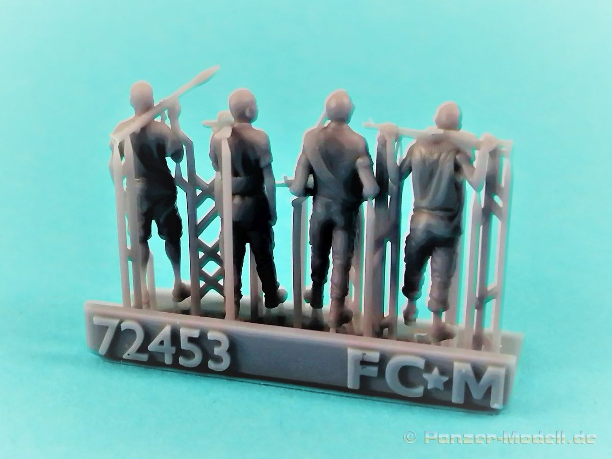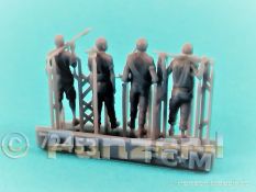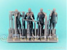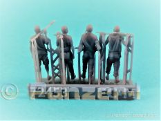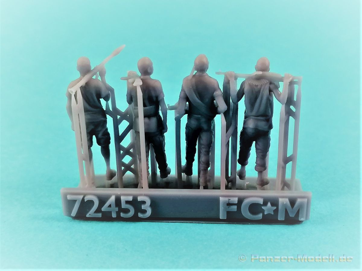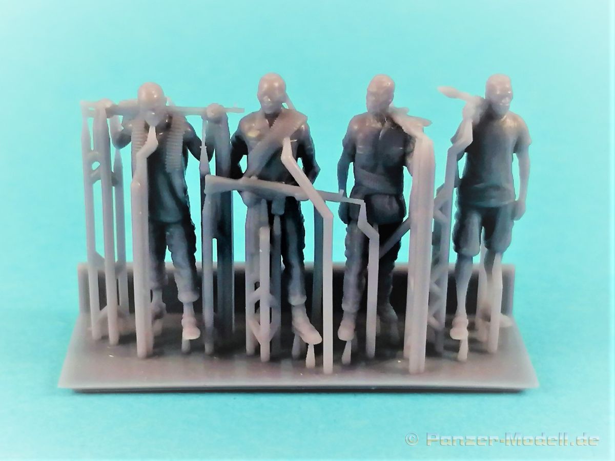 African Warlords militia Vier Druckteile in 1:72 befinden sich in der Blisterverpackung. Das sind vier Figuren die in einem Stück gedruckt sind und typische afrikanische Warlords darstellen sollen. Der Druck macht auf den ersten Blick einen ordentlichen Eindruck. Die Figuren stehen in einer lockeren Pose, ausgestattet mit unterschiedlichen Waffen. Auf den zweiten Blick offenbaren sich doch Mankos die eventuell dem Maßstab geschuldet sein dürften. So dürfte das Heraustrennen der Figuren aus den Streben schon die erste große Herausforderung sein. Bei der linken und der nächsten Figur sind die Streben teilweise mit den Figuren verschmolzen. Häufig nicht klar ersichtlich ist es wo die Strebe aufhört und die Figur beginnt. Kommen wir zu den Figuren Umgehängte Patronengurte und hochgerollte Hosenbeine sind z.B. zu erkennen und wirken im ersten Moment nicht so schlecht. Auch Sandalen sind mit gedruckt, aber eher zu erahnen sind statt scharf definiert zu sein. Gleichfalls typisch umgesetzt wurde auch die Kleidung. Leider wirkt alles etwas flach, schwammig und unscharf. Für die Köpfe gilt das ebenfalls. Scharfe und knackige Details sind nicht unbedingt auszumachen. Eine Figurengruppe die etwas aus dem Rahmen fällt.