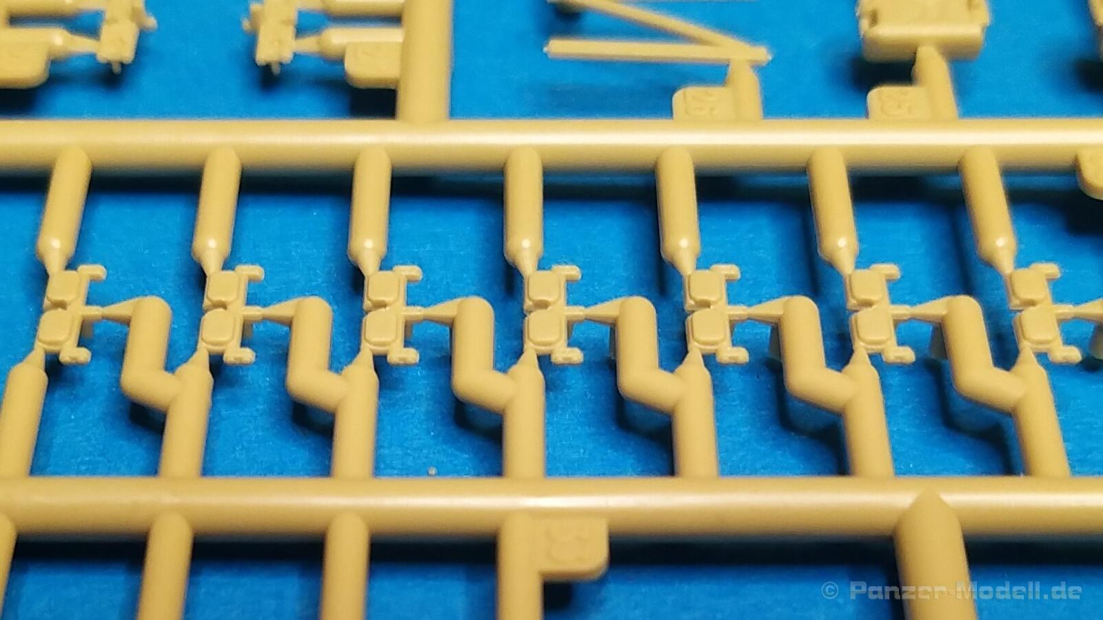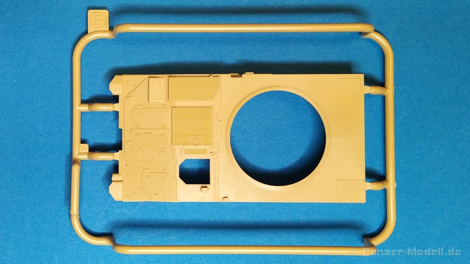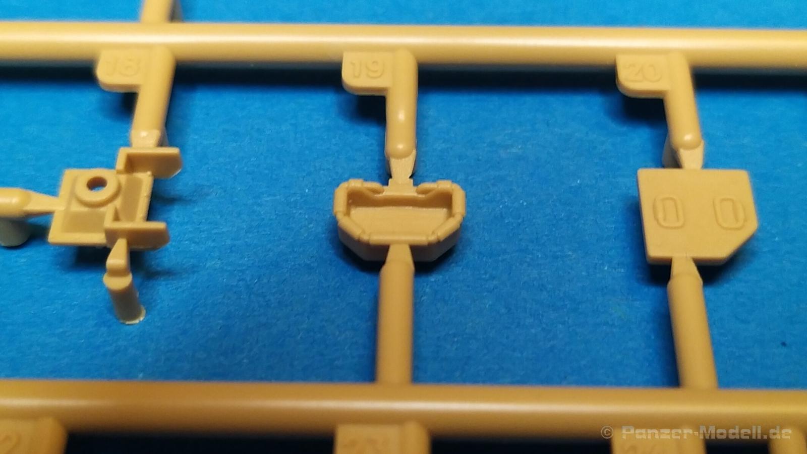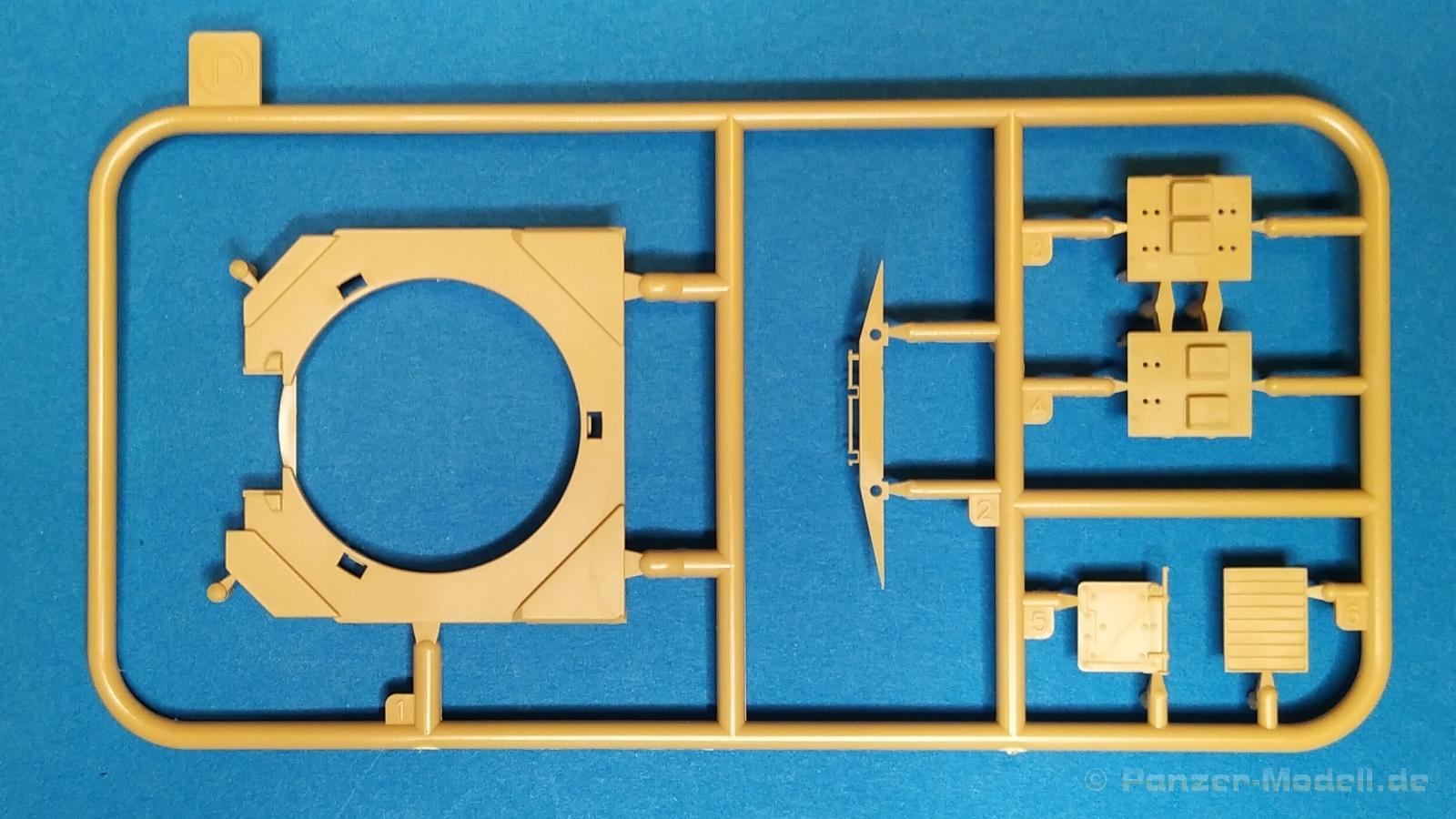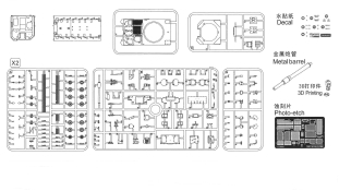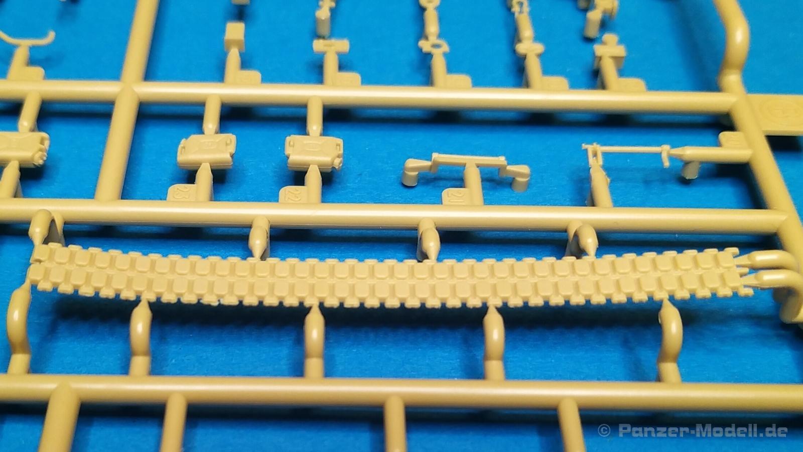 Auf den ersten Blick überzeugen die Detailierung und Gravierung der einzelnen Bauteile. Die Aufteilung der Spritzlinge und die Angüsse sind sinnvoll gewählt, so dass man die Teile gut finden und auch leicht abtrennen kann. Auswerfermarken gibt es nur an später nicht sichtbaren Stellen, wie z.B. im Bereich der Innenseite der Kettensegmente. Diese müssten aber von den Laufrollen verdeckt werden. Kleine Grate / Fischhäute sind hier und da an den Endverbindern der Ketten zu finden. Mit einem scharfen Skalpell dürfte aber auch hier schnell Abhilfe geschaffen werden. Der Einsatz von Fotoätzteilen ist bei diesem Bausatz nur auf das nötigste bzw. sinnvollste beschränkt. Sie sind allerdings nicht optional zu Plastikteilen zu verwenden, sondern werden immer zum Bau benötigt. Unter anderem gilt es hier die Schmutzfänger und seitlichen Schürzen an der Wanne, sowie das Gittermaterial für die seitlichen Staukörbe am Turm aus diesem Material zu verarbeiten. Das dürfte aber nicht schwierig werden, da dazu nichts gebogen, sondern alle Teile plan angebracht werden müssen. Zu den an sich schon guten Spritzgussteilen des Rohres und der Mündungsbremse gibt es als Alternativteile ein gedrehtes Alurohr und ein 3D Druckteil. Auch zwei Wasserkanister sind noch als Ergänzung im 3D-Druck vorhanden. Vorab sei zu der Bauanleitung angemerkt, dass sich ein Fehler in der Übersicht der Spritzlinge eingeschlichen hat. In den jeweiligen Baustufen ist dies aber wieder korrekt, so dass man die Teile finden kann. In der kleinen, aber übersichtlichen Bauanleitung finden sich Hinweise in englischer und chinesischer Sprache. Auf der ersten Seite findet man eine Übersicht der Bausatzbestandteile, gefolgt von allgemeinen Arbeits- und Sicherheitshinweisen. Nun folgt die eigentliche Bauanleitung, die sich in 20 Baustufen gliedert. Hier wird pro Baustufe anhand von schwarz-weißen 3D-Zeichnungen Schritt für Schritt der Weg zum fertigen Modell dargestellt bzw. erklärt. Den Anfang macht die Montage der Laufrollen, Treibräder und Spannrollen, die dann in Baustufe 2 an der Unterwanne angebracht werden sollen. Dazu sind die Schwingarme bereit mit angegossen, was eine korrekte Ausrichtung erleichtert. In Baustufe 3 werden die Segment- bzw. Einzelkettenglieder angebracht. Hier wurde erfreulicherweise auch an den Kettendurchhang im oberen Bereich gedacht und dieses in einem durchgehenden Segment berücksichtigt. Die Baustufen 4 bis 6 widmen sich der weiteren Montage der Wanne. Hier kann man z.B. wählen ob man die Rohrzurrung aufgerichtet oder abgeklappt anbringen möchte, genauso wie die Position des „Fahrererkers“. Die Fahrerluke kann man erfreulicherweise auch offen oder geschlossen anbringen. In Baustufe 7 muss man sich für eine von zwei möglichen Waffenstationen bzw. Lafettierungen des Kommandanten-MG´s entscheiden. Dazu sind auch verschiedene Vorbereitungen an der Turmoberseite zu treffen. Die eigentliche Montage des Turms beginnt in Baustufe 8 und zieht sich nach diversen Anbauten bis Baustufe 15. Wenn man beim Bau des Rohrlagers vorsichtig mit Klebstoff umgeht bleibt das Rohr später in der Höhe beweglich. Auch die Kommandantenluke kann hier offen oder geschlossen angebracht werden. Dann wird in Baustufe 16 wieder auf die Wanne umgeschwenkt. Dort gilt es die Wannenrückseite mit der offen oder geschlossenen darstellbaren Zugangstür weiter zu detaillieren und Heißösen und Schürzen zu montieren. Baustufe 18 befasst sich mit dem Bau der seitlichen Turmstaukörbe und deren Anbringung in Baustufe 19. Hier kann man sich für eine von zwei Optionen entscheiden. Die letzte Baustufe zeigt das Anbringen des zuvor fertig gestellten Turmes auf der fertigen Wanne. Am Ende der Bauanleitung finden sich dann die Bemalungs- und Markierungsvorschläge, die leider nicht farbig ausgeführt sind. Außerdem sind hier Farbangaben in tabellarischer Form für die Hersteller GSI, Tamiya und Vallejo aufgeführt. Folgende Markierungs- bzw. Bemalungsvarianten werden gezeigt: