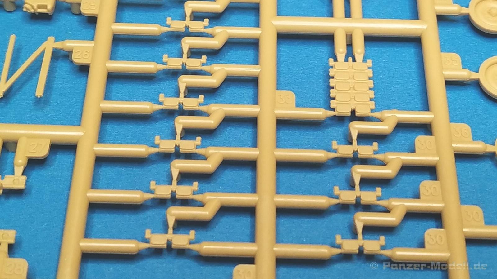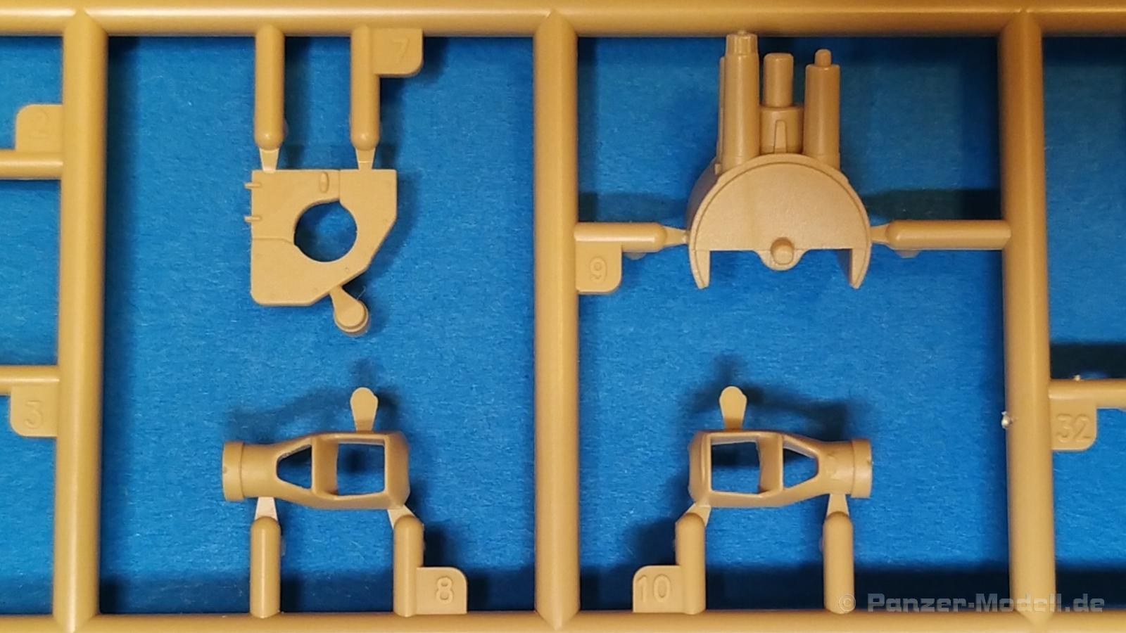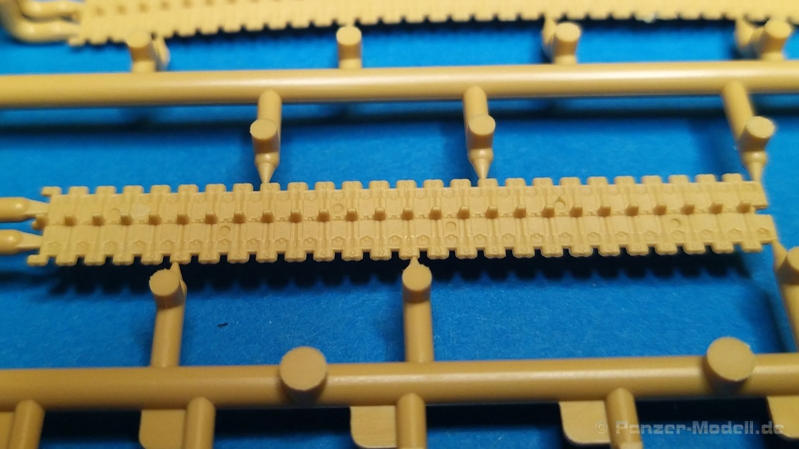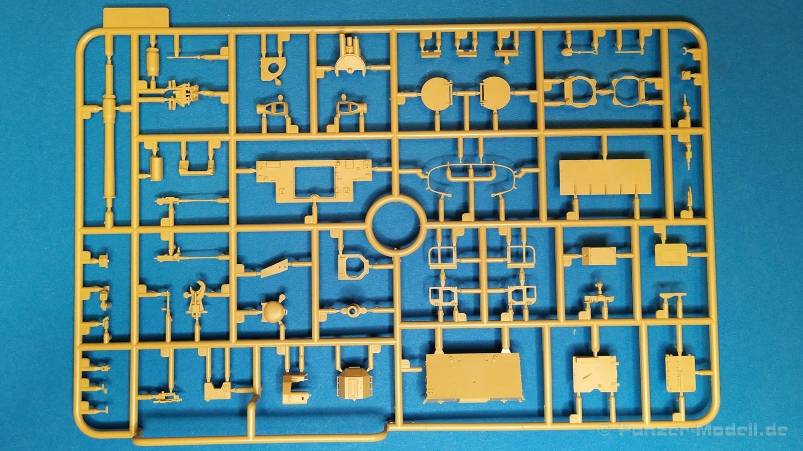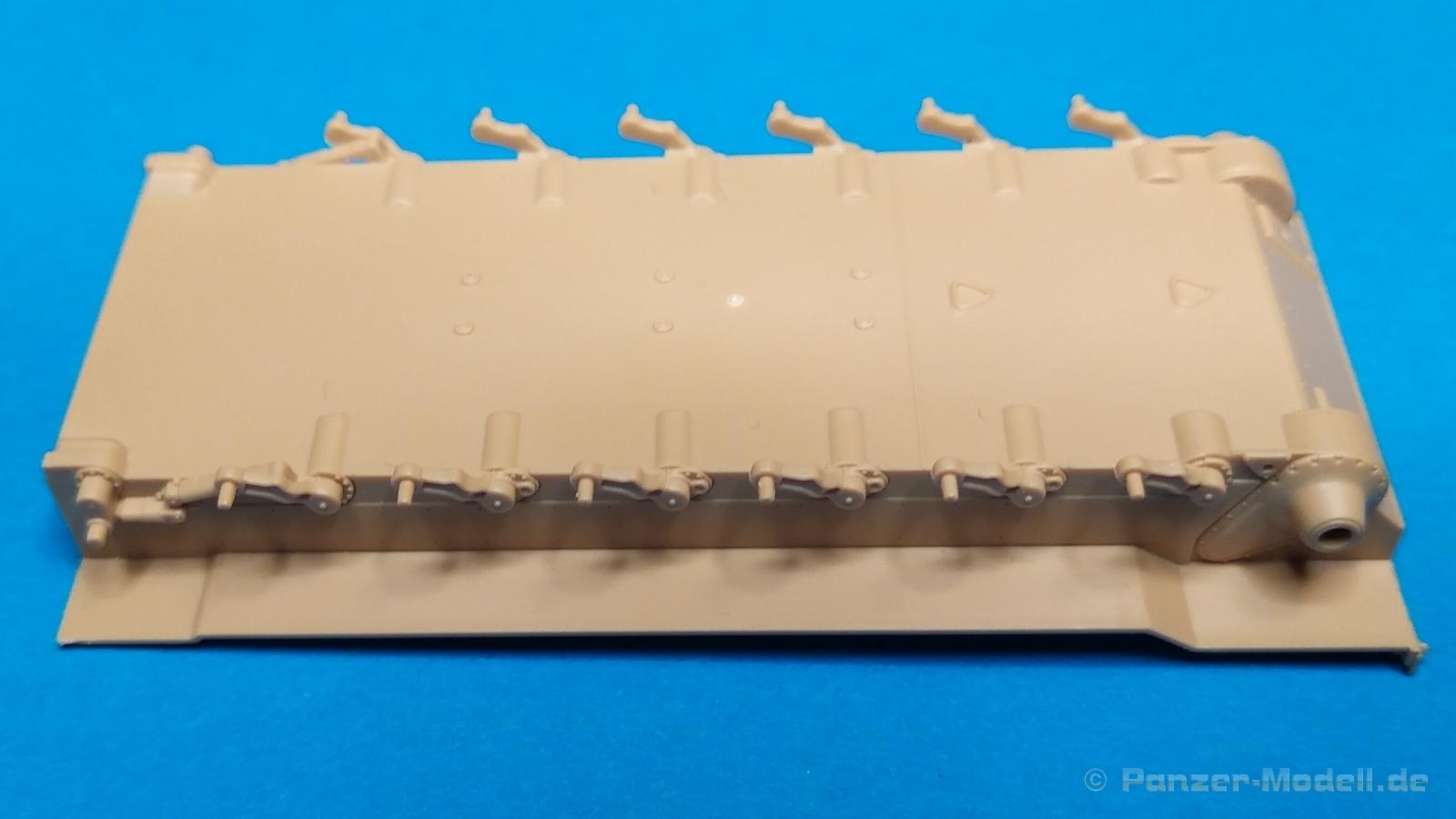 Auf den ersten Blick überzeugen die Detailierung und Gravierung der einzelnen Bauteile. Die Aufteilung der Spritzlinge und die Angüsse sind sinnvoll gewählt, so dass man die Teile gut finden und auch leicht abtrennen kann. Auswerfermarken gibt es nur an später nicht sichtbaren Stellen, wie z.B. im Bereich der Innenseite der Kettensegmente. Diese müssten aber von den Laufrollen verdeckt werden. Kleine Grate / Fischhäute sind hier und da an den Endverbindern der Ketten zu finden. Mit einem scharfen Skalpell dürfte aber auch hier schnell Abhilfe geschaffen werden. Der Einsatz von Fotoätzteilen ist bei diesem Bausatz nur auf das nötigste bzw. sinnvollste beschränkt. Sie sind allerdings nicht optional zu Plastikteilen zu verwenden, sondern werden immer zum Bau benötigt. Unter anderem gilt es hier die Schmutzfänger und seitlichen Schürzen an der Wanne, sowie das Gittermaterial für die seitlichen Staukörbe am Turm aus diesem Material zu verarbeiten. Das dürfte aber nicht schwierig werden, da dazu nichts gebogen, sondern alle Teile plan angebracht werden müssen. Zu den an sich schon guten Spritzgussteilen des Rohres und der Mündungsbremse gibt es als Alternativteile ein gedrehtes Alurohr und ein 3D Druckteil. Auch zwei Wasserkanister sind noch als Ergänzung im 3D-Druck vorhanden. Vorab sei zu der Bauanleitung angemerkt, dass sich ein Fehler in der Übersicht der Spritzlinge eingeschlichen hat. In den jeweiligen Baustufen ist dies aber wieder korrekt, so dass man die Teile finden kann. In der kleinen, aber übersichtlichen Bauanleitung finden sich Hinweise in englischer und chinesischer Sprache. Auf der ersten Seite findet man eine Übersicht der Bausatzbestandteile, gefolgt von allgemeinen Arbeits- und Sicherheitshinweisen. Nun folgt die eigentliche Bauanleitung, die sich in 20 Baustufen gliedert. Hier wird pro Baustufe anhand von schwarz-weißen 3D-Zeichnungen Schritt für Schritt der Weg zum fertigen Modell dargestellt bzw. erklärt. Den Anfang macht die Montage der Laufrollen, Treibräder und Spannrollen, die dann in Baustufe 2 an der Unterwanne angebracht werden sollen. Dazu sind die Schwingarme bereit mit angegossen, was eine korrekte Ausrichtung erleichtert. In Baustufe 3 werden die Segment- bzw. Einzelkettenglieder angebracht. Hier wurde erfreulicherweise auch an den Kettendurchhang im oberen Bereich gedacht und dieses in einem durchgehenden Segment berücksichtigt. Die Baustufen 4 bis 6 widmen sich der weiteren Montage der Wanne. Hier kann man z.B. wählen ob man die Rohrzurrung aufgerichtet oder abgeklappt anbringen möchte, genauso wie die Position des „Fahrererkers“. Die Fahrerluke kann man erfreulicherweise auch offen oder geschlossen anbringen. In Baustufe 7 muss man sich für eine von zwei möglichen Waffenstationen bzw. Lafettierungen des Kommandanten-MG´s entscheiden. Dazu sind auch verschiedene Vorbereitungen an der Turmoberseite zu treffen. Die eigentliche Montage des Turms beginnt in Baustufe 8 und zieht sich nach diversen Anbauten bis Baustufe 15. Wenn man beim Bau des Rohrlagers vorsichtig mit Klebstoff umgeht bleibt das Rohr später in der Höhe beweglich. Auch die Kommandantenluke kann hier offen oder geschlossen angebracht werden. Dann wird in Baustufe 16 wieder auf die Wanne umgeschwenkt. Dort gilt es die Wannenrückseite mit der offen oder geschlossenen darstellbaren Zugangstür weiter zu detaillieren und Heißösen und Schürzen zu montieren. Baustufe 18 befasst sich mit dem Bau der seitlichen Turmstaukörbe und deren Anbringung in Baustufe 19. Hier kann man sich für eine von zwei Optionen entscheiden. Die letzte Baustufe zeigt das Anbringen des zuvor fertig gestellten Turmes auf der fertigen Wanne. Am Ende der Bauanleitung finden sich dann die Bemalungs- und Markierungsvorschläge, die leider nicht farbig ausgeführt sind. Außerdem sind hier Farbangaben in tabellarischer Form für die Hersteller GSI, Tamiya und Vallejo aufgeführt. Folgende Markierungs- bzw. Bemalungsvarianten werden gezeigt: