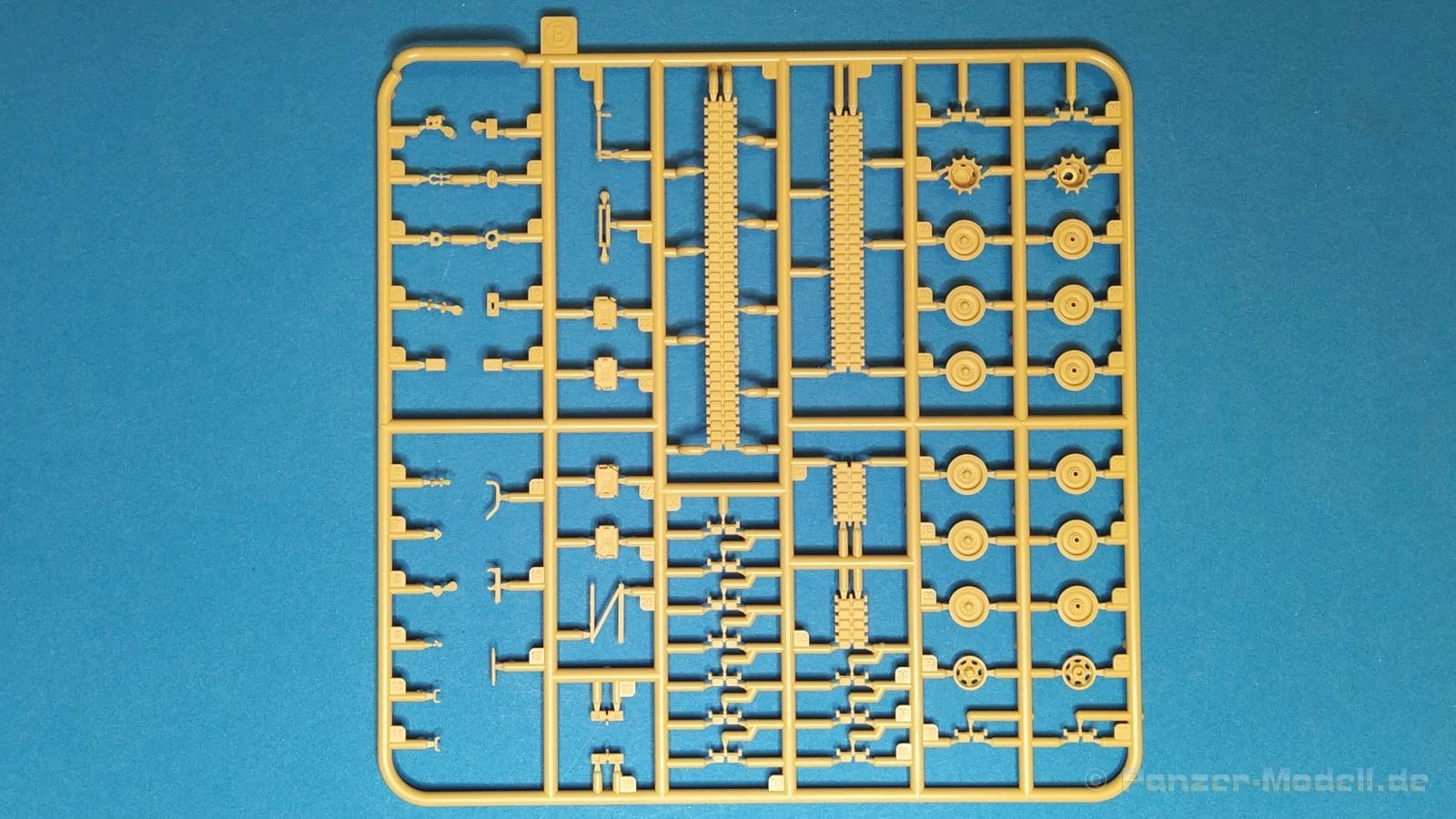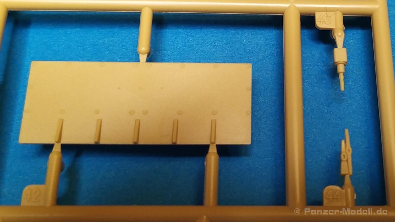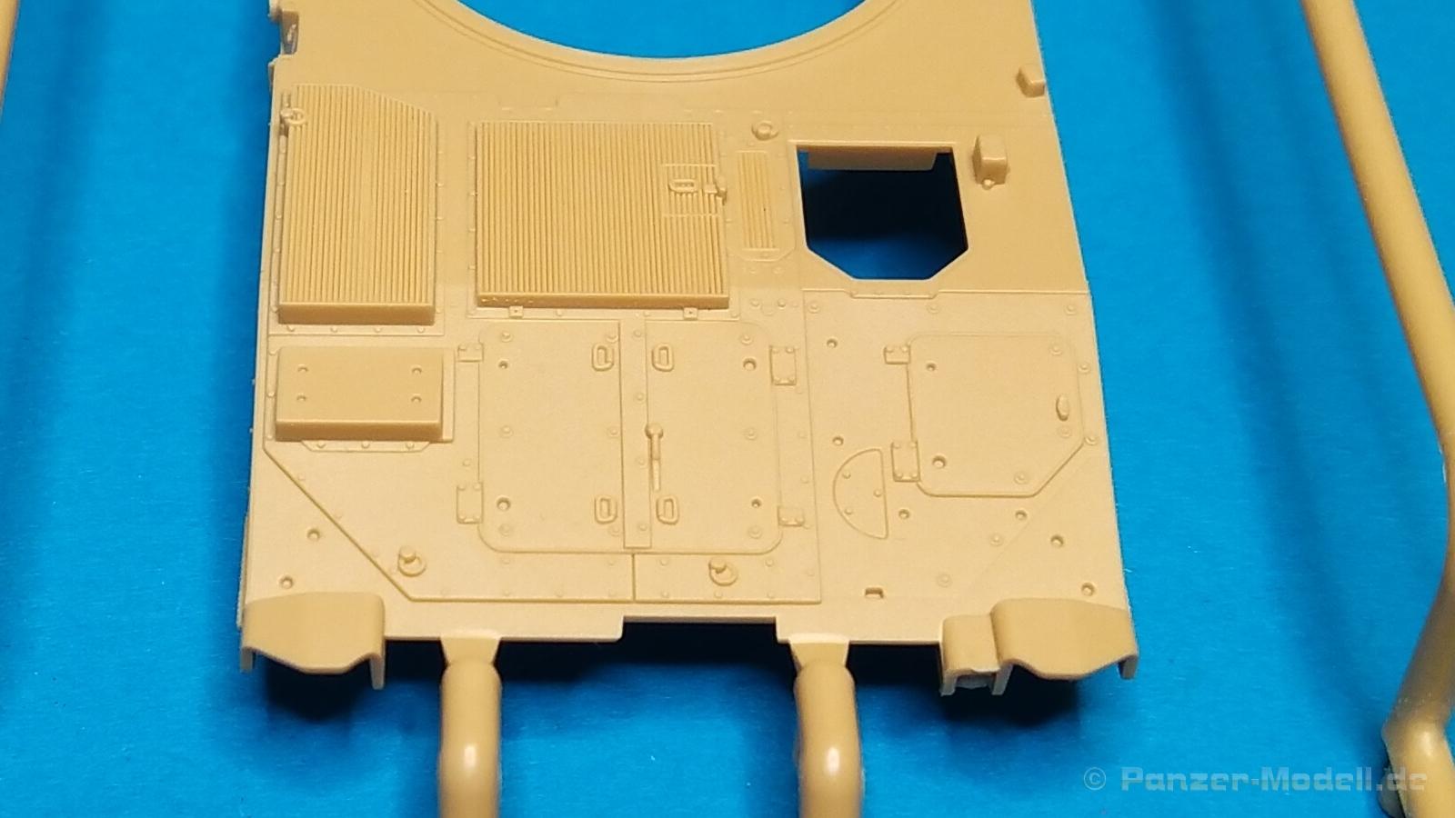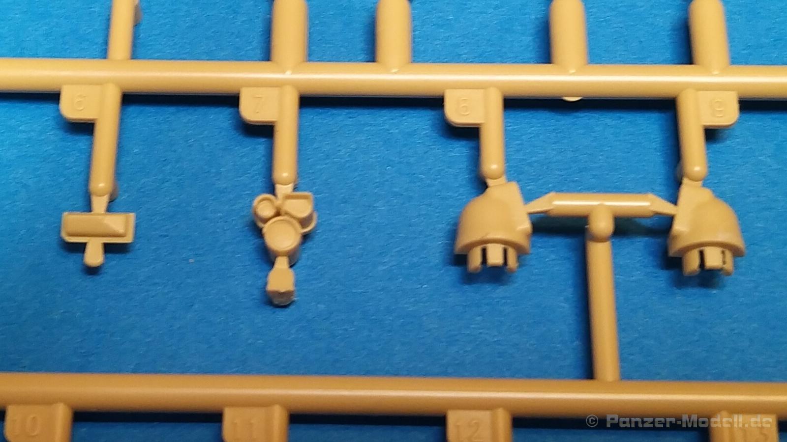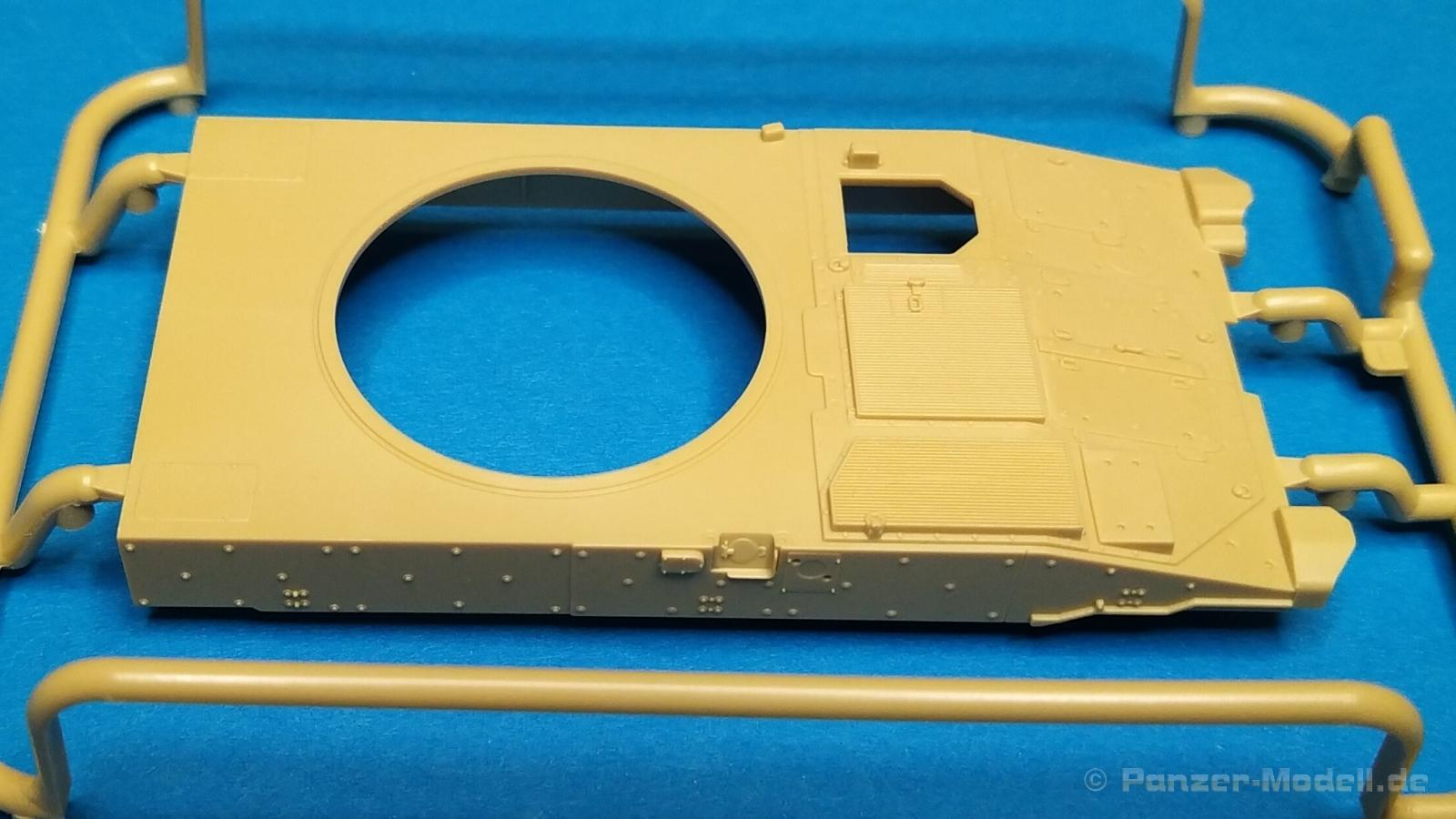 Auf den ersten Blick überzeugen die Detailierung und Gravierung der einzelnen Bauteile. Die Aufteilung der Spritzlinge und die Angüsse sind sinnvoll gewählt, so dass man die Teile gut finden und auch leicht abtrennen kann. Auswerfermarken gibt es nur an später nicht sichtbaren Stellen, wie z.B. im Bereich der Innenseite der Kettensegmente. Diese müssten aber von den Laufrollen verdeckt werden. Kleine Grate / Fischhäute sind hier und da an den Endverbindern der Ketten zu finden. Mit einem scharfen Skalpell dürfte aber auch hier schnell Abhilfe geschaffen werden. Der Einsatz von Fotoätzteilen ist bei diesem Bausatz nur auf das nötigste bzw. sinnvollste beschränkt. Sie sind allerdings nicht optional zu Plastikteilen zu verwenden, sondern werden immer zum Bau benötigt. Unter anderem gilt es hier die Schmutzfänger und seitlichen Schürzen an der Wanne, sowie das Gittermaterial für die seitlichen Staukörbe am Turm aus diesem Material zu verarbeiten. Das dürfte aber nicht schwierig werden, da dazu nichts gebogen, sondern alle Teile plan angebracht werden müssen. Zu den an sich schon guten Spritzgussteilen des Rohres und der Mündungsbremse gibt es als Alternativteile ein gedrehtes Alurohr und ein 3D Druckteil. Auch zwei Wasserkanister sind noch als Ergänzung im 3D-Druck vorhanden. Vorab sei zu der Bauanleitung angemerkt, dass sich ein Fehler in der Übersicht der Spritzlinge eingeschlichen hat. In den jeweiligen Baustufen ist dies aber wieder korrekt, so dass man die Teile finden kann. In der kleinen, aber übersichtlichen Bauanleitung finden sich Hinweise in englischer und chinesischer Sprache. Auf der ersten Seite findet man eine Übersicht der Bausatzbestandteile, gefolgt von allgemeinen Arbeits- und Sicherheitshinweisen. Nun folgt die eigentliche Bauanleitung, die sich in 20 Baustufen gliedert. Hier wird pro Baustufe anhand von schwarz-weißen 3D-Zeichnungen Schritt für Schritt der Weg zum fertigen Modell dargestellt bzw. erklärt. Den Anfang macht die Montage der Laufrollen, Treibräder und Spannrollen, die dann in Baustufe 2 an der Unterwanne angebracht werden sollen. Dazu sind die Schwingarme bereit mit angegossen, was eine korrekte Ausrichtung erleichtert. In Baustufe 3 werden die Segment- bzw. Einzelkettenglieder angebracht. Hier wurde erfreulicherweise auch an den Kettendurchhang im oberen Bereich gedacht und dieses in einem durchgehenden Segment berücksichtigt. Die Baustufen 4 bis 6 widmen sich der weiteren Montage der Wanne. Hier kann man z.B. wählen ob man die Rohrzurrung aufgerichtet oder abgeklappt anbringen möchte, genauso wie die Position des „Fahrererkers“. Die Fahrerluke kann man erfreulicherweise auch offen oder geschlossen anbringen. In Baustufe 7 muss man sich für eine von zwei möglichen Waffenstationen bzw. Lafettierungen des Kommandanten-MG´s entscheiden. Dazu sind auch verschiedene Vorbereitungen an der Turmoberseite zu treffen. Die eigentliche Montage des Turms beginnt in Baustufe 8 und zieht sich nach diversen Anbauten bis Baustufe 15. Wenn man beim Bau des Rohrlagers vorsichtig mit Klebstoff umgeht bleibt das Rohr später in der Höhe beweglich. Auch die Kommandantenluke kann hier offen oder geschlossen angebracht werden. Dann wird in Baustufe 16 wieder auf die Wanne umgeschwenkt. Dort gilt es die Wannenrückseite mit der offen oder geschlossenen darstellbaren Zugangstür weiter zu detaillieren und Heißösen und Schürzen zu montieren. Baustufe 18 befasst sich mit dem Bau der seitlichen Turmstaukörbe und deren Anbringung in Baustufe 19. Hier kann man sich für eine von zwei Optionen entscheiden. Die letzte Baustufe zeigt das Anbringen des zuvor fertig gestellten Turmes auf der fertigen Wanne. Am Ende der Bauanleitung finden sich dann die Bemalungs- und Markierungsvorschläge, die leider nicht farbig ausgeführt sind. Außerdem sind hier Farbangaben in tabellarischer Form für die Hersteller GSI, Tamiya und Vallejo aufgeführt. Folgende Markierungs- bzw. Bemalungsvarianten werden gezeigt: