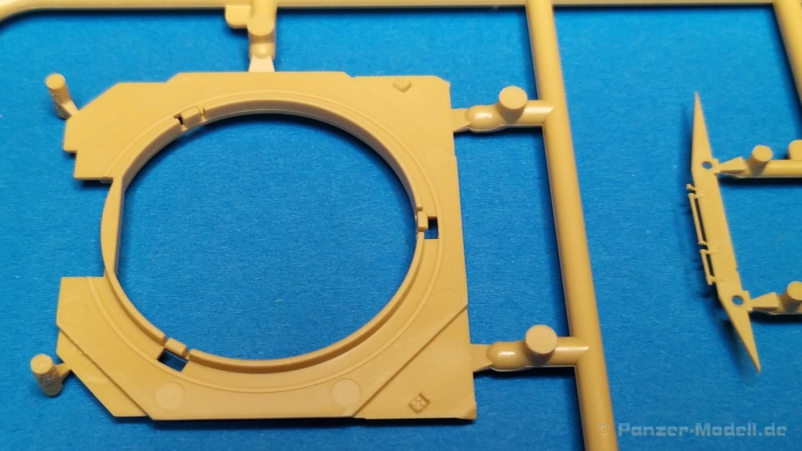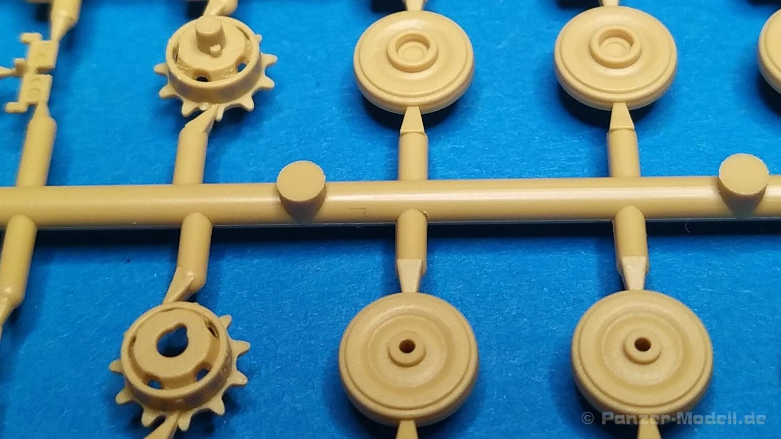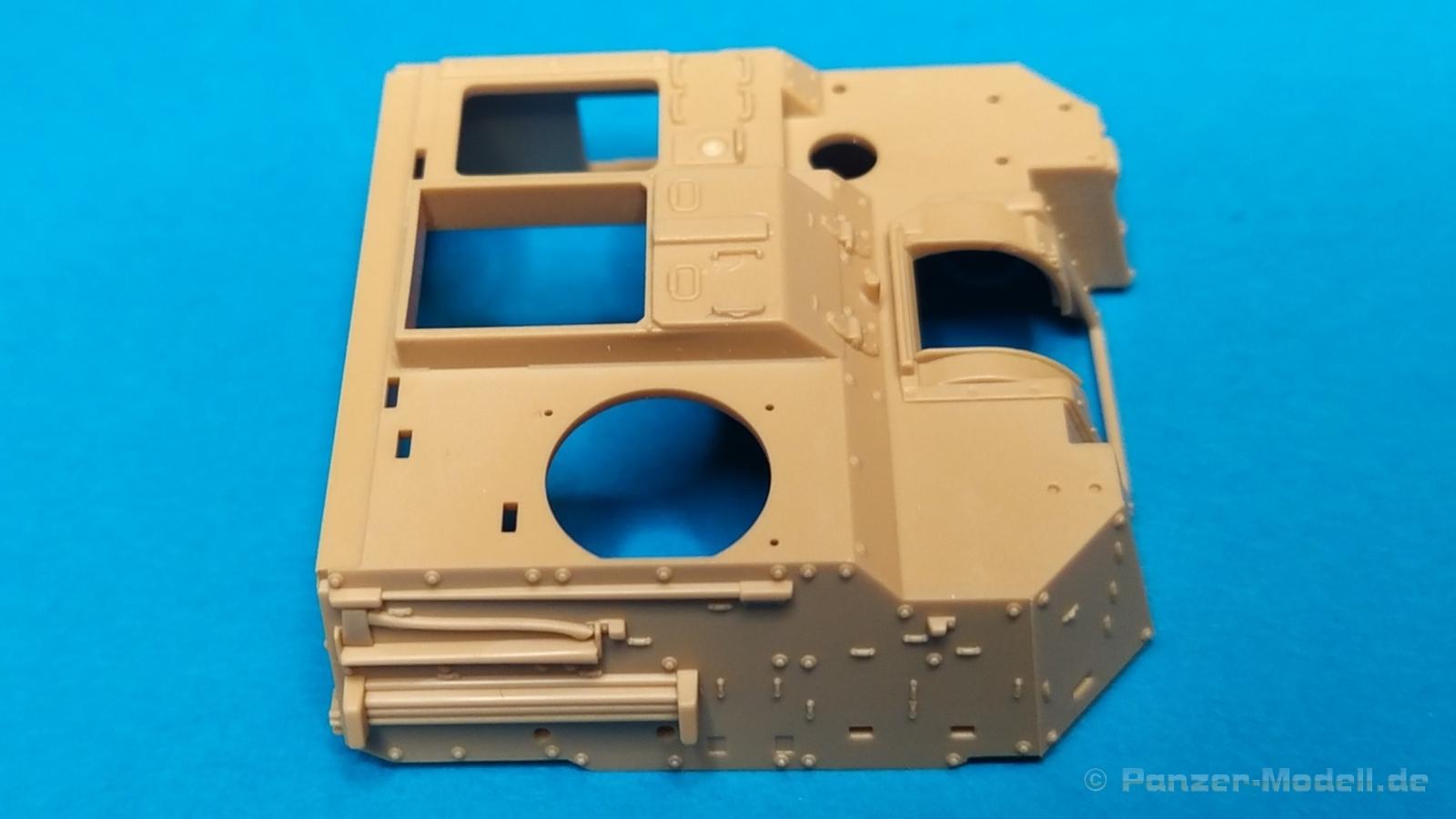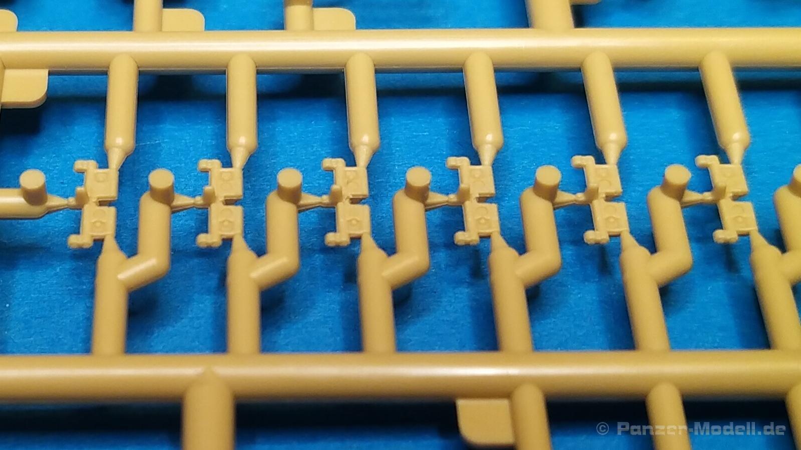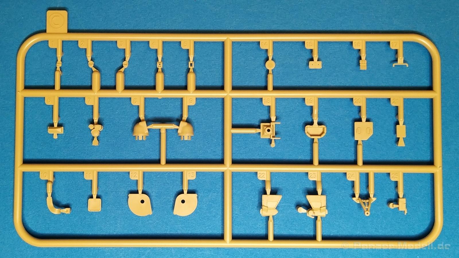Auf den ersten Blick überzeugen die Detailierung und Gravierung der einzelnen Bauteile. Die Aufteilung der Spritzlinge und die Angüsse sind sinnvoll gewählt, so dass man die Teile gut finden und auch leicht abtrennen kann. Auswerfermarken gibt es nur an später nicht sichtbaren Stellen, wie z.B. im Bereich der Innenseite der Kettensegmente. Diese müssten aber von den Laufrollen verdeckt werden. Kleine Grate / Fischhäute sind hier und da an den Endverbindern der Ketten zu finden. Mit einem scharfen Skalpell dürfte aber auch hier schnell Abhilfe geschaffen werden. Der Einsatz von Fotoätzteilen ist bei diesem Bausatz nur auf das nötigste bzw. sinnvollste beschränkt. Sie sind allerdings nicht optional zu Plastikteilen zu verwenden, sondern werden immer zum Bau benötigt. Unter anderem gilt es hier die Schmutzfänger und seitlichen Schürzen an der Wanne, sowie das Gittermaterial für die seitlichen Staukörbe am Turm aus diesem Material zu verarbeiten. Das dürfte aber nicht schwierig werden, da dazu nichts gebogen, sondern alle Teile plan angebracht werden müssen. Zu den an sich schon guten Spritzgussteilen des Rohres und der Mündungsbremse gibt es als Alternativteile ein gedrehtes Alurohr und ein 3D Druckteil. Auch zwei Wasserkanister sind noch als Ergänzung im 3D-Druck vorhanden. Vorab sei zu der Bauanleitung angemerkt, dass sich ein Fehler in der Übersicht der Spritzlinge eingeschlichen hat. In den jeweiligen Baustufen ist dies aber wieder korrekt, so dass man die Teile finden kann. In der kleinen, aber übersichtlichen Bauanleitung finden sich Hinweise in englischer und chinesischer Sprache. Auf der ersten Seite findet man eine Übersicht der Bausatzbestandteile, gefolgt von allgemeinen Arbeits- und Sicherheitshinweisen. Nun folgt die eigentliche Bauanleitung, die sich in 20 Baustufen gliedert. Hier wird pro Baustufe anhand von schwarz-weißen 3D-Zeichnungen Schritt für Schritt der Weg zum fertigen Modell dargestellt bzw. erklärt. Den Anfang macht die Montage der Laufrollen, Treibräder und Spannrollen, die dann in Baustufe 2 an der Unterwanne angebracht werden sollen. Dazu sind die Schwingarme bereit mit angegossen, was eine korrekte Ausrichtung erleichtert. In Baustufe 3 werden die Segment- bzw. Einzelkettenglieder angebracht. Hier wurde erfreulicherweise auch an den Kettendurchhang im oberen Bereich gedacht und dieses in einem durchgehenden Segment berücksichtigt. Die Baustufen 4 bis 6 widmen sich der weiteren Montage der Wanne. Hier kann man z.B. wählen ob man die Rohrzurrung aufgerichtet oder abgeklappt anbringen möchte, genauso wie die Position des „Fahrererkers“. Die Fahrerluke kann man erfreulicherweise auch offen oder geschlossen anbringen. In Baustufe 7 muss man sich für eine von zwei möglichen Waffenstationen bzw. Lafettierungen des Kommandanten-MG´s entscheiden. Dazu sind auch verschiedene Vorbereitungen an der Turmoberseite zu treffen. Die eigentliche Montage des Turms beginnt in Baustufe 8 und zieht sich nach diversen Anbauten bis Baustufe 15. Wenn man beim Bau des Rohrlagers vorsichtig mit Klebstoff umgeht bleibt das Rohr später in der Höhe beweglich. Auch die Kommandantenluke kann hier offen oder geschlossen angebracht werden. Dann wird in Baustufe 16 wieder auf die Wanne umgeschwenkt. Dort gilt es die Wannenrückseite mit der offen oder geschlossenen darstellbaren Zugangstür weiter zu detaillieren und Heißösen und Schürzen zu montieren. Baustufe 18 befasst sich mit dem Bau der seitlichen Turmstaukörbe und deren Anbringung in Baustufe 19. Hier kann man sich für eine von zwei Optionen entscheiden. Die letzte Baustufe zeigt das Anbringen des zuvor fertig gestellten Turmes auf der fertigen Wanne. Am Ende der Bauanleitung finden sich dann die Bemalungs- und Markierungsvorschläge, die leider nicht farbig ausgeführt sind. Außerdem sind hier Farbangaben in tabellarischer Form für die Hersteller GSI, Tamiya und Vallejo aufgeführt. Folgende Markierungs- bzw. Bemalungsvarianten werden gezeigt: